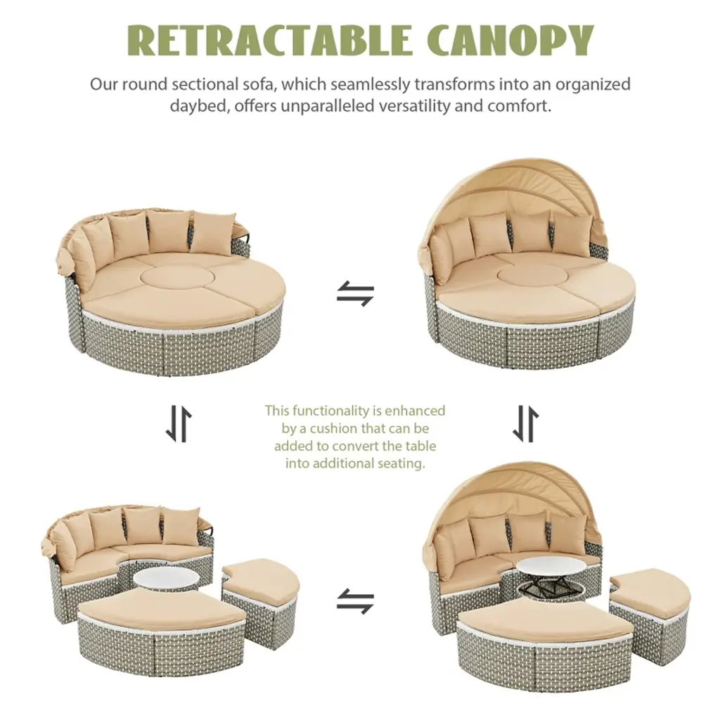 Transform your outdoor space with this beautifully designed round rattan daybed featuring a retractable canopy, adjustable coffee table, and plush cushions. Whether you're sunbathing, reading, or entertaining, this piece brings luxury, comfort, and versatility to your backyard, patio, or garden. Product Features All-Weather Elegance & Durability: Crafted with premium two-tone PE rattan woven over a powder-coated steel frame, this daybed is UV-resistant, water-resistant, and built to last through the seasons. The stylish weave adds a modern touch to any outdoor setting.Versatile Comfort with Retractable Canopy: Relax your way with a built-in canopy that can be easily extended or retracted and fastened with durable straps. Lounge in full sun or shade while enjoying the cozy, curved shape that encourages private relaxation or social gatherings.Adjustable Table with Hidden Seating: The central coffee table adjusts in height to meet your needs—ideal for drinks, snacks, or reading. Add the included cushion to convert it into extra seating when guests arrive.Ultimate Comfort & Easy Care: Includes 5 plush pillows and 5 thick cushions with button detailing. Washable cushion covers make maintenance easy, and adjustable feet keep the set stable on uneven surfaces. Highlights All-Weather PE Rattan & Powder-Coated Steel FrameRetractable Canopy with Secure StrapsModular Round Sectional Design with Adjustable TableWashable, Water-Resistant Cushion Covers5 Cozy Pillows & Cushions with Buttoned DetailsAdjustable Feet for StabilityAvailable in 2 Color Options Dimensions Overall Size: 66.5" L × 65" W × 53.5" HOttoman: 45.3" L × 20.9" W × 15.8" HCoffee Table: 22.4" L × 22.4" W × 15.8" H (adjusts up to 22.8" H) Weight & Capacity 2 Loveseats with Canopy: 41.9 lbs eachEach Ottoman: 13.6 lbsCoffee Table: 10.1 lbsWeight Capacity: 350 lbs per seat / 200 lbs table Materials Frame: SteelWicker: PE Rattan (Two-Tone)Fabric: Polyester (UV & Water-Resistant)Fill: High-Density Foam What’s Included 2 × Loveseat Sections with Canopy2 × Ottomans1 × Adjustable Coffee Table5 × Cushions5 × Pillows Assembly & Maintenance Assembly Required: Yes (All tools included)Easy Care: Clean with a mild soap solution, rinse with water, and dry fully. Wash covers as needed.Protective Tips: Use furniture covers or store indoors during prolonged bad weather for extended durability. Additional Details Warranty: Please refer to return policyShipping: Ships in 3 boxes (may arrive separately) Bring modern sophistication and unmatched comfort to your outdoor retreat with this multi-functional rattan daybed. Whether used as a cozy personal lounger or a social hub, it’s the ultimate statement in outdoor elegance.
