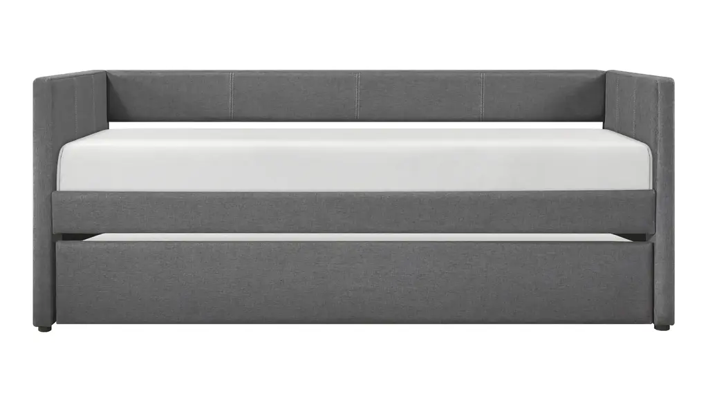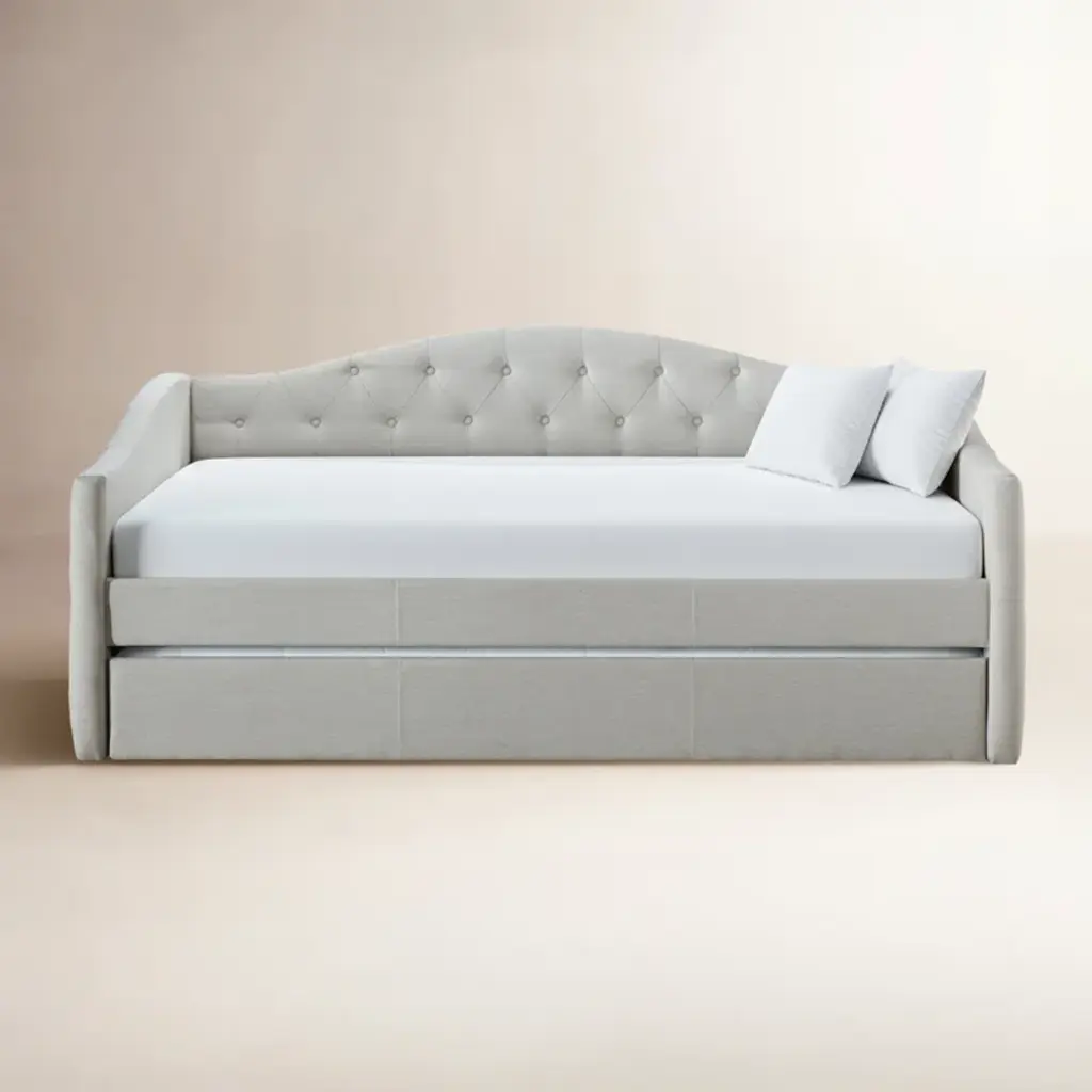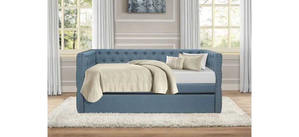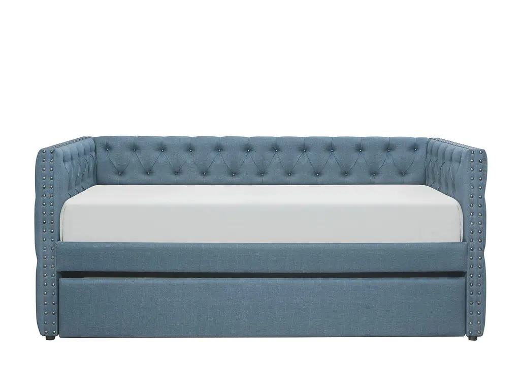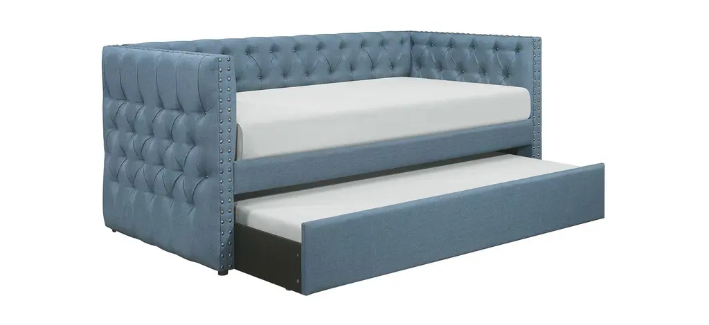 A classic look is offered to meet the sleep and relaxation needs of your household with the Farrah Daybed with Trundle. The covered in blue fabric, the profile of the daybed is defined by double nail head accenting while the interior and exterior panels feature button tufting that lends to the modern traditional styling of the group. The accompanying the under-bed trundle pulls out to accommodate your additional sleep space needs.