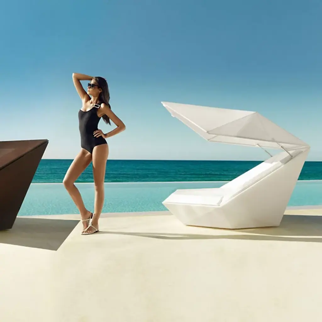 With the Vondom Faz Outdoor Daybed with Parasol, get all the fresh air and relaxation you need without all the sun you don't. The lounger itself is an angular piece that's made out of matte white polyethylene and lined with plush yet crisply tailored vinyl-upholstered cushions. Above, an adjustable translucent Batyline shade protects you from harsh UV rays...and completes the design's oversized clamshell look.