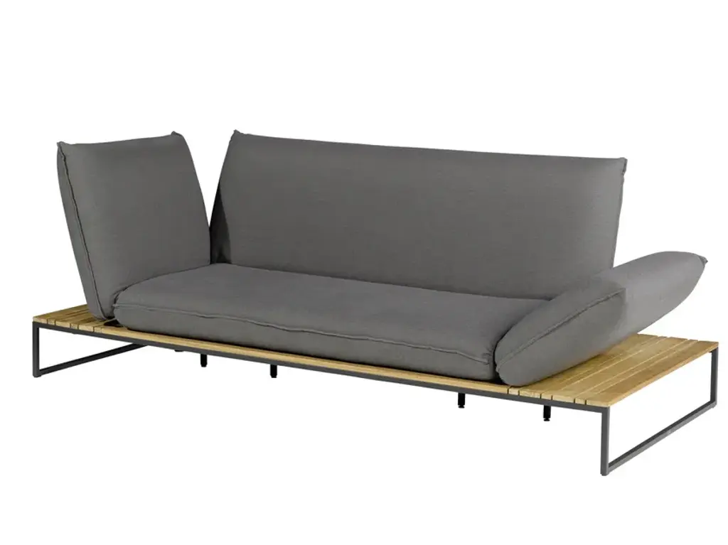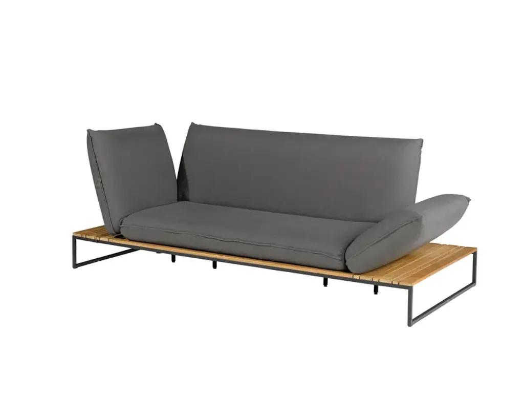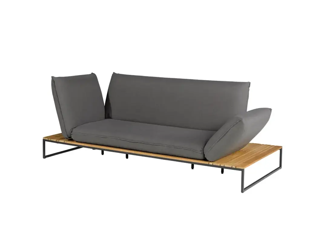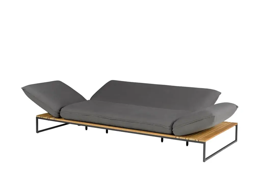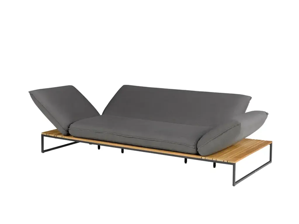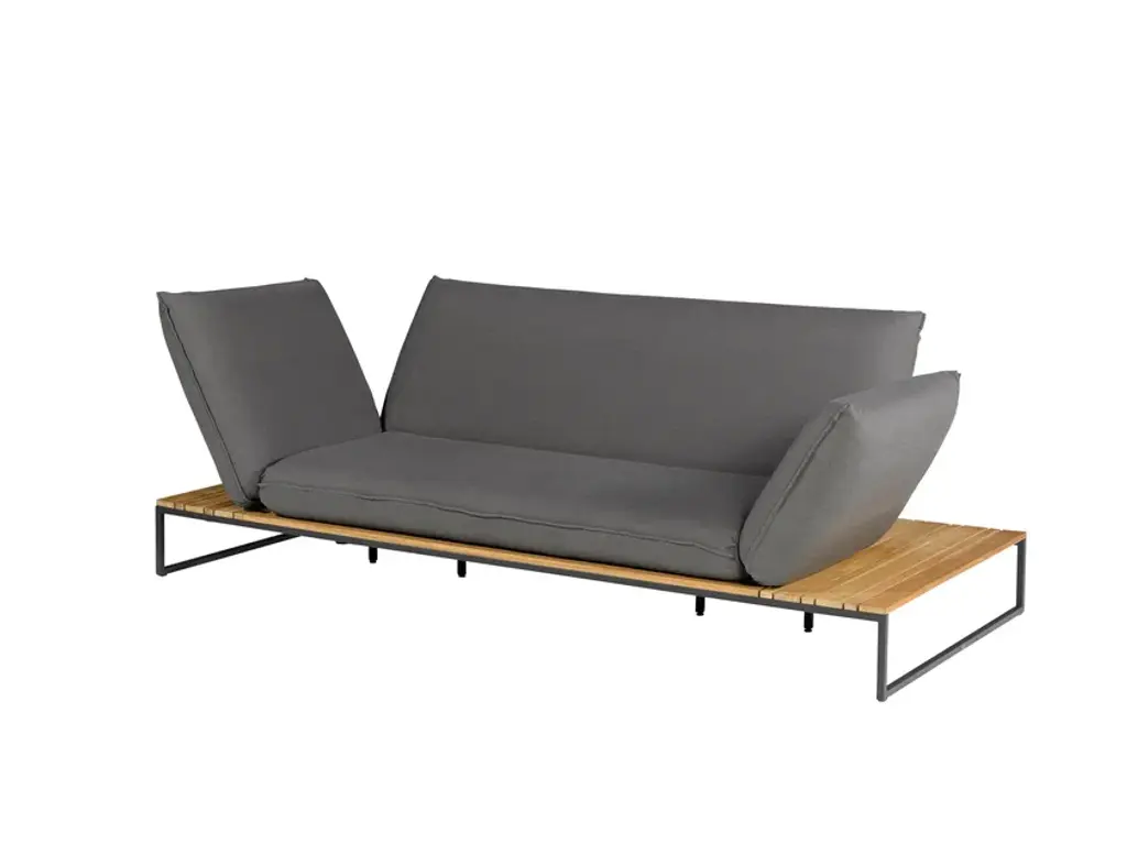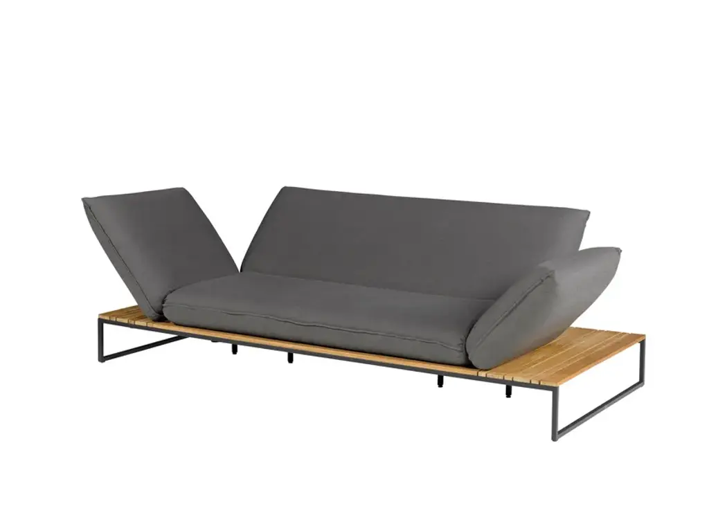 This fascinating and functional lounge with its multi-adjustable arm and backrests makes for a particularly cozy outdoor area. With just a few simple steps, you can create the ideal seating and reclining landscape by folding down incomparable comfort. You can put together your sofa or lounge individually with two armrests of different heights, as Single sofa or as a corner set. For the platform we offer teak strips or 2 different decor from fm-laminat. For planninmg the fischer möbel online planner is very helpfull. Matching side tables, upholstered benches and adjoining tables also offer sufficient storage space and almost endless combination options. Fold down the backrest with many grids.The functional lounge system Flora with its adjustable backrest and side parts turns the outdoor area into a cosy haven. Side tables, upholstery benches and add-on tables offer many shelf surfaces and almost endless combination possibilities. Recreative, upright sitting and relaxing with your feet up – both is made possible with Flora lounge. With just a few hand movements, the sofa turns into a relaxing daybed. Like a flower that opens up, the raised side parts and beack rest can be folded down with many positions. Functionality and design convincing equally with the weatherproof fabrics, stainless steel powder coated and the platform in three different versions. Whether warm teak wood as a unique combination of the material mix or fm-laminate tops in two different colors as easy-care and robust material. Premium Quality Made in Germany