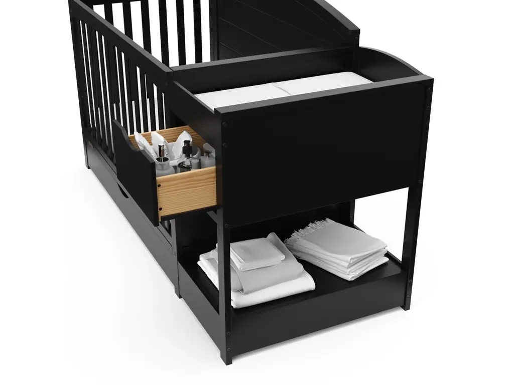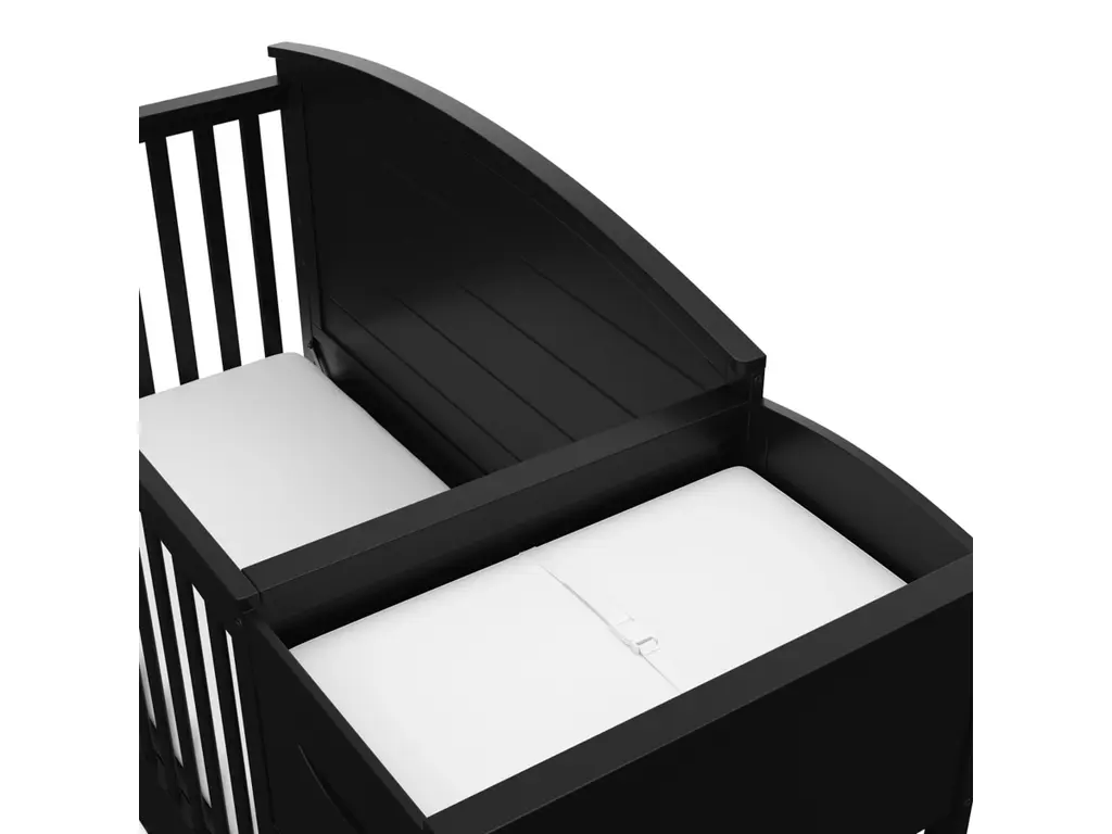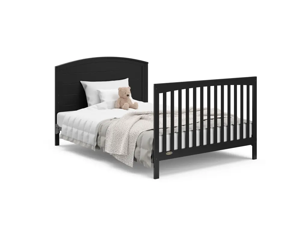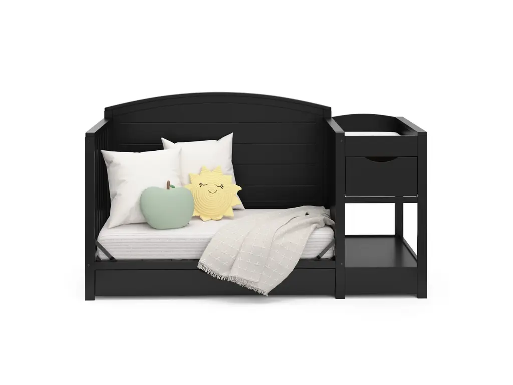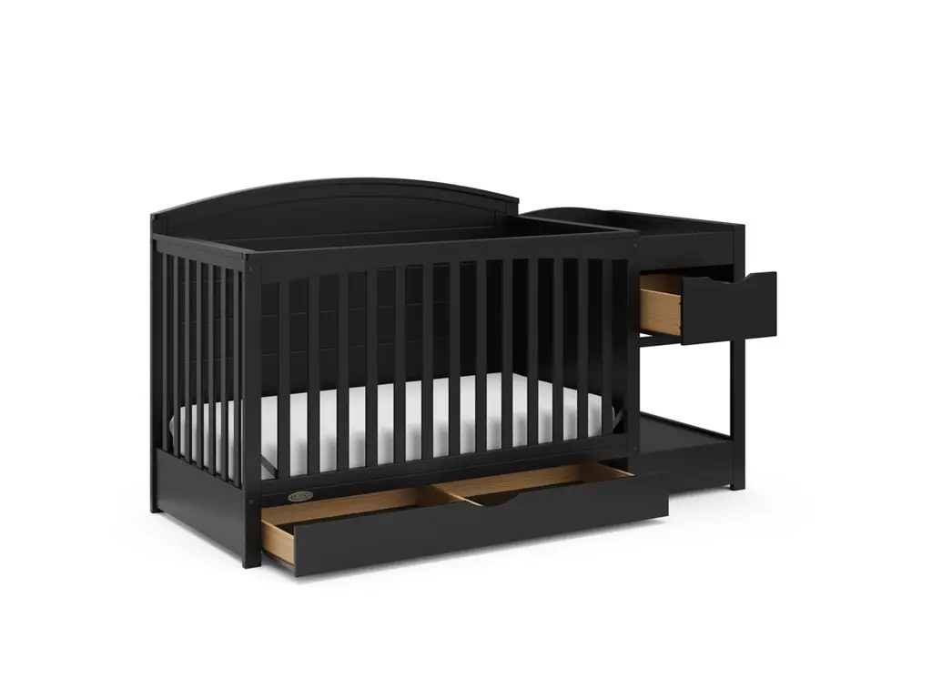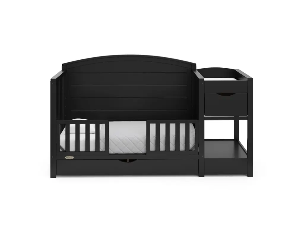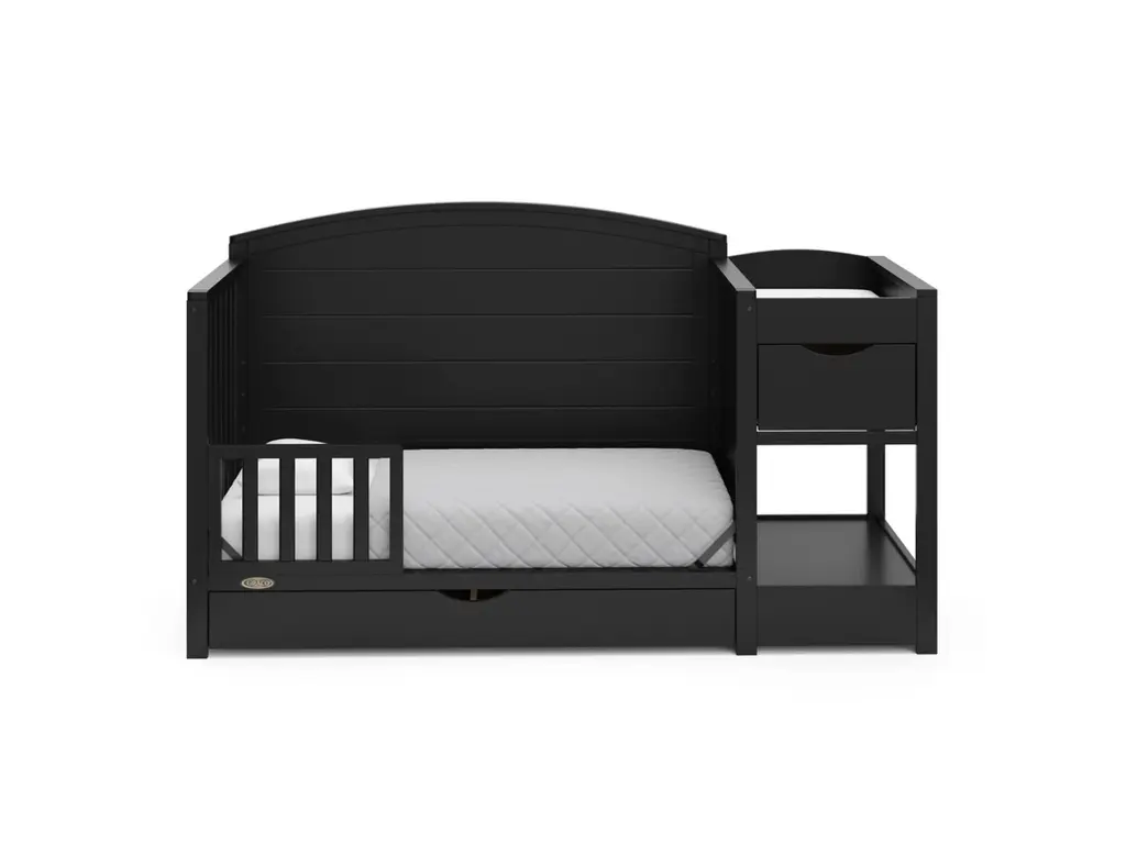 Bring your dream nursery to life with our Graco Bellwood 5-in-1 Convertible Crib & Changer with Drawer. The Bellwood is complete with an attached changing table, including a water-resistant changing pad, an extra nursery drawer, and a large open space for flexible storage. For customizable style to match any nursery, the Bellwood features a reversible headboard: one side of the headboard is smooth for a more modern look, while the other side of the headboard has horizontal shiplap detailing for a more classic look. For extra nursery storage, the Bellwood also features a spacious under-crib drawer. The Graco Bellwood 5-in-1 Convertible Crib & Changer with Drawer is crafted from pine wood, engineered wood and wood composites, and includes Euro drawer glides, and its applied finish has been tested to meet or exceed the applicable ASTM and CPSIA safety standards. The Bellwood is JPMA Certified, meaning it's been expert tested by third-party, accredited laboratories to meet or exceed all of the applicable category voluntary and mandatory safety standards. Designed to adapt to your growing baby, the Bellwood is equipped with an adjustable mattress support base with 4 different height options, meaning, the Bellwood's mattress support base can be lowered as your child grows [please note, this crib may only be used until your child can easily climb out or is taller than 35 inches (89 cm)]. To support your child's journey from babyhood through childhood, the Bellwood is able to be converted from a crib to a toddler bed (compatible toddler guardrail sold separately), daybed, and full-size bed with headboard and optional footboard (compatible full-size bed conversion kit sold separately). The Graco Bellwood 5-in-1 Convertible Crib & Changer with Drawer is designed to accommodate any standard full-size crib & toddler mattress (mattress sold separately, we recommend any Graco crib mattress). Graco is the proud recipient of the Parent Tested Parent Approved (PTPA) Seal of Approval for nursery and children's bedroom furniture, 2023 PTPA Top Product Award, and the 2021-2023 Women's Choice Award for 9 out of 10 Recommended Baby & Kids Furniture. Backed by a 1-year limited manufacturer's warranty. Assembly required. Mattress sold separately.