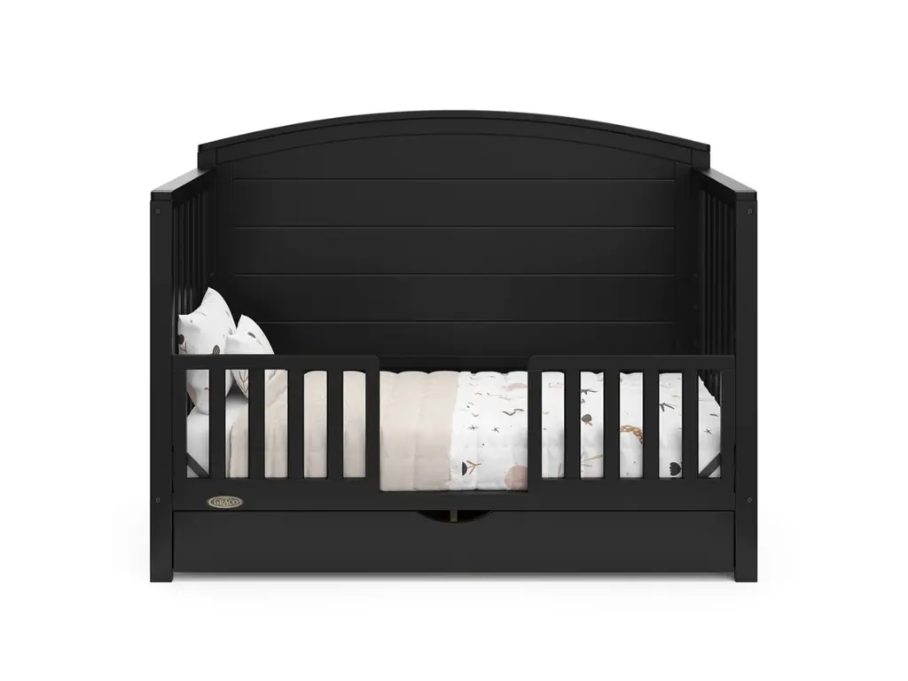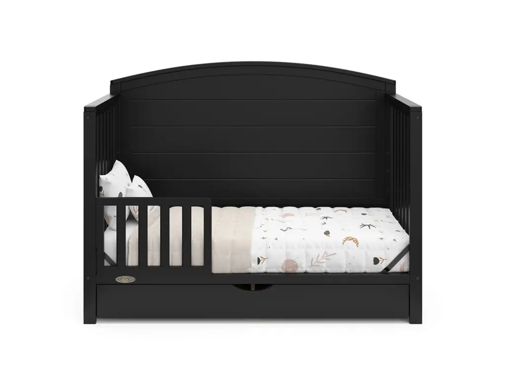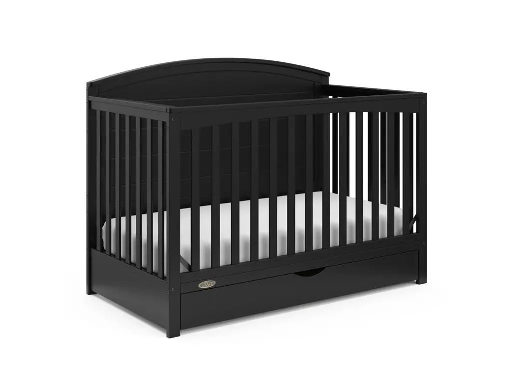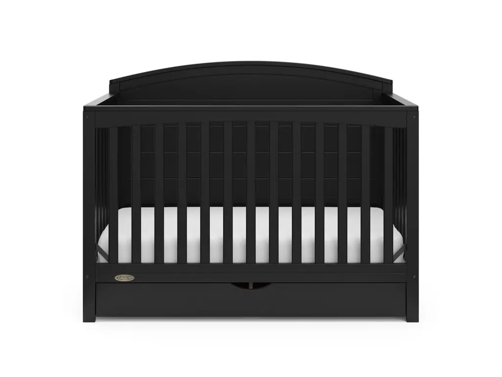 Bring your dream nursery to life with our Graco Bellwood 5-in-1 Convertible Crib with Drawer. For customizable style to match any nursery, the Bellwood features a reversible headboard: one side of the headboard is smooth for a more modern look, while the other side of the headboard has horizontal shiplap detailing for a more classic look. Also, the Bellwood features a spacious under-crib drawer to help store and organize your nursery essentials. The Graco Bellwood 5-in-1 Convertible Crib with Drawer is crafted from pine wood, engineered wood and wood composites, and includes Euro drawer glides, and its applied finish has been tested to meet or exceed the applicable ASTM and CPSIA safety standards. The Bellwood is JPMA Certified, meaning it's been expert tested by third-party, accredited laboratories to meet or exceed all of the applicable category voluntary and mandatory safety standards. Designed to adapt to your growing baby, the Bellwood is equipped with an adjustable mattress support base with 4 different height options, meaning, the Bellwood's mattress support base can be lowered as your child grows [please note, this crib may only be used until your child can easily climb out or is taller than 35 inches (89 cm)]. To support your child's journey from babyhood through childhood, the Bellwood is able to be converted from a crib to a toddler bed (compatible toddler guardrail sold separately), daybed, and full-size bed with headboard and optional footboard (compatible full-size bed conversion kit sold separately). The Graco Bellwood 5-in-1 Convertible Crib with Drawer is designed to accommodate any standard full-size crib & toddler mattress (mattress sold separately, we recommend any Graco crib mattress). Graco is the proud recipient of the Parent Tested Parent Approved (PTPA) Seal of Approval for nursery and children's bedroom furniture, 2023 PTPA Top Product Award, and the 2021-2023 Women's Choice Award for 9 out of 10 Recommended Baby & Kids Furniture. Backed by a 1-year limited manufacturer's warranty. Assembly required. Mattress sold separately.