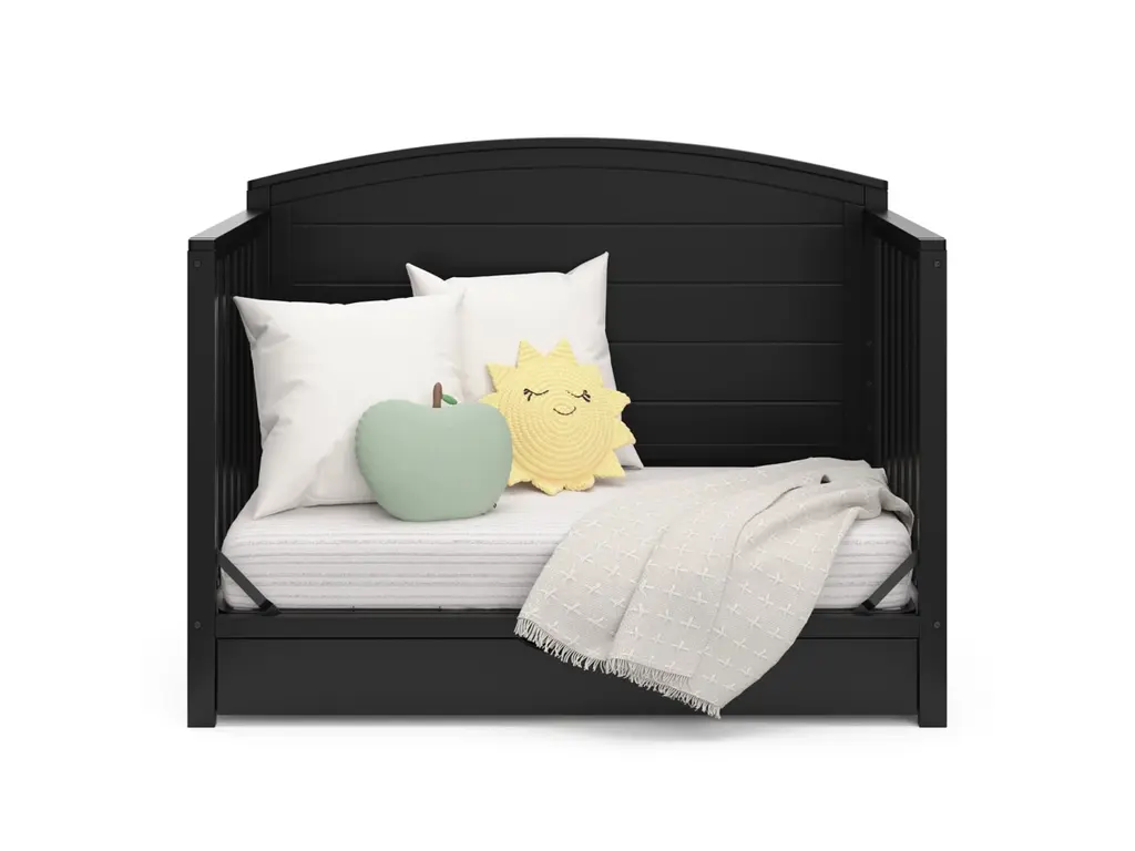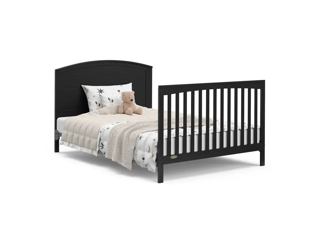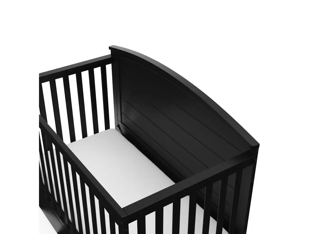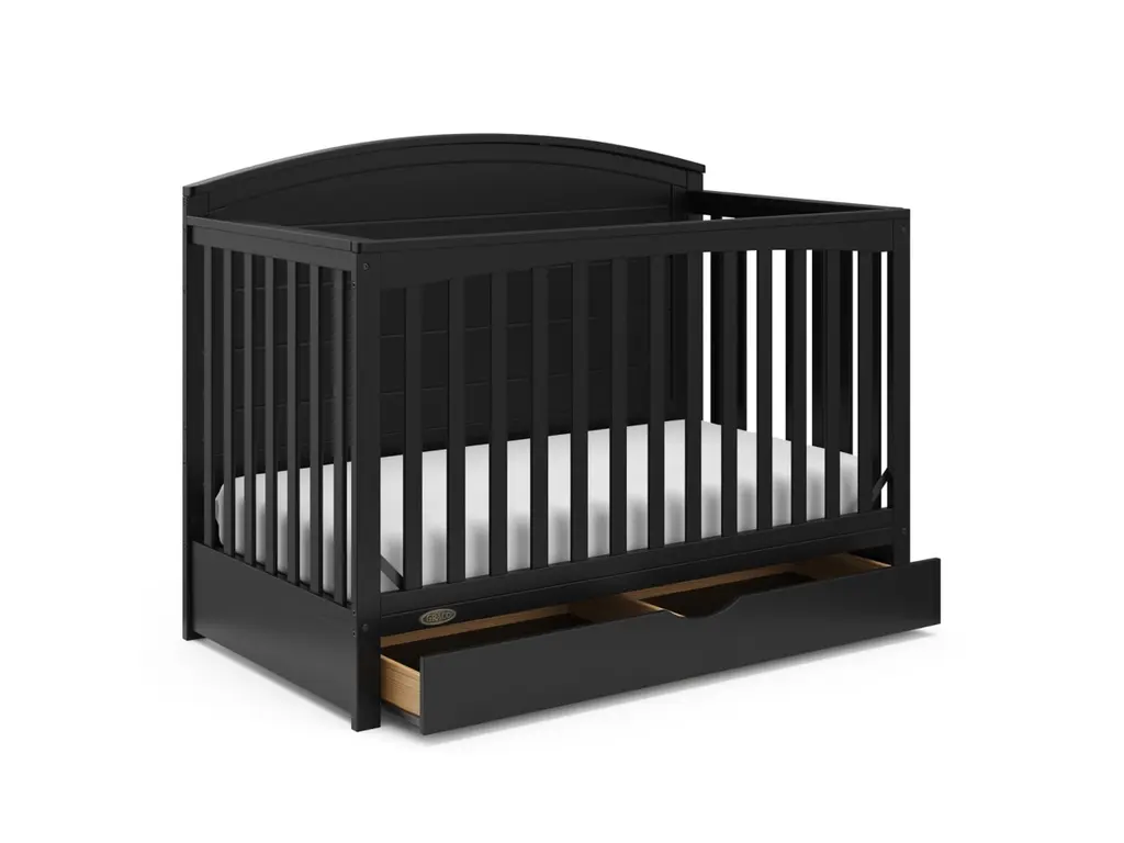 Bring your dream nursery to life with our Graco Bellwood 5-in-1 Convertible Crib with Drawer. For customizable style to match any nursery, the Bellwood features a reversible headboard: one side of the headboard is smooth for a more modern look, while the other side of the headboard has horizontal shiplap detailing for a more classic look. Also, the Bellwood features a spacious under-crib drawer to help store and organize your nursery essentials. The Graco Bellwood 5-in-1 Convertible Crib with Drawer is crafted from pine wood, engineered wood and wood composites, and includes Euro drawer glides, and its applied finish has been tested to meet or exceed the applicable ASTM and CPSIA safety standards. The Bellwood is JPMA Certified, meaning it's been expert tested by third-party, accredited laboratories to meet or exceed all of the applicable category voluntary and mandatory safety standards. Designed to adapt to your growing baby, the Bellwood is equipped with an adjustable mattress support base with 4 different height options, meaning, the Bellwood's mattress support base can be lowered as your child grows [please note, this crib may only be used until your child can easily climb out or is taller than 35 inches (89 cm)]. To support your child's journey from babyhood through childhood, the Bellwood is able to be converted from a crib to a toddler bed (compatible toddler guardrail sold separately), daybed, and full-size bed with headboard and optional footboard (compatible full-size bed conversion kit sold separately). The Graco Bellwood 5-in-1 Convertible Crib with Drawer is designed to accommodate any standard full-size crib & toddler mattress (mattress sold separately, we recommend any Graco crib mattress). Graco is the proud recipient of the Parent Tested Parent Approved (PTPA) Seal of Approval for nursery and children's bedroom furniture, 2023 PTPA Top Product Award, and the 2021-2023 Women's Choice Award for 9 out of 10 Recommended Baby & Kids Furniture. Backed by a 1-year limited manufacturer's warranty. Assembly required. Mattress sold separately.