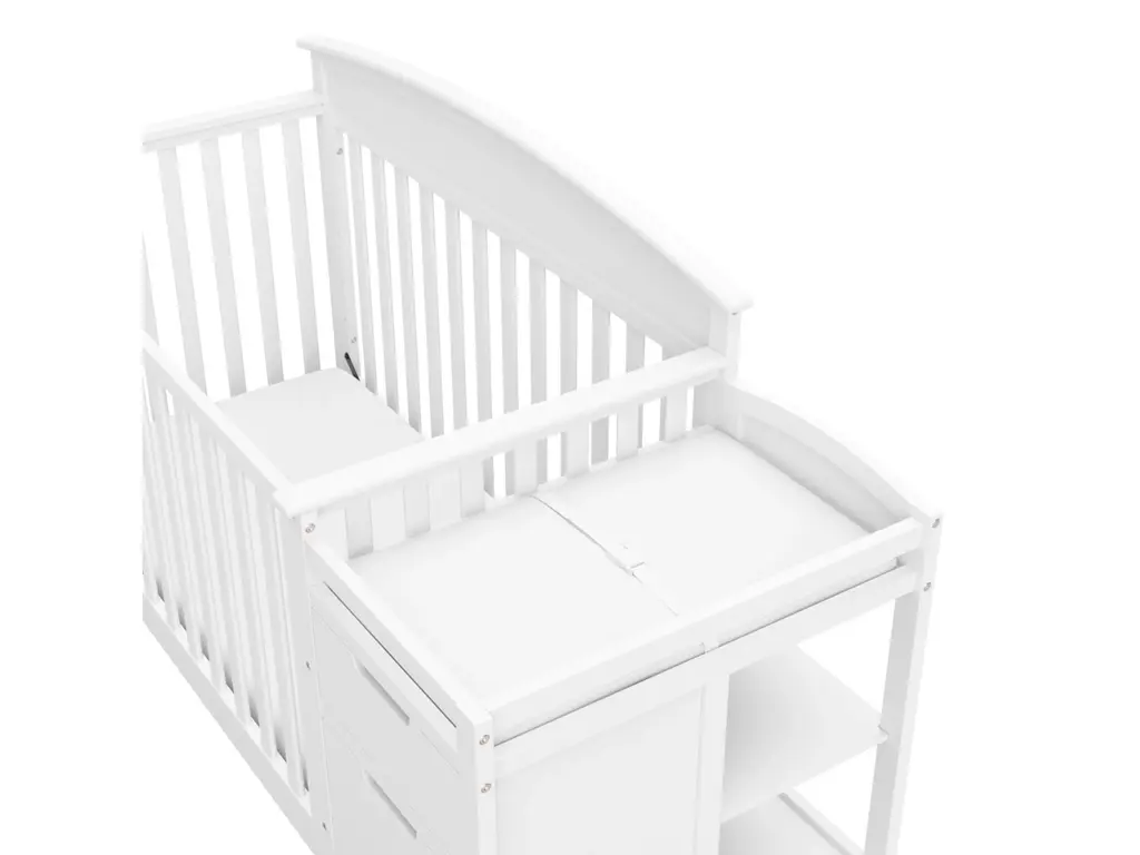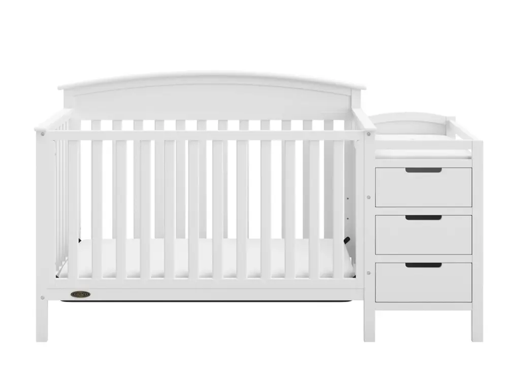 The Graco Benton 4-in-1 Convertible Crib & Changer combines our best-selling Benton convertible crib with an attached changing table, equipped with drawers and shelves. Designed to adapt to your growing baby, the Graco Benton is equipped with a 3-position adjustable mattress support base, and can convert into a daybed, toddler bed, and full-size bed. For added convenience, the attached changing table is equipped with a water-resistant vinyl changing pad and safety strap, and 3 concealed drawers and 3 open shelves for additional space-saving nursery storage. JPMA certified and compliant with all applicable federal safety standards, the Graco Benton 4-in-1 Convertible Crib & Changer is made of high-quality pine wood and composites, is available in multiple baby-safe, non-toxic finishes, and is backed by a 1-year limited manufacturer's warranty.