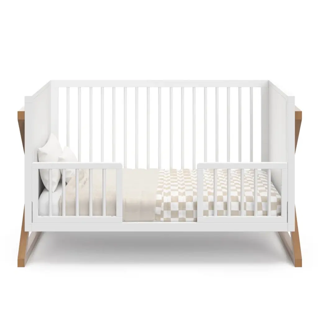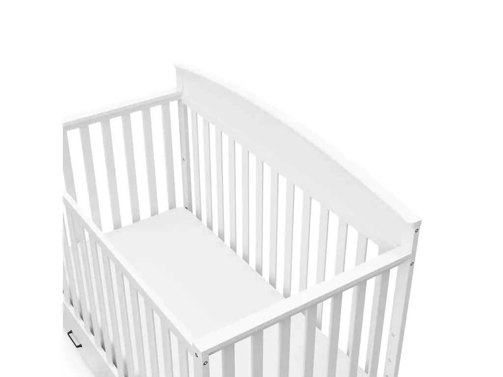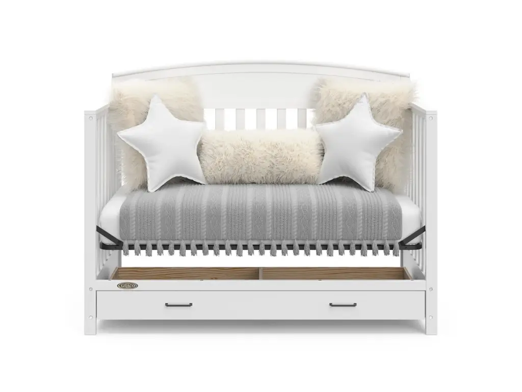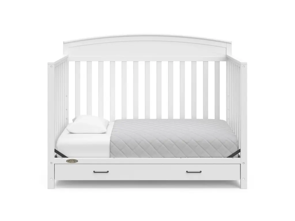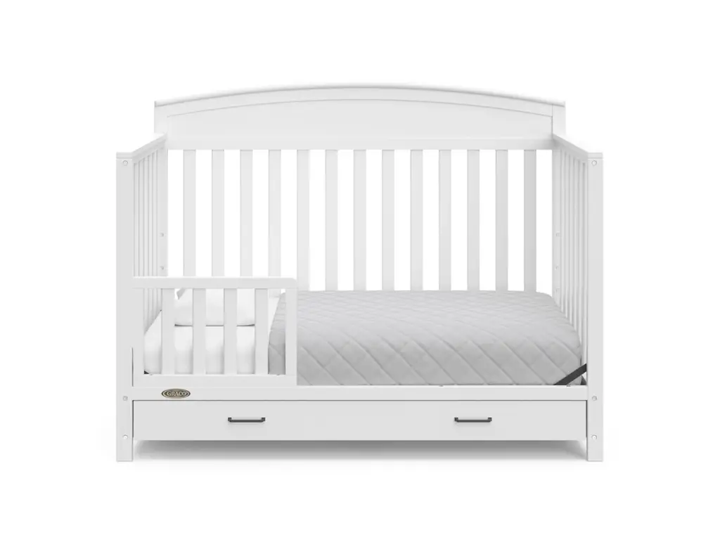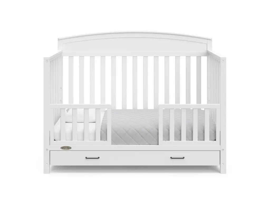 Bring your dream nursery to life with the Graco Benton 5-in-1 Convertible Crib with Drawer. With its clean and classic design, the Benton is the perfect addition to any nursery, and easy to match with any style of room. Also, the Benton's full-size under-crib storage drawer features two (2) compartments for easy organizing, and two (2) stylish metal drawer pulls for a designer accent. The Benton is crafted from pine wood, engineered wood and wood composites, and includes Euro drawer glides, and its applied finish has been tested to meet or exceed the applicable ASTM and CPSIA safety standards. The Graco Benton 5-in-1 Convertible Crib with Drawer is GREENGUARD Gold Certified, Certified products are screened for more than 10,000 chemicals and VOCs known to pollute indoor air. Also, the Benton is JPMA Certified, meaning it's been expert tested by third-party, accredited laboratories to meet or exceed all of the applicable category voluntary and mandatory safety standards. Designed to adapt to your growing baby, the Benton is equipped with an adjustable mattress support base with 4 different height options so the mattress support base's position can be lowered as your child grows [please note, this crib may only be used until your child can easily climb out or is taller than 35 inches (89 cm)]. To support your child's journey from babyhood to toddlerhood and beyond, the Benton is able to be converted from a crib to a toddler bed (compatible with 1 or 2 toddler guardrails, each sold separately), daybed, and full-size bed with headboard and optional footboard (compatible full-size conversion kit sold separately). The Graco Benton 5-in-1 Convertible Crib with Drawer is designed to accommodate any standard full-size crib & toddler mattress (mattress sold separately, we recommend any Graco crib mattress). Graco is the proud recipient of the Parent Tested Parent Approved (PTPA) Seal of Approval for nursery and children's bedroom furniture, and the 2021-2023 Women's Choice Award for 9 out of 10 Recommended Baby & Kids Furniture. Backed by a 1-year limited manufacturer's warranty. Assembly required. Mattress sold separately.