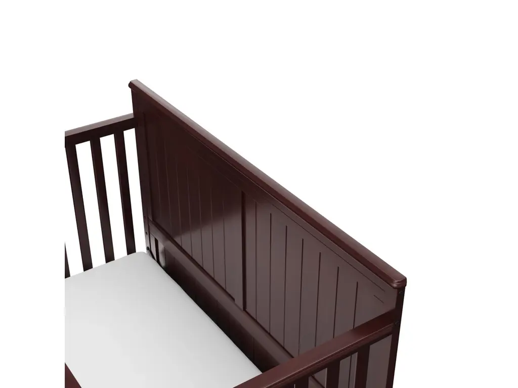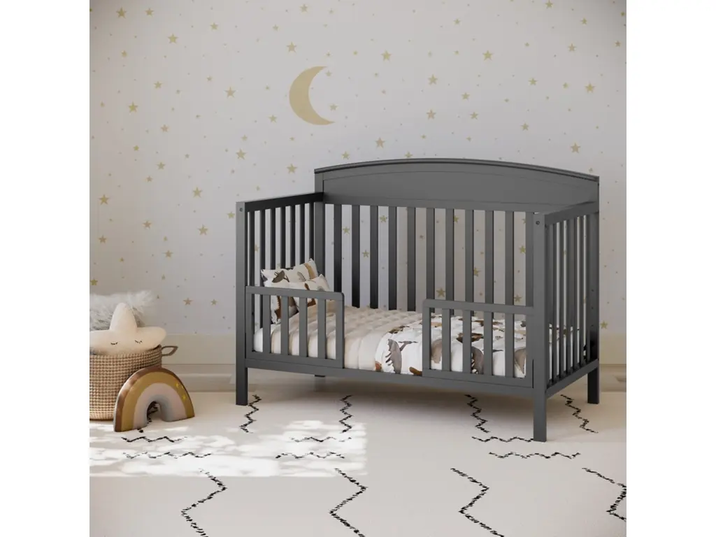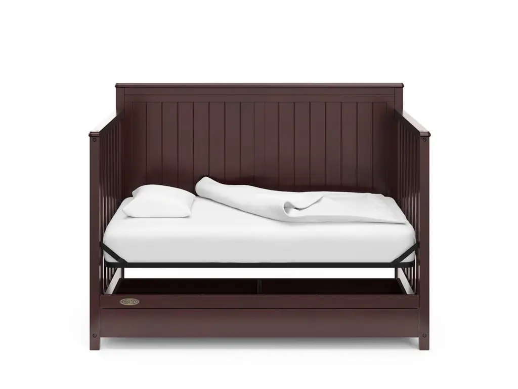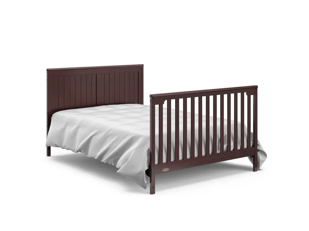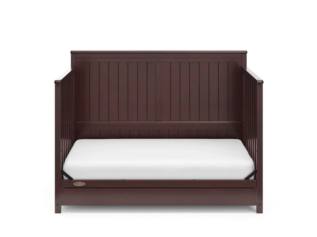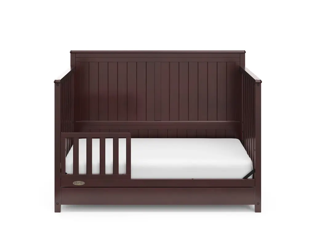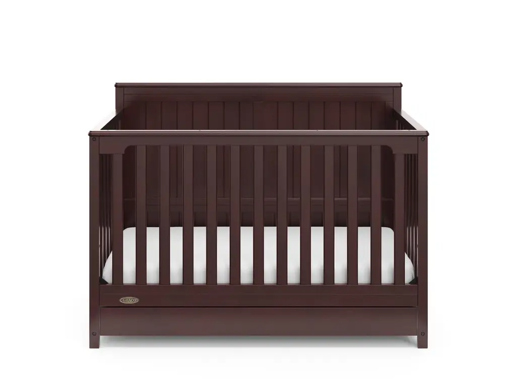 Bring your dream nursery to life with the Graco Hadley 5-in-1 Convertible Crib with Drawer. With its full-panel headboard, full-size under-crib storage drawer, and timeless design, the Hadley is the perfect addition to any nursery. The Hadley is crafted from pine wood, engineered wood, wood composites, and includes Euro drawer glides, and its applied finish has been tested to meet or exceed the applicable ASTM and CPSIA safety standards. Also, the Hadley is JPMA Certified, meaning it has been expert tested by third-party, accredited laboratories to meet or exceed all of the applicable category voluntary and mandatory safety standards. Designed to adapt to your growing baby, the Hadley is equipped with an adjustable mattress support base with 4 different height options, so the mattress support base's position can be lowered as your child grows [please note, this crib may only be used until your child can easily climb out or is taller than 35 inches (89 cm)]. To support your child's journey from babyhood to toddlerhood and beyond, the Hadley can be converted from a crib to a toddler bed [compatible Graco Toddler Safety Guardrail (Slats), 01350-30 Series sold separately)], daybed, and full-size bed with headboard and optional footboard (compatible full-size bed conversion kit sold separately). The Hadley is designed to accommodate any standard full-size crib & toddler mattress (mattress sold separately, we recommend any Graco crib mattress). Graco is the proud recipient of the Parent Tested Parent Approved (PTPA) Seal of Approval for nursery and children's bedroom furniture, and the 2021-2023 Women's Choice Award for 9 out of 10 Recommended Baby & Kids Furniture. Backed by a 1-year limited manufacturer's warranty. Assembly required. Mattress, guardrail kit, and full-size bed conversion kit each sold separately.