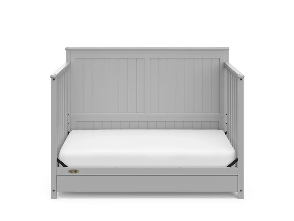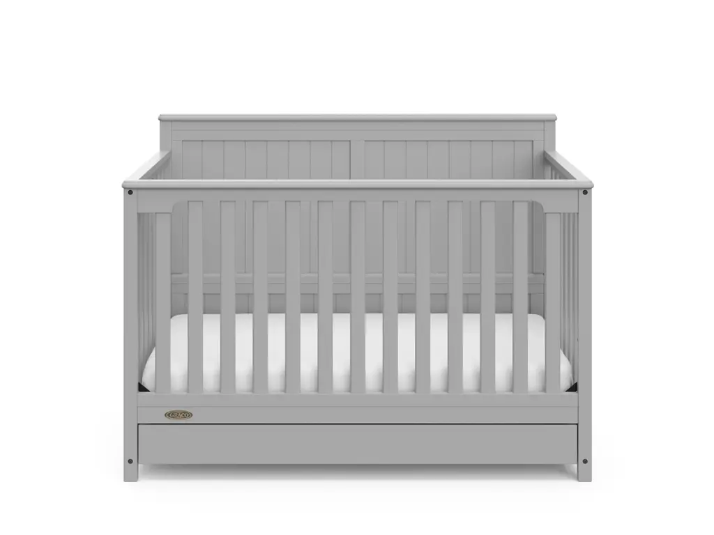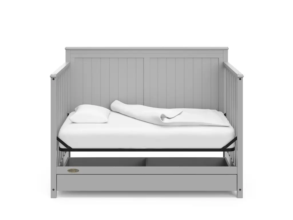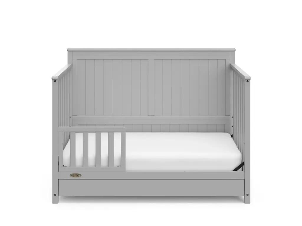 Bring your dream nursery to life with the Graco Hadley 5-in-1 Convertible Crib with Drawer. With its full-panel headboard, full-size under-crib storage drawer, and timeless design, the Hadley is the perfect addition to any nursery. The Hadley is crafted from pine wood, engineered wood, wood composites, and includes Euro drawer glides, and its applied finish has been tested to meet or exceed the applicable ASTM and CPSIA safety standards. Also, the Hadley is JPMA Certified, meaning it has been expert tested by third-party, accredited laboratories to meet or exceed all of the applicable category voluntary and mandatory safety standards. Designed to adapt to your growing baby, the Hadley is equipped with an adjustable mattress support base with 4 different height options, so the mattress support base's position can be lowered as your child grows [please note, this crib may only be used until your child can easily climb out or is taller than 35 inches (89 cm)]. To support your child's journey from babyhood to toddlerhood and beyond, the Hadley can be converted from a crib to a toddler bed [compatible Graco Toddler Safety Guardrail (Slats), 01350-30 Series sold separately)], daybed, and full-size bed with headboard and optional footboard (compatible full-size bed conversion kit sold separately). The Hadley is designed to accommodate any standard full-size crib & toddler mattress (mattress sold separately, we recommend any Graco crib mattress). Graco is the proud recipient of the Parent Tested Parent Approved (PTPA) Seal of Approval for nursery and children's bedroom furniture, and the 2021-2023 Women's Choice Award for 9 out of 10 Recommended Baby & Kids Furniture. Backed by a 1-year limited manufacturer's warranty. Assembly required. Mattress, guardrail kit, and full-size bed conversion kit each sold separately.