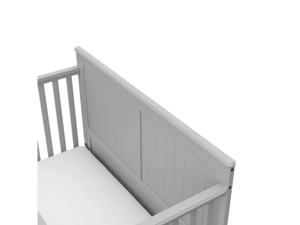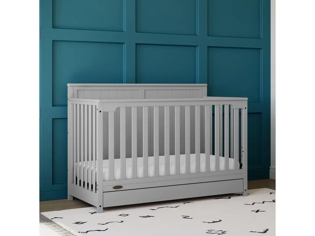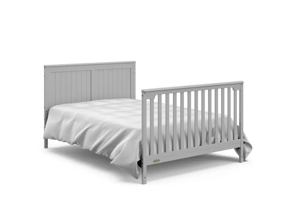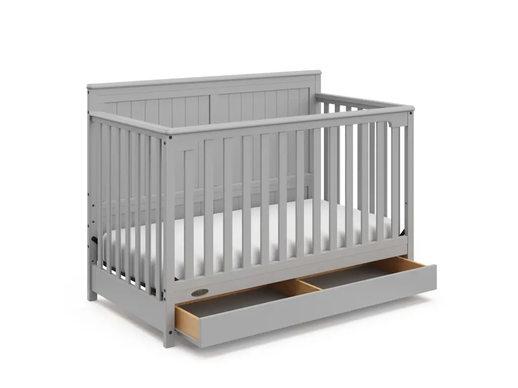 Bring your dream nursery to life with the Graco Hadley 5-in-1 Convertible Crib with Drawer. With its full-panel headboard, full-size under-crib storage drawer, and timeless design, the Hadley is the perfect addition to any nursery. The Hadley is crafted from pine wood, engineered wood, wood composites, and includes Euro drawer glides, and its applied finish has been tested to meet or exceed the applicable ASTM and CPSIA safety standards. Also, the Hadley is JPMA Certified, meaning it has been expert tested by third-party, accredited laboratories to meet or exceed all of the applicable category voluntary and mandatory safety standards. Designed to adapt to your growing baby, the Hadley is equipped with an adjustable mattress support base with 4 different height options, so the mattress support base's position can be lowered as your child grows [please note, this crib may only be used until your child can easily climb out or is taller than 35 inches (89 cm)]. To support your child's journey from babyhood to toddlerhood and beyond, the Hadley can be converted from a crib to a toddler bed [compatible Graco Toddler Safety Guardrail (Slats), 01350-30 Series sold separately)], daybed, and full-size bed with headboard and optional footboard (compatible full-size bed conversion kit sold separately). The Hadley is designed to accommodate any standard full-size crib & toddler mattress (mattress sold separately, we recommend any Graco crib mattress). Graco is the proud recipient of the Parent Tested Parent Approved (PTPA) Seal of Approval for nursery and children's bedroom furniture, and the 2021-2023 Women's Choice Award for 9 out of 10 Recommended Baby & Kids Furniture. Backed by a 1-year limited manufacturer's warranty. Assembly required. Mattress, guardrail kit, and full-size bed conversion kit each sold separately.