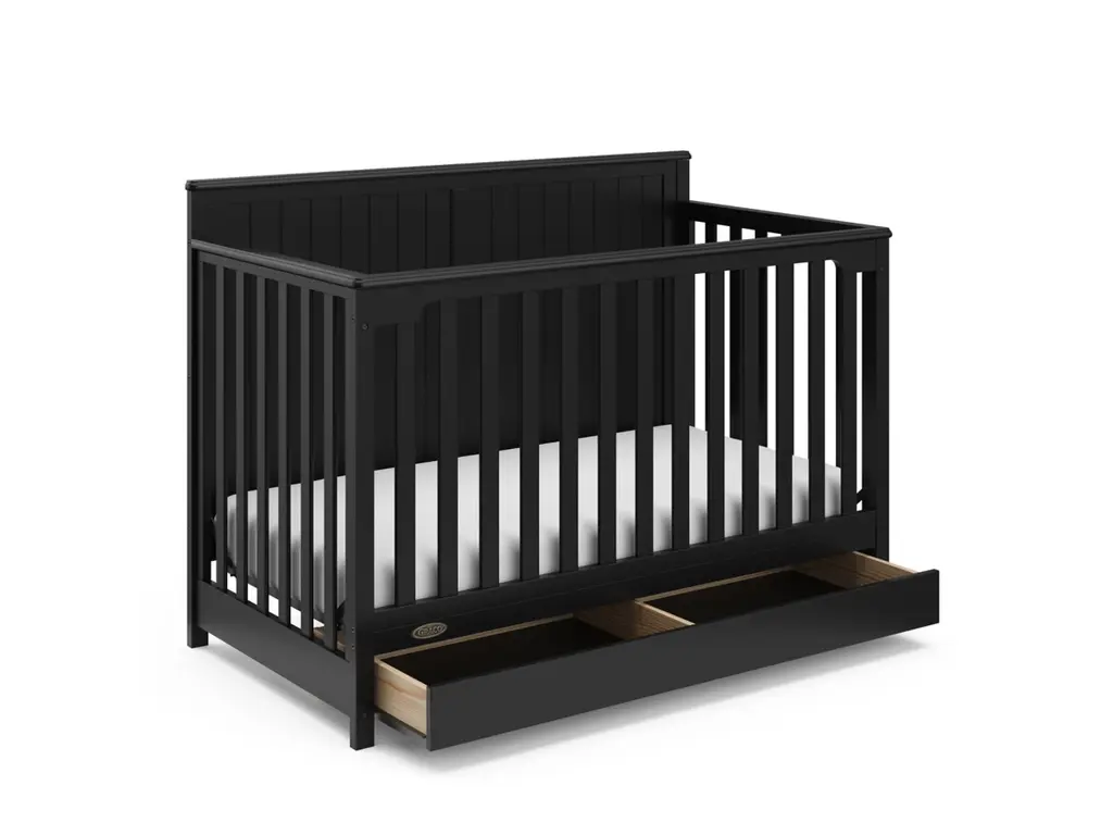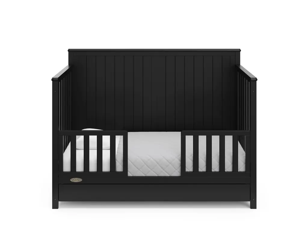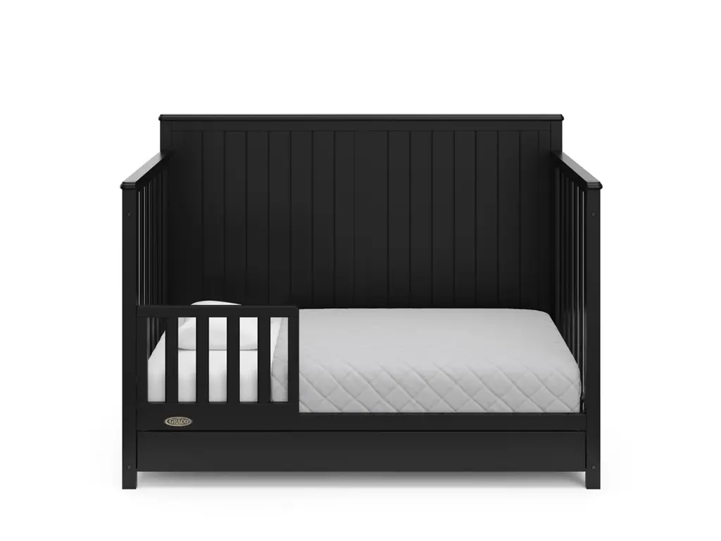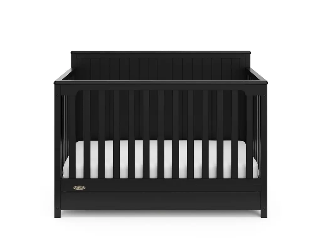 Bring your dream nursery to life with the Graco Hadley 5-in-1 Convertible Crib with Drawer. With its full-panel headboard, full-size under-crib storage drawer, and timeless design, the Hadley is the perfect addition to any nursery. The Hadley is crafted from pine wood, engineered wood, wood composites, and includes Euro drawer glides, and its applied finish has been tested to meet or exceed the applicable ASTM and CPSIA safety standards. Also, the Hadley is JPMA Certified, meaning it has been expert tested by third-party, accredited laboratories to meet or exceed all of the applicable category voluntary and mandatory safety standards. Designed to adapt to your growing baby, the Hadley is equipped with an adjustable mattress support base with 4 different height options, so the mattress support base's position can be lowered as your child grows [please note, this crib may only be used until your child can easily climb out or is taller than 35 inches (89 cm)]. To support your child's journey from babyhood to toddlerhood and beyond, the Hadley can be converted from a crib to a toddler bed [compatible Graco Toddler Safety Guardrail (Slats), 01350-30 Series sold separately)], daybed, and full-size bed with headboard and optional footboard (compatible full-size bed conversion kit sold separately). The Hadley is designed to accommodate any standard full-size crib & toddler mattress (mattress sold separately, we recommend any Graco crib mattress). Graco is the proud recipient of the Parent Tested Parent Approved (PTPA) Seal of Approval for nursery and children's bedroom furniture, and the 2021-2023 Women's Choice Award for 9 out of 10 Recommended Baby & Kids Furniture. Backed by a 1-year limited manufacturer's warranty. Assembly required. Mattress, guardrail kit, and full-size bed conversion kit each sold separately.