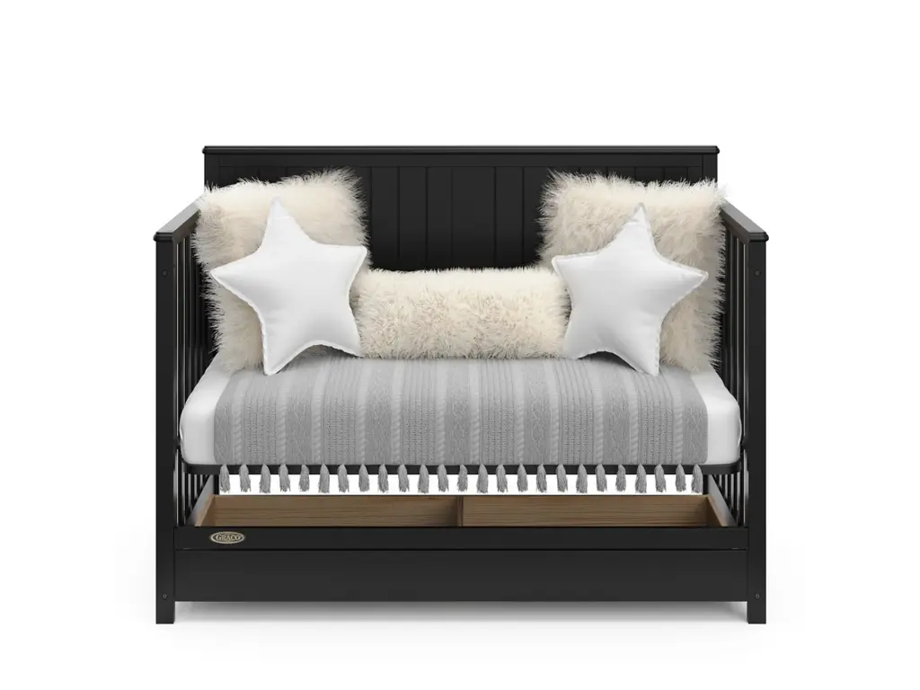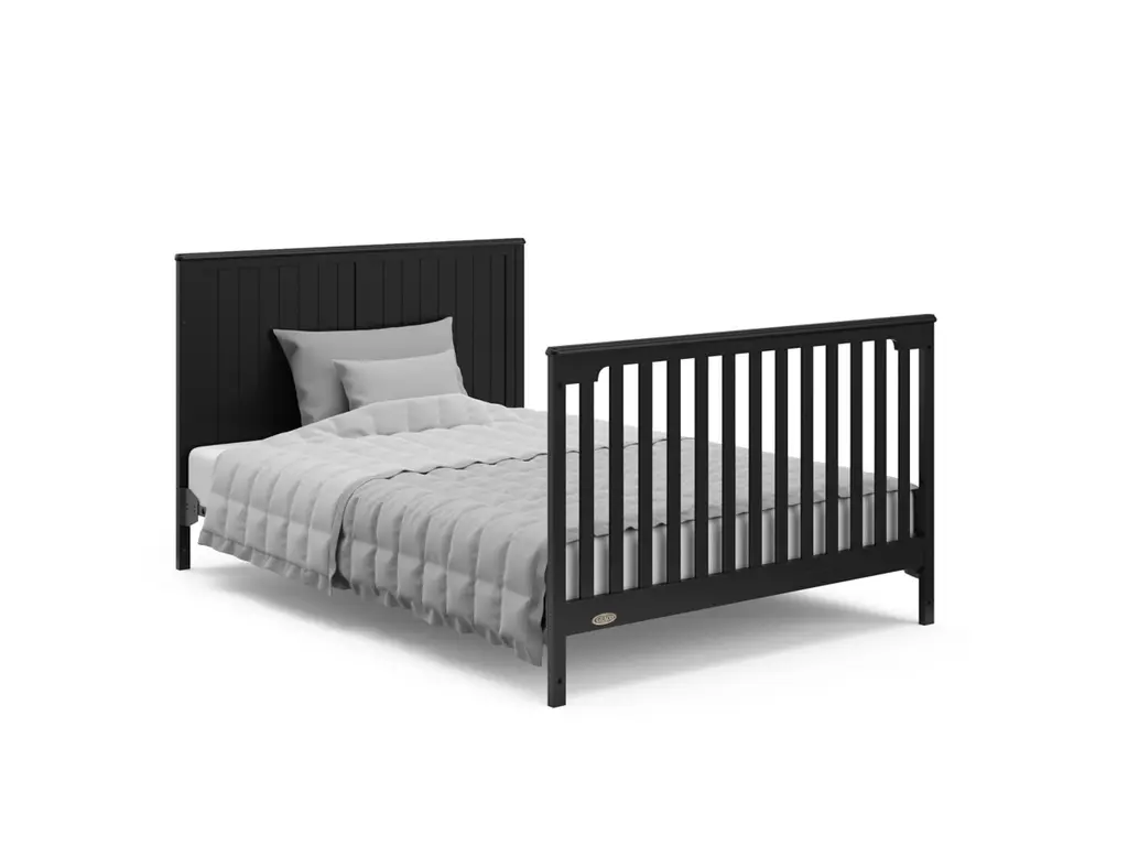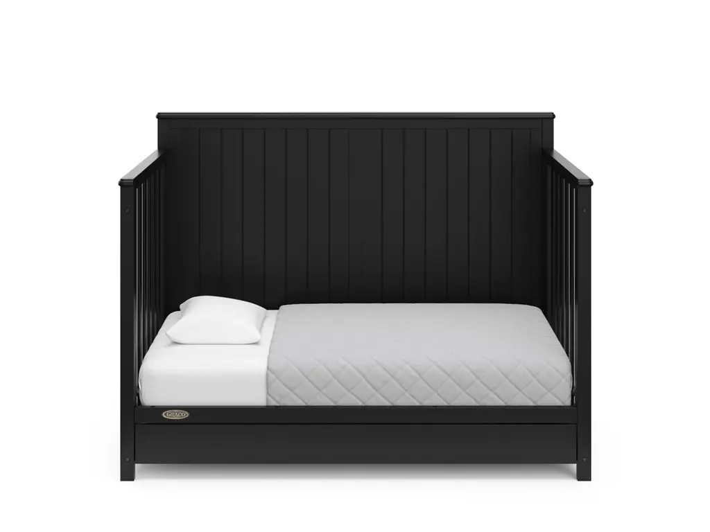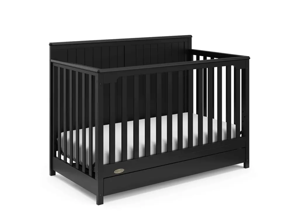 Bring your dream nursery to life with the Graco Hadley 5-in-1 Convertible Crib with Drawer. With its full-panel headboard, full-size under-crib storage drawer, and timeless design, the Hadley is the perfect addition to any nursery. The Hadley is crafted from pine wood, engineered wood, wood composites, and includes Euro drawer glides, and its applied finish has been tested to meet or exceed the applicable ASTM and CPSIA safety standards. Also, the Hadley is JPMA Certified, meaning it has been expert tested by third-party, accredited laboratories to meet or exceed all of the applicable category voluntary and mandatory safety standards. Designed to adapt to your growing baby, the Hadley is equipped with an adjustable mattress support base with 4 different height options, so the mattress support base's position can be lowered as your child grows [please note, this crib may only be used until your child can easily climb out or is taller than 35 inches (89 cm)]. To support your child's journey from babyhood to toddlerhood and beyond, the Hadley can be converted from a crib to a toddler bed [compatible Graco Toddler Safety Guardrail (Slats), 01350-30 Series sold separately)], daybed, and full-size bed with headboard and optional footboard (compatible full-size bed conversion kit sold separately). The Hadley is designed to accommodate any standard full-size crib & toddler mattress (mattress sold separately, we recommend any Graco crib mattress). Graco is the proud recipient of the Parent Tested Parent Approved (PTPA) Seal of Approval for nursery and children's bedroom furniture, and the 2021-2023 Women's Choice Award for 9 out of 10 Recommended Baby & Kids Furniture. Backed by a 1-year limited manufacturer's warranty. Assembly required. Mattress, guardrail kit, and full-size bed conversion kit each sold separately.