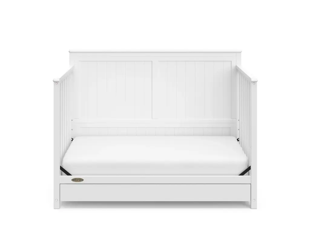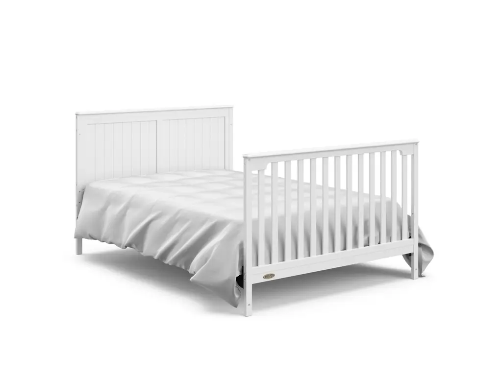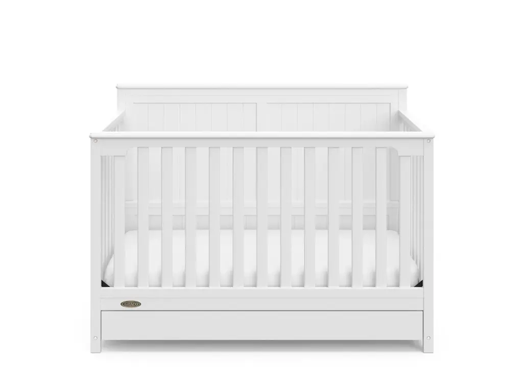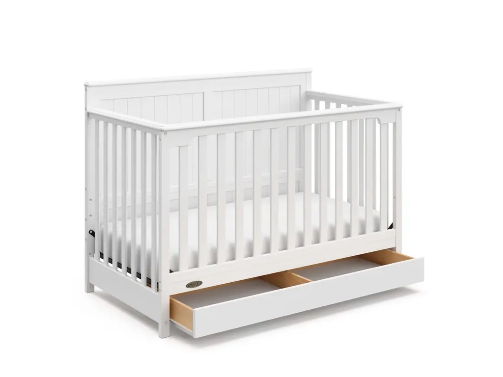 Bring your dream nursery to life with the Graco Hadley 5-in-1 Convertible Crib with Drawer. With its full-panel headboard, full-size under-crib storage drawer, and timeless design, the Hadley is the perfect addition to any nursery. The Hadley is crafted from pine wood, engineered wood, wood composites, and includes Euro drawer glides, and its applied finish has been tested to meet or exceed the applicable ASTM and CPSIA safety standards. Also, the Hadley is JPMA Certified, meaning it has been expert tested by third-party, accredited laboratories to meet or exceed all of the applicable category voluntary and mandatory safety standards. Designed to adapt to your growing baby, the Hadley is equipped with an adjustable mattress support base with 4 different height options, so the mattress support base's position can be lowered as your child grows [please note, this crib may only be used until your child can easily climb out or is taller than 35 inches (89 cm)]. To support your child's journey from babyhood to toddlerhood and beyond, the Hadley can be converted from a crib to a toddler bed [compatible Graco Toddler Safety Guardrail (Slats), 01350-30 Series sold separately)], daybed, and full-size bed with headboard and optional footboard (compatible full-size bed conversion kit sold separately). The Hadley is designed to accommodate any standard full-size crib & toddler mattress (mattress sold separately, we recommend any Graco crib mattress). Graco is the proud recipient of the Parent Tested Parent Approved (PTPA) Seal of Approval for nursery and children's bedroom furniture, and the 2021-2023 Women's Choice Award for 9 out of 10 Recommended Baby & Kids Furniture. Backed by a 1-year limited manufacturer's warranty. Assembly required. Mattress, guardrail kit, and full-size bed conversion kit each sold separately.