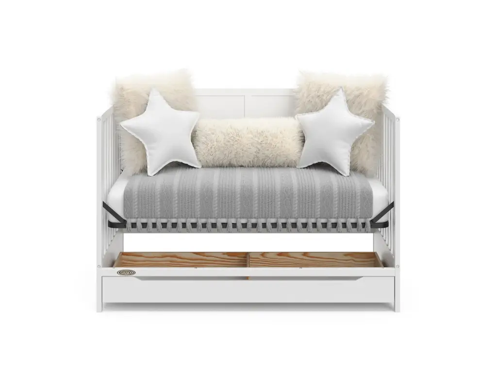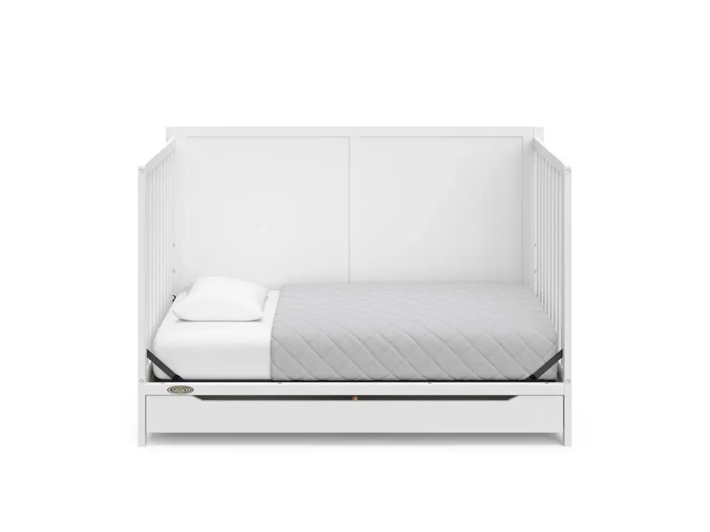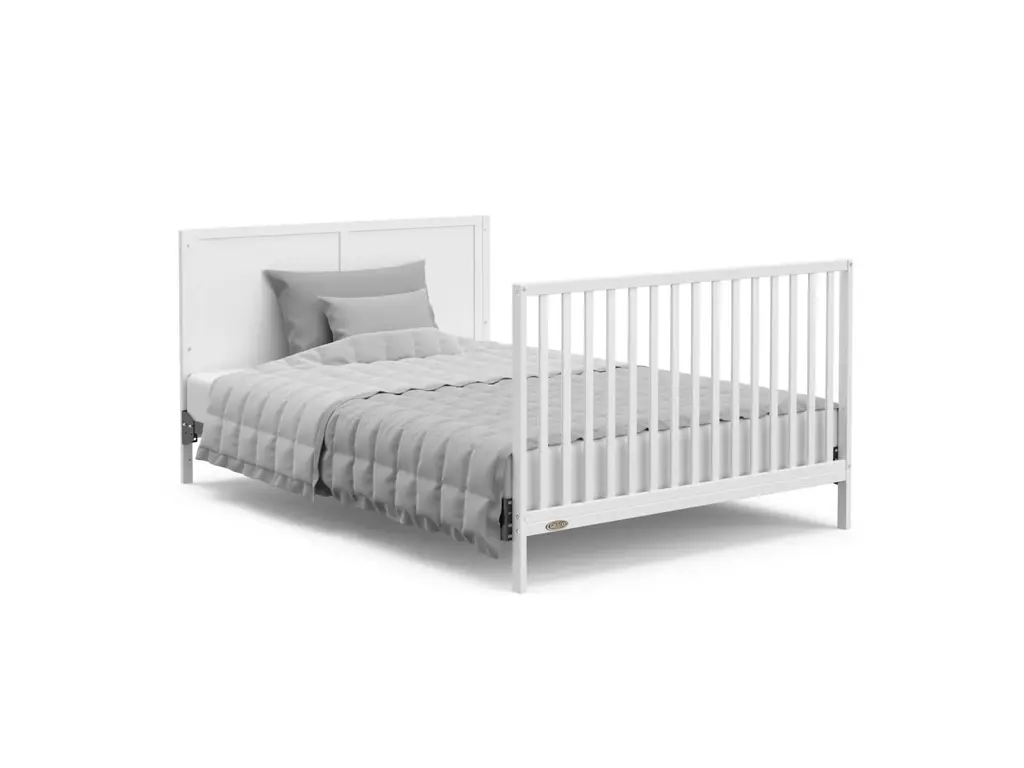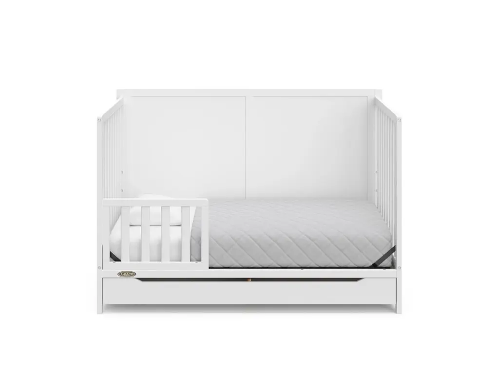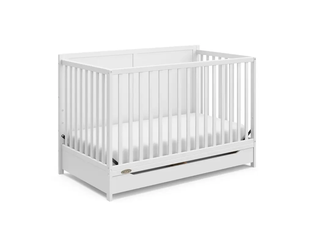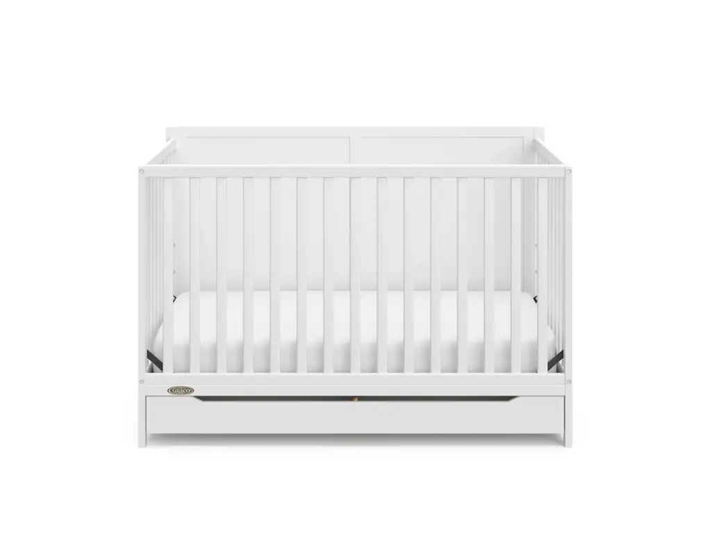 Bring your dream nursery to life with the Graco® Melrose 5-in-1 Convertible Crib with Drawer. With its timeless, versatile design, the Melrose is the perfect addition to any nursery – and easy to match with any style. The Melrose is crafted from pine wood, engineered wood, and wood composites, includes Euro drawer glides, and its applied finish has been tested to meet or exceed the applicable ASTM and CPSIA safety standards. The Graco® Melrose 5-in-1 Convertible Crib with Drawer is GREENGUARD Gold Certified — Certified products are screened for more than 10,000 chemicals and VOCs known to pollute indoor air. Also, the Melrose is JPMA Certified — meaning it’s been expert tested by third-party, accredited laboratories to meet or exceed all of the applicable category voluntary and mandatory safety standards. Designed to adapt to your growing baby, the Melrose is equipped with an adjustable mattress support base with 4 different height options – meaning, the height of the mattress support base can be lowered as your child grows (please note, this crib may only be used until your child can easily climb out or is taller than 35 inches). To support your child’s journey from babyhood to toddlerhood and beyond, the Melrose is able to be converted from a crib to a toddler bed (compatible with 1 or 2 toddler guardrails, each sold separately), daybed, and full-size bed with headboard and optional footboard (compatible full-size conversion kit sold separately). The Graco® Melrose 5-in-1 Convertible Crib with Drawer is designed to accommodate any standard full-size crib & toddler mattress (mattress sold separately – we recommend any Graco® crib mattress to pair with your Melrose). Graco® is the proud recipient of the Parent Tested Parent Approved (PTPA) Seal of Approval for nursery and children’s bedroom furniture, and the 2023 Women's Choice Award for 9 out of 10 Recommended Baby & Kids Furniture. Backed by a 1-year limited manufacturer’s warranty. Assembly required. Mattress sold separately.