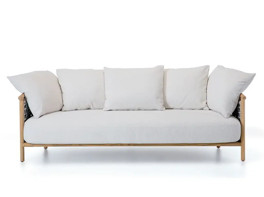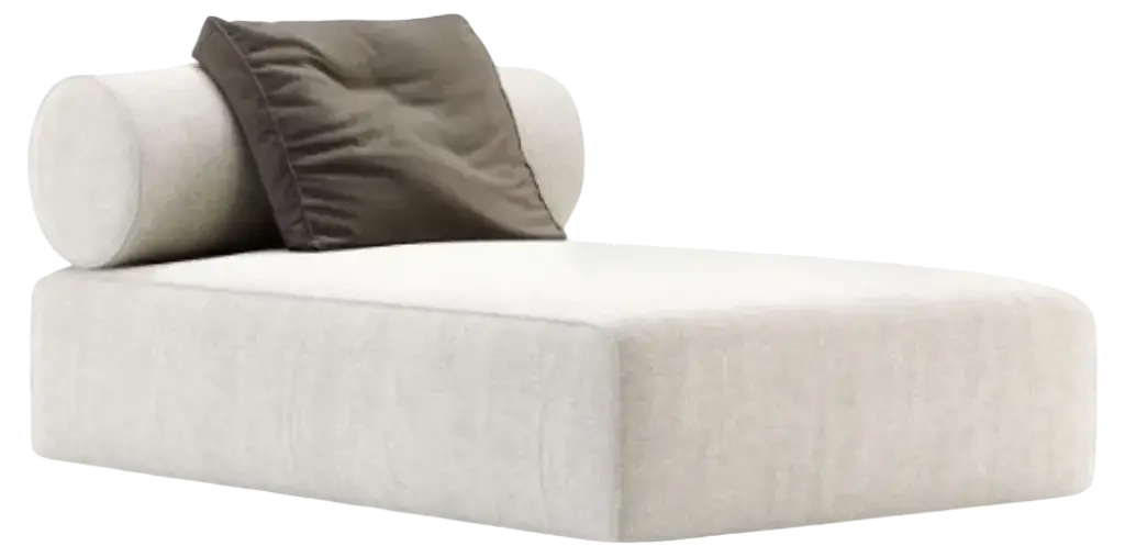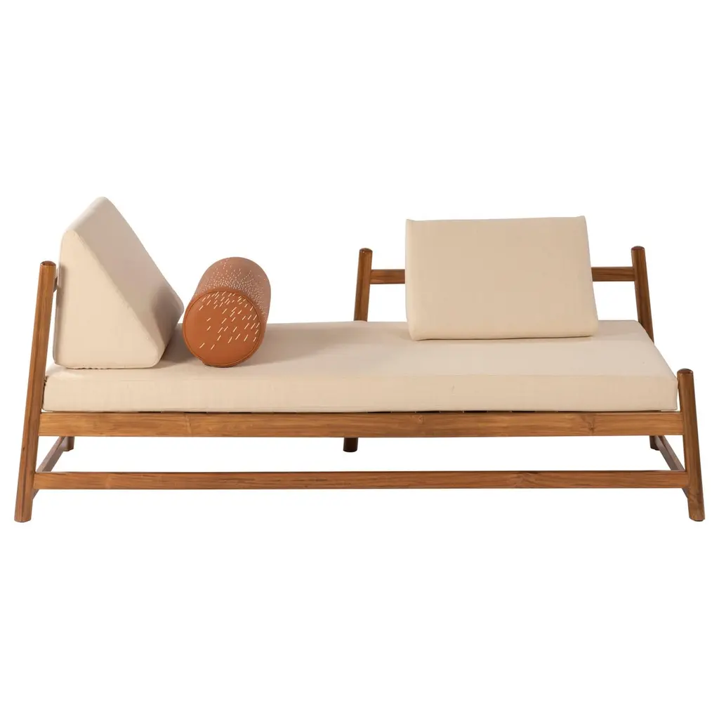 Cuccione with structure in high glossy Sapeli Mahogany. Seat, backrest & roll cushions and piping with fabric. Belts in leather. Metal details satin steel.