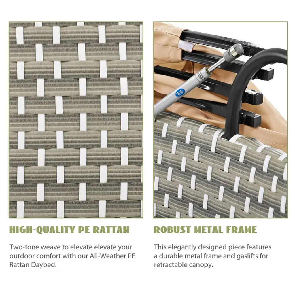 Elevate your outdoor living with the Light Coffee Round Patio Chaise Lounges, a versatile sectional sofa set that transforms into a luxurious daybed. Featuring a retractable canopy, this piece offers the perfect balance of sun and shade, allowing you to relax in comfort. The adjustable table at the center can be raised or lowered to suit your needs, whether you're enjoying a snack or reading a book. With dimensions of 66.5 x 65 x 53.5 inches, this elegant set is designed for both style and functionality, making it a stunning addition to any patio or garden.