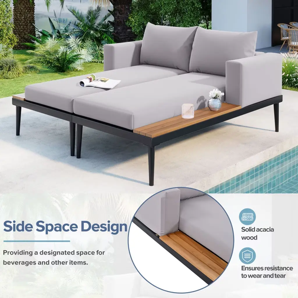 Gulches Modern Outdoor Daybed Patio Metal Daybed With Wood Topped Side Spaces For Drinks, 2 In 1 Padded Chaise Lounges For Poolside, Balcony, Gray