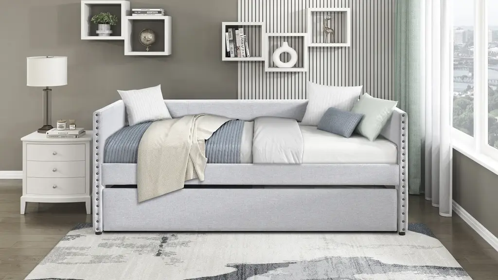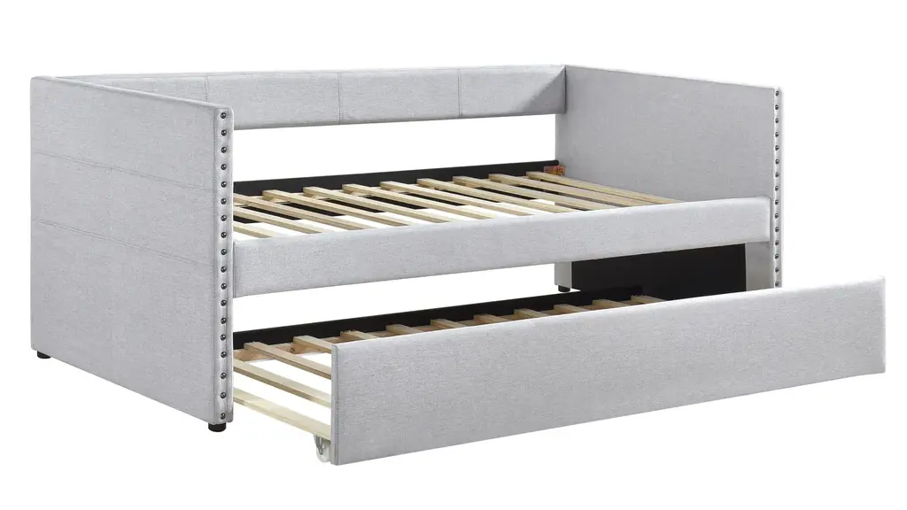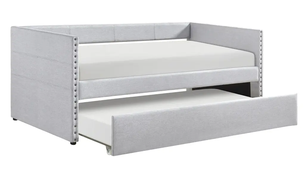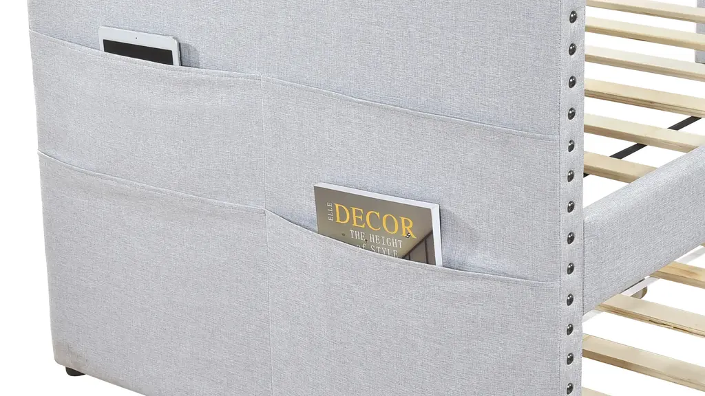 The modern lines and nailhead trim of the Hamden Daybed lend to myriad decorative aesthetics ranging from modern to transitional while the optional hues of the fabric upholstery provide further complement to your space. The daybed's outer side panels feature 4 convenient storage pockets for ease of access to your bedside essentials while the additional sleep space the included trundle provides for your home allows for convenient access when it is needed and discrete storage when it is not in use.