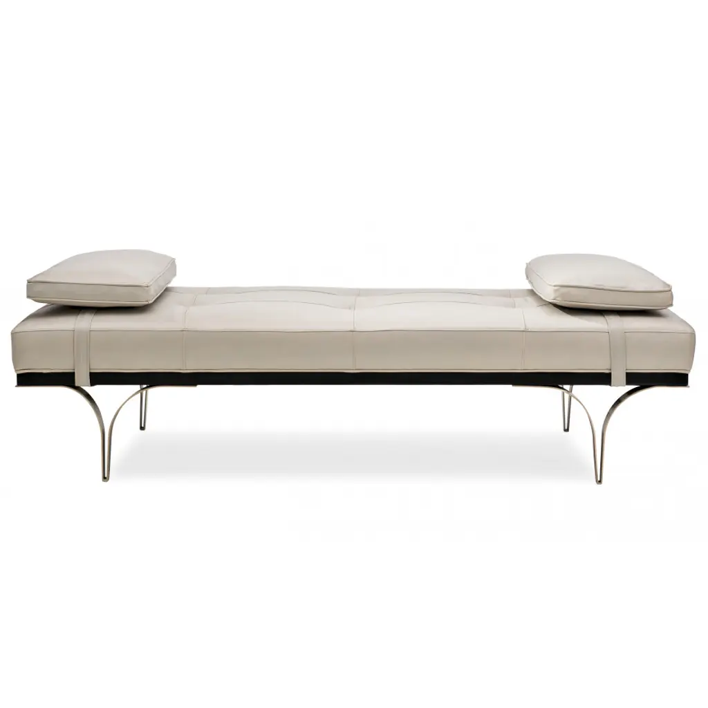 Designed for daydreaming, this daybed is truly lounge-worthy. Clean lines and elegant tailoring distinguish its appearance and are enhanced by a semi-aniline cover tufted in a modern grid pattern. A plush pillow highlights each end of this brilliant piece and can be secured or removed with ease. Metal V-shaped legs finished in Whisper of Gold elevate this daybed while lending an airy openness to its overall appearance. Designed to flatter every space, this special piece delivers a look you’ll love for years to come.