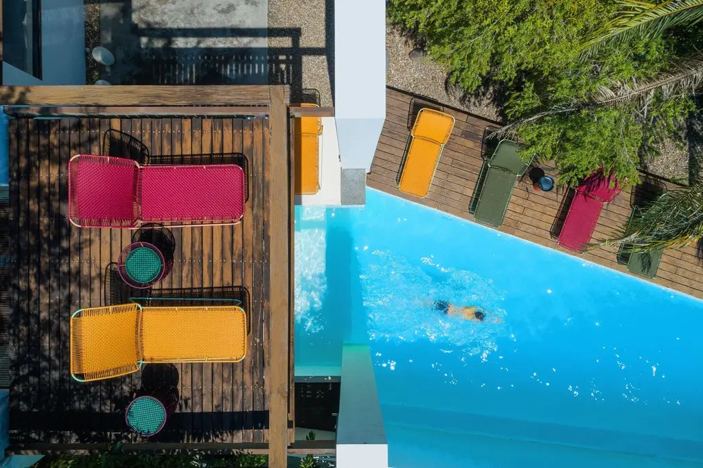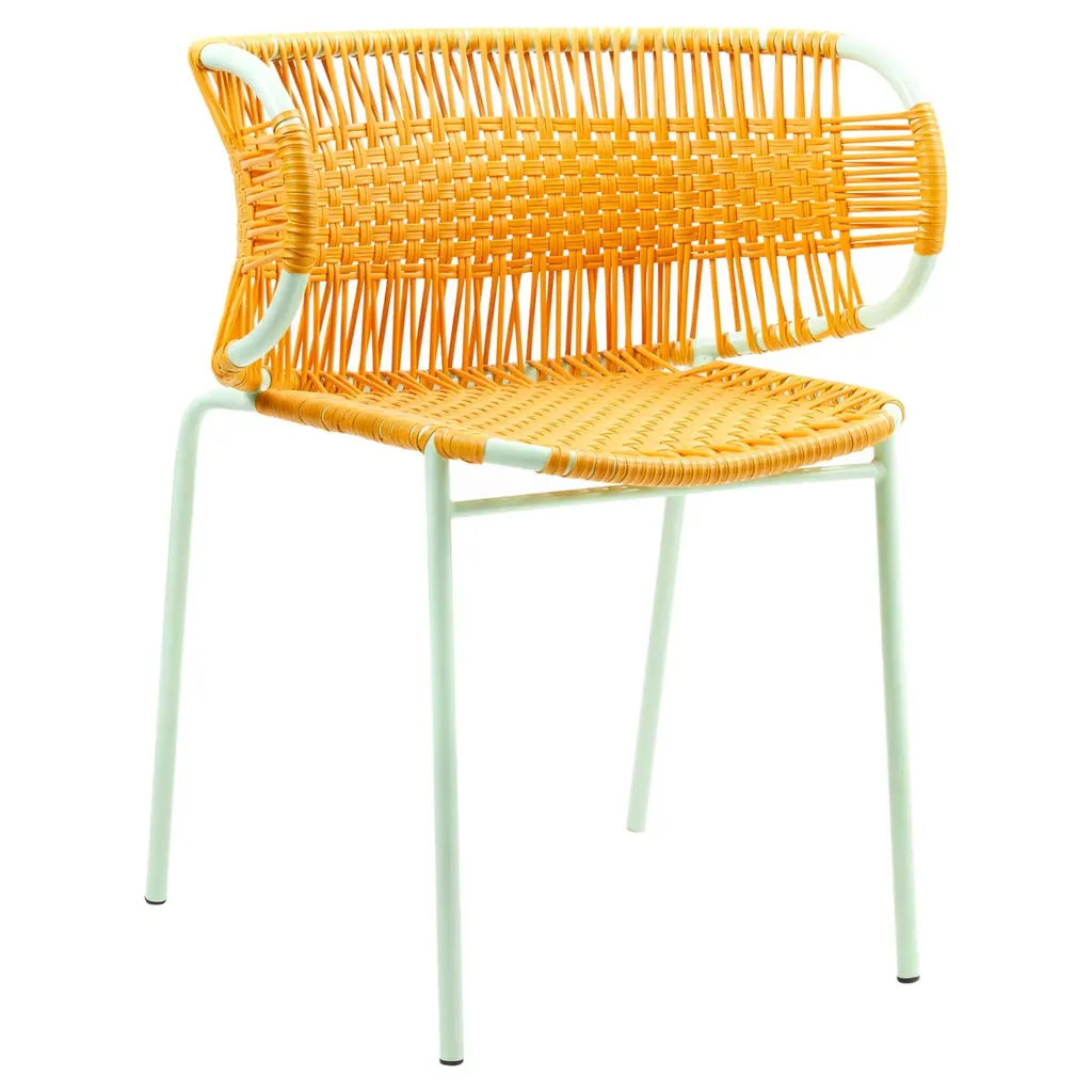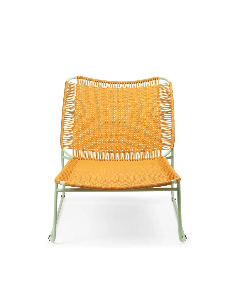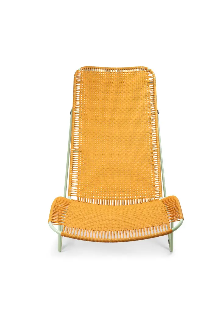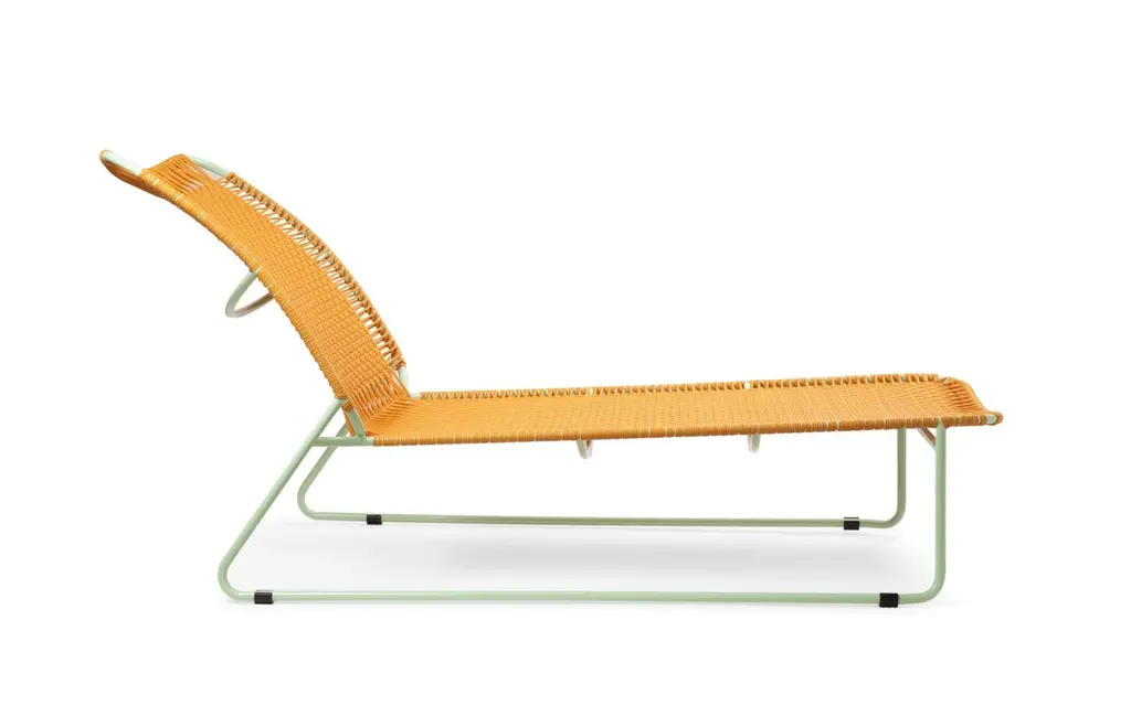Honey Cielo daybed by Sebastian Herkner.Dimensions: 172 x 78 x 83 cmMaterials: Recycled plastic and metalMade from recycled plastic strings and galvanized, powder-coated steel, the bed is available in five colorways: mint/ black - black-black- oliv/ menta - purple/carne - honey/ menta.Stackable to 3 items.