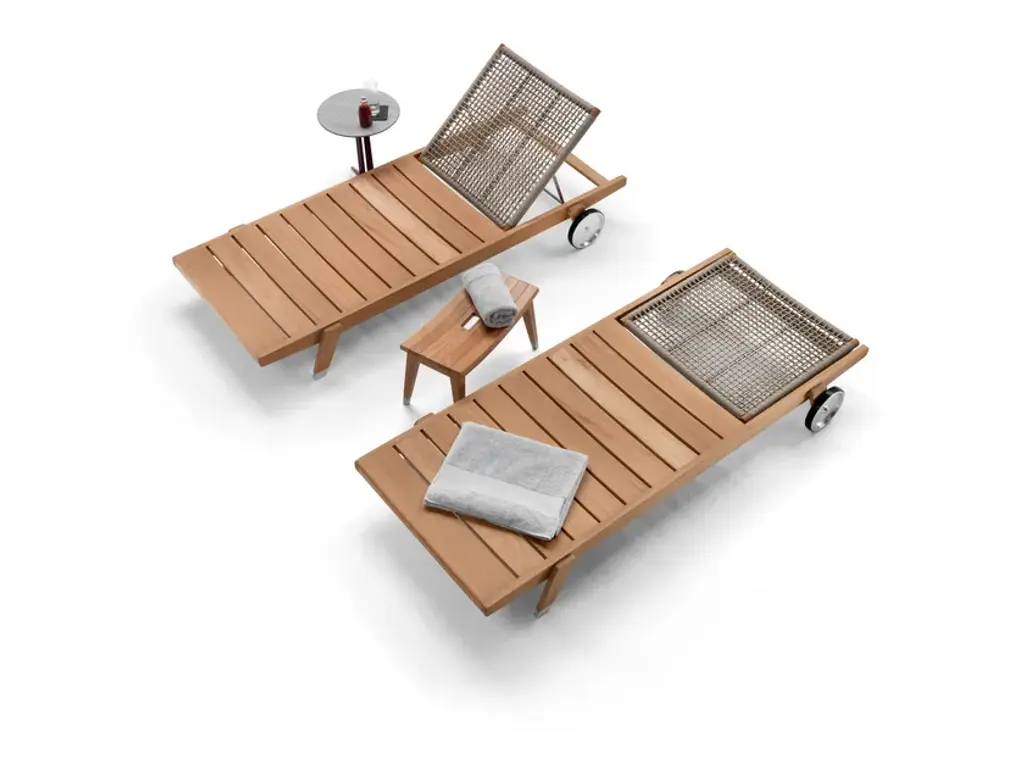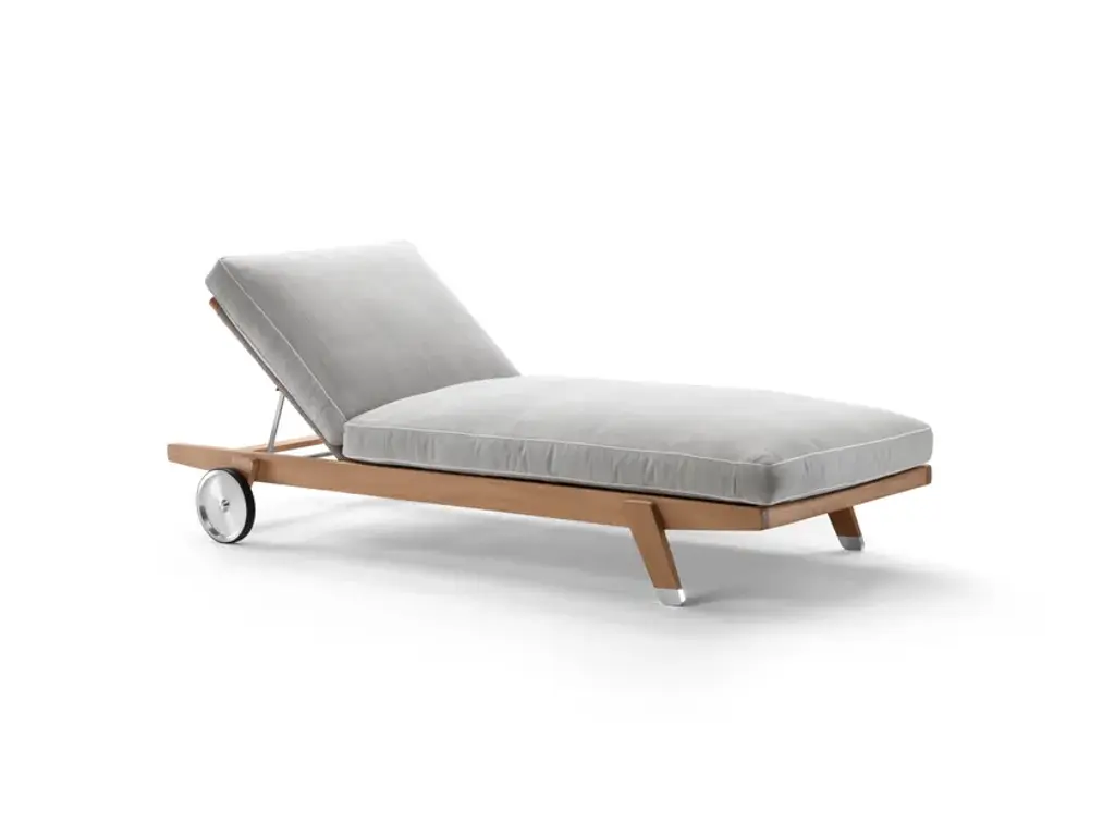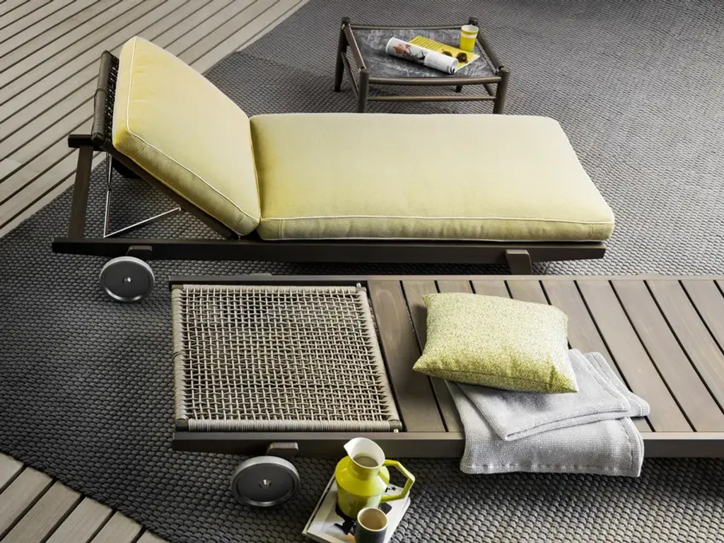 Poolside or in the shade of a gazebo, the Hora Sexta daybed offers a truly relaxing experience.The minimalist design of the Hora Sexta daybed exalts the natural qualities of the iroko wood –warm-colored, with a soft, velvety texture. It also features ingenious craftsmanship details, like the reclinable woven polypropylene fiber backrest, available in a wide range of sophisticated colors. It rests on die-cast metal alloy tips and nylon pads.The daybed also comes in a version with cast aluminum posterior wheels that allow it to be moved quickly and easily. It can be completed with a soft, upholstered mattress finished with elegant grosgrain piping that can be crafted tone-on-tone or in a contrasting shade for a more distinct decorative vibe.Structure in solid iroko wood with natural or stained grey finishReclinable backrest in 316 stainless steel and solid iroko wood with natural finish or stained grey. The backrest is in woven polypropylene cord in the following colors sand 8001, anthracite 8005, bordeaux 8002, green 8006, white 8007, brown 8004; or, in matt polypropylene cord in natural 8102, ice 8103, anthracite 8105 or straw 8101 color. Backrest recliner system in electropolished 316 stainless steelSeat/backrest cushion in blown polyester fiber with insert in single-density crushproof material, covered in water-repellent fabric. Upon request, with upchargeFeet in die-cast zama with matt brushed or burnished finish. Feet rest on tips made of thermoplastic materialWheels in cast aluminum with matt brushed or burnished finish; profile in grey thermoplastic materialSeat cushion upholstery in removable fabricUpholstery piping tailoring includes grosgrain piping that can be crafted in all the colors on the sample boardCover in waterproof material; cover is upon request, with upcharge
