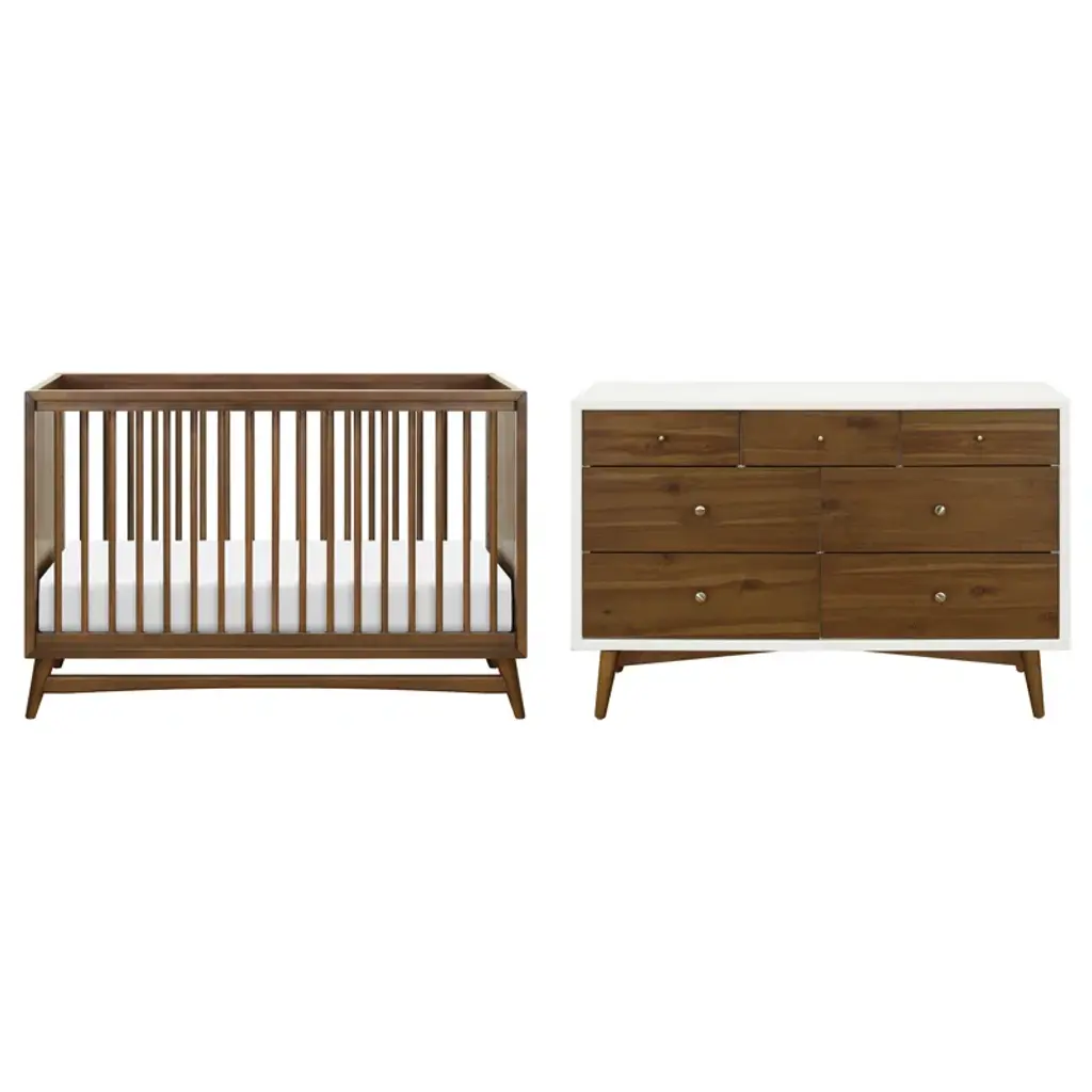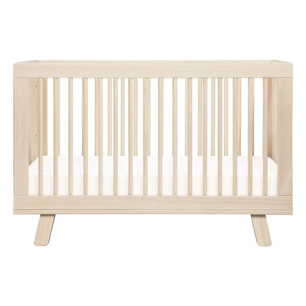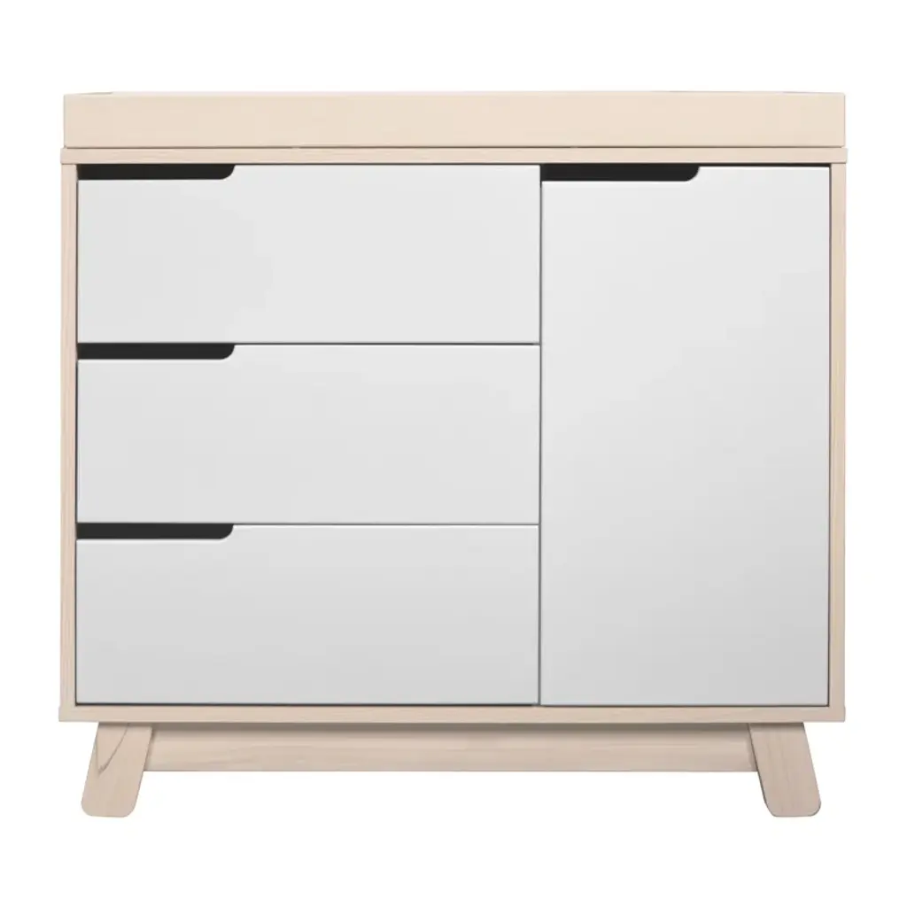 Delight in the mid-century modern appeal of the Babyletto Hudson collection. This set includes 3 in 1 convertible crib with a toddler bed conversion kit that allows you to seamlessly convert from crib to toddler bed to daybed as your babe grows. The 3-drawer changer dresser is a practical package. Combining a changing table, three-drawer dresser, and storage cabinet all in one. Keep baby's clothes and necessities organized in the smooth-opening drawers, while stop mechanisms prevent them from being pulled all the way out.