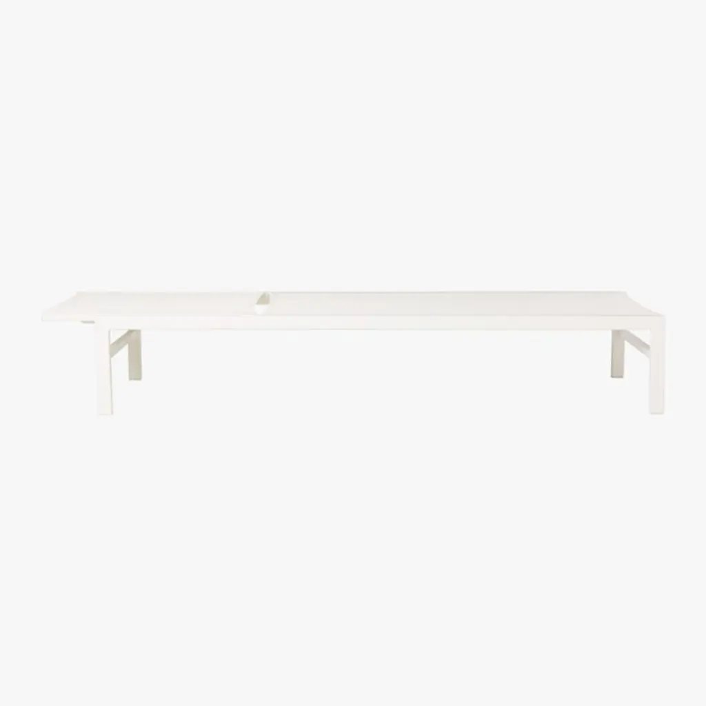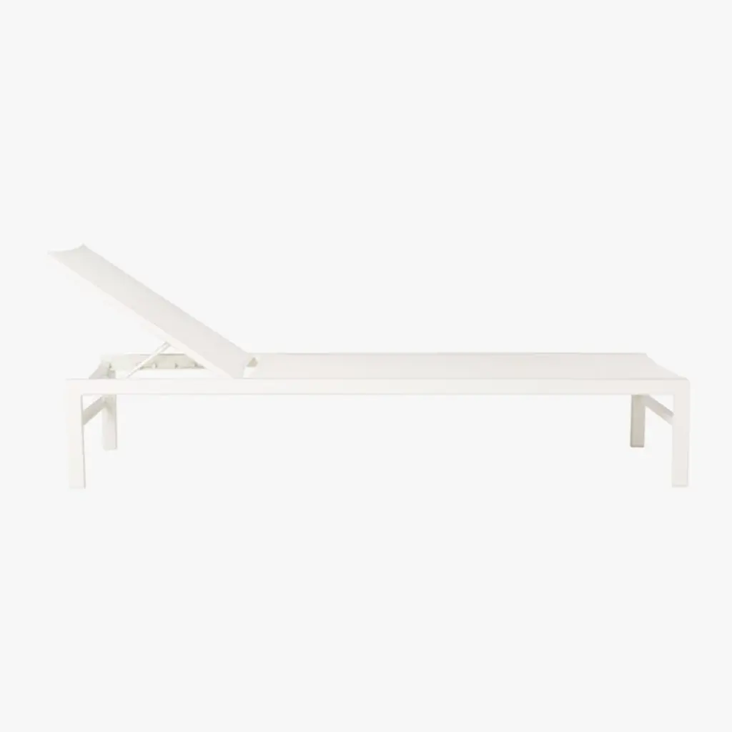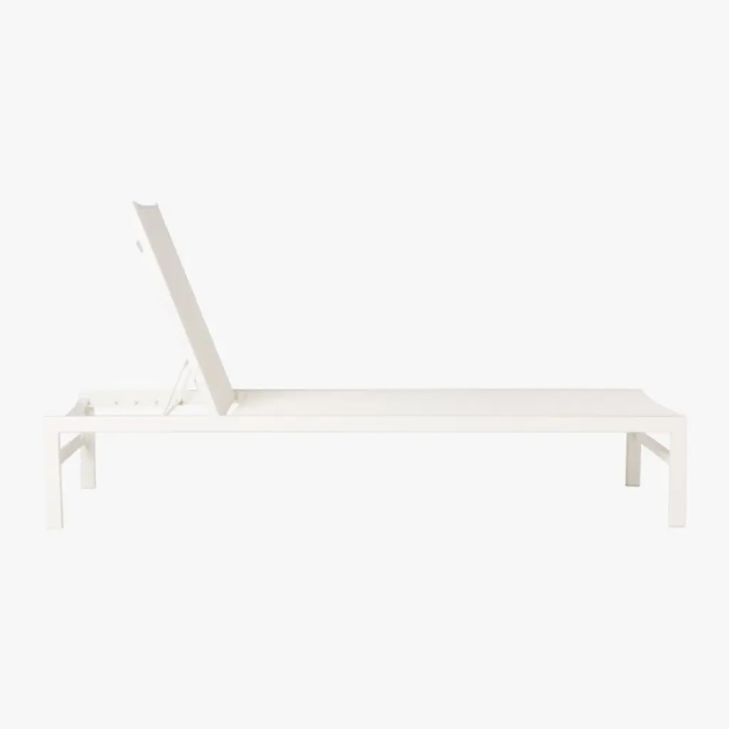 Sleek sun lounger basks in fresh white-on-white at a minimalist price. Ever cool, plastic-coated polymesh panels inset matte white aluminum frame. Adjusts to read upright, nap flat. CB2 exclusive.
