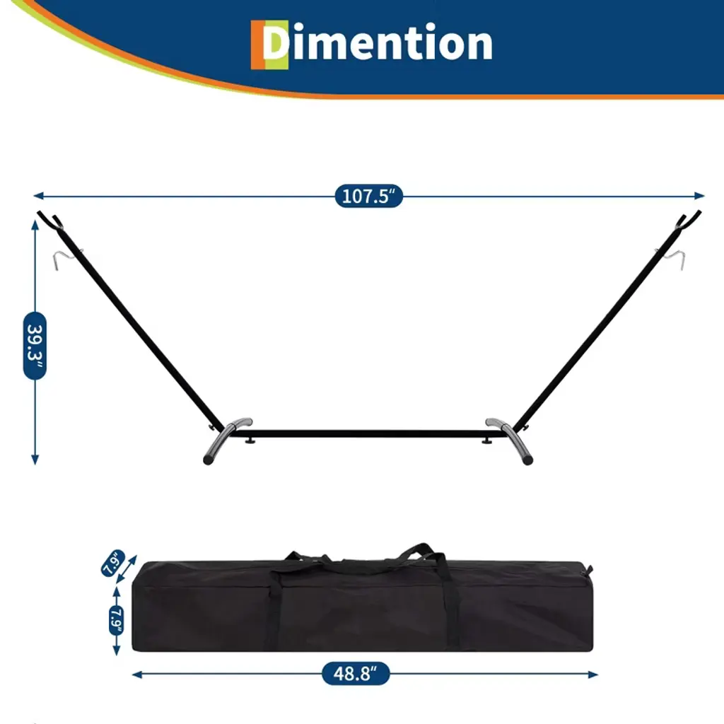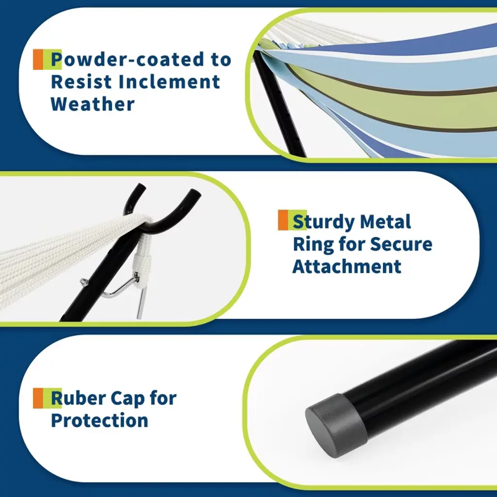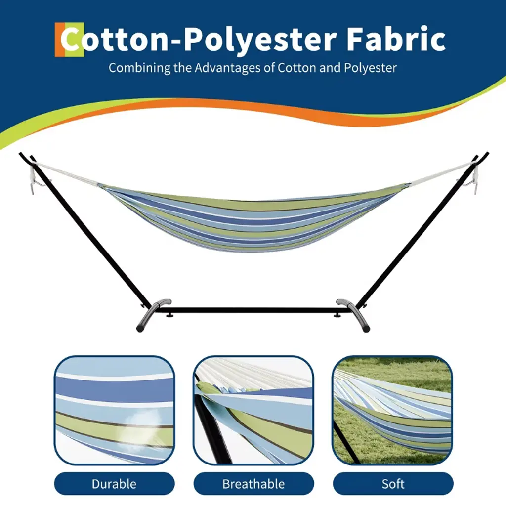 Portable Hammock with Stand ¨C 2-Person Heavy Duty Steel Frame for Camping, Garden & Beach (450lb Capacity + Carry Bag)Product Description:Stylish & Vibrant DesignInspired by passionate Brazilian style, our hammock features bold contrasting stripes and a sleek black steel frame, instantly elevating your outdoor space with a pop of color and relaxation.Ultra-Comfortable SupportMade with thicker, tightly woven cotton fabric, this hammock evenly distributes weight for superior comfort. The gently wrapped sides cradle you for a weightless lounging experience.Sturdy & Spacious for TwoBuilt with a reinforced alloy steel frame and heavy-duty metal buckles, this double hammock holds up to 450 lbs, comfortably seating two adults. Perfect for relaxing together in your backyard, at the campsite, or by the beach.Quick Setup, No Tools NeededDesigned for hassle-free assembly¡ªunpack, unfold, and enjoy in under 10 minutes! The intuitive frame requires no extra tools, so you can start relaxing instantly.Portable & Travel-FriendlyIncludes a durable nylon carry bag for easy transport. Take it anywhere¡ªcamping trips, beach outings, or backyard getaways¡ªand enjoy effortless comfort on the go.Specifications: Brand: TROPOW Material: Alloy Steel Frame + Woven Cotton Fabric Weight Capacity: 450 lbs (2-person) Dimensions (Assembled): 46.65"L x 9.06"W Included Accessories: Quick-fold nylon carry bag Setup: Tool-free assembly in minutes Ideal For: Gardens, camping, beaches, patios, and travel.