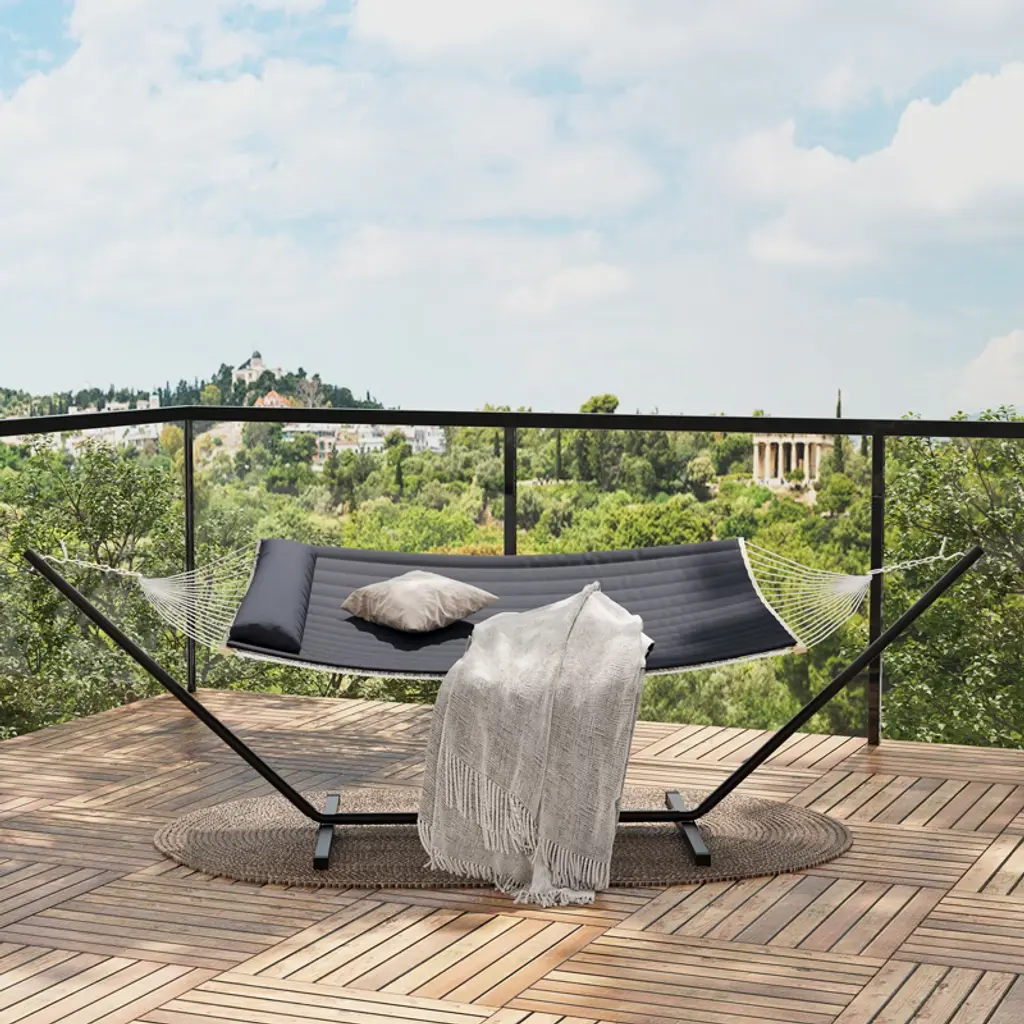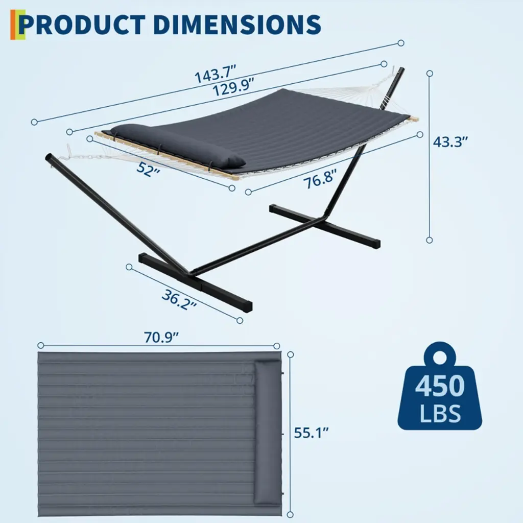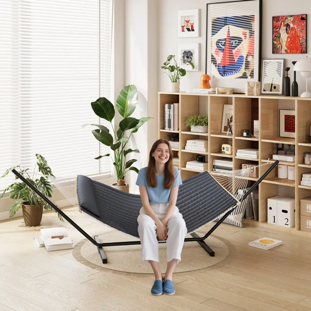 Experience the ultimate in outdoor relaxation with our Instant-Setup 2-Person Hammock featuring a reinforced steel frame. Designed with passionate Brazilian style, its vibrant contrasting color stripes paired with a sleek black steel stand create a stunning centerpiece for your garden, camping site, or beach outing.Crafted from thicker, tightly woven cotton, this hammock provides unparalleled comfort by evenly spreading your weight across the center while the soft fabric gently wraps around you, delivering a gravity-free lounging experience. The durable steel stand and sturdy metal buckle hooks ensure a robust structure capable of supporting up to 450 pounds, making it perfect for two people to enjoy together.Installation is a breeze with our simple, tool-free design—set up your hammock in just 10 minutes and start relaxing right away. Plus, it comes with a convenient nylon travel bag, making it easy to carry and perfect for camping trips, beach days, or any outdoor adventure.Points:- Vibrant Brazilian-inspired design adds a lively touch to your outdoor space- Thick, tightly woven cotton fabric for superior comfort and support- Heavy-duty steel frame and metal buckle hooks support up to 450 lbs- Quick and easy tool-free setup in just 10 minutes- Includes a durable nylon travel bag for portability and convenienceWhether you're looking to unwind in your backyard or take relaxation on the road, this 2-person hammock combines style, comfort, and durability for the perfect outdoor lounger.