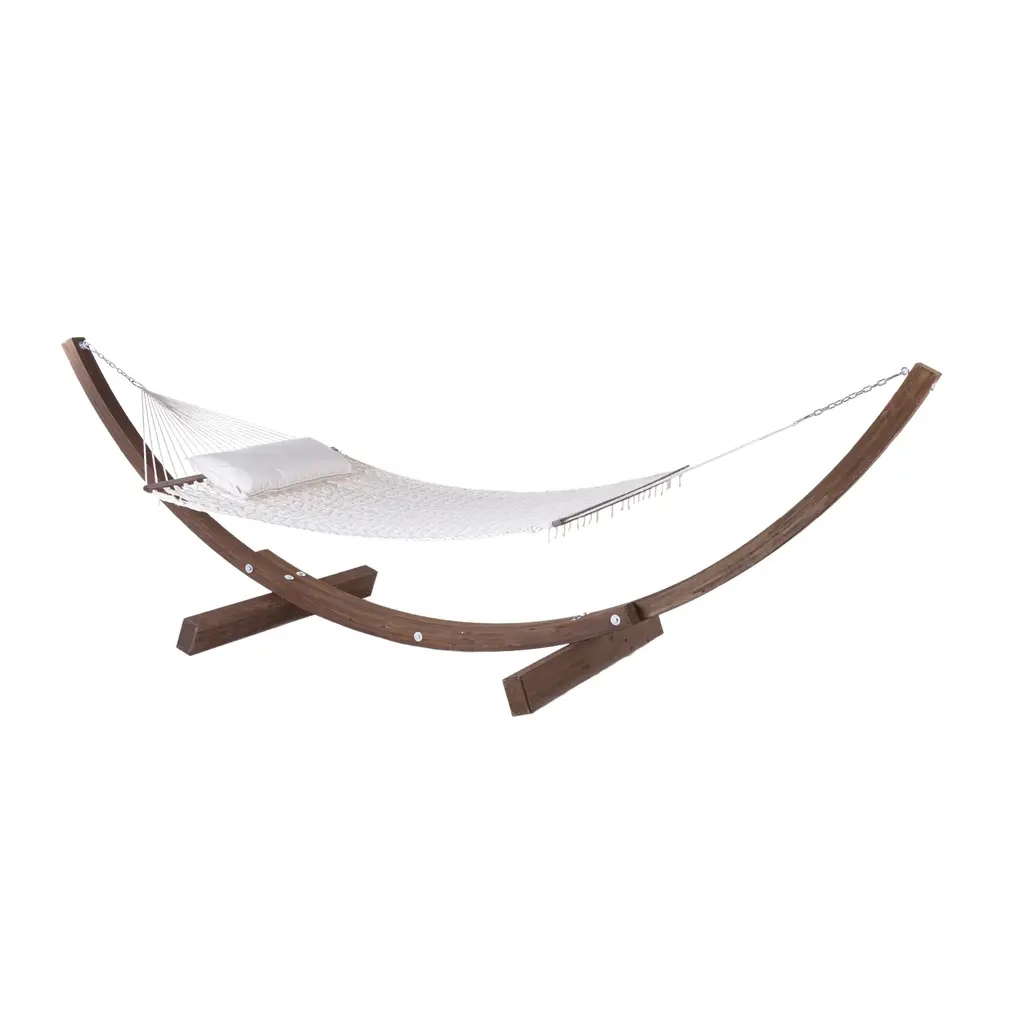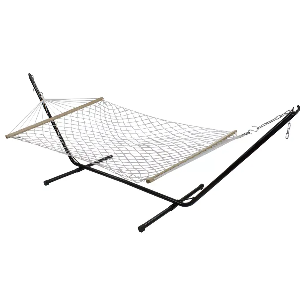 Experience the ultimate in outdoor relaxation with our Instant-Setup 2-Person Hammock featuring a reinforced steel frame. Designed with passionate Brazilian style, its vibrant contrasting color stripes paired with a sleek black steel stand create a stunning centerpiece for your garden, camping site, or beach outing.Crafted from thicker, tightly woven cotton, this hammock provides unparalleled comfort by evenly spreading your weight across the center while the soft fabric gently wraps around you, delivering a gravity-free lounging experience. The durable steel stand and sturdy metal buckle hooks ensure a robust structure capable of supporting up to 450 pounds, making it perfect for two people to enjoy together.Installation is a breeze with our simple, tool-free design—set up your hammock in just 10 minutes and start relaxing right away. Plus, it comes with a convenient nylon travel bag, making it easy to carry and perfect for camping trips, beach days, or any outdoor adventure.Points:- Vibrant Brazilian-inspired design adds a lively touch to your outdoor space- Thick, tightly woven cotton fabric for superior comfort and support- Heavy-duty steel frame and metal buckle hooks support up to 450 lbs- Quick and easy tool-free setup in just 10 minutes- Includes a durable nylon travel bag for portability and convenienceWhether you're looking to unwind in your backyard or take relaxation on the road, this 2-person hammock combines style, comfort, and durability for the perfect outdoor lounger.