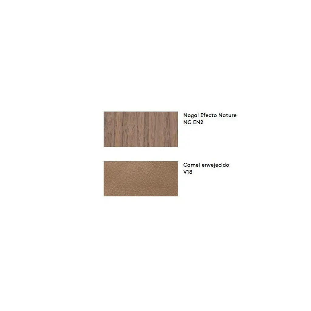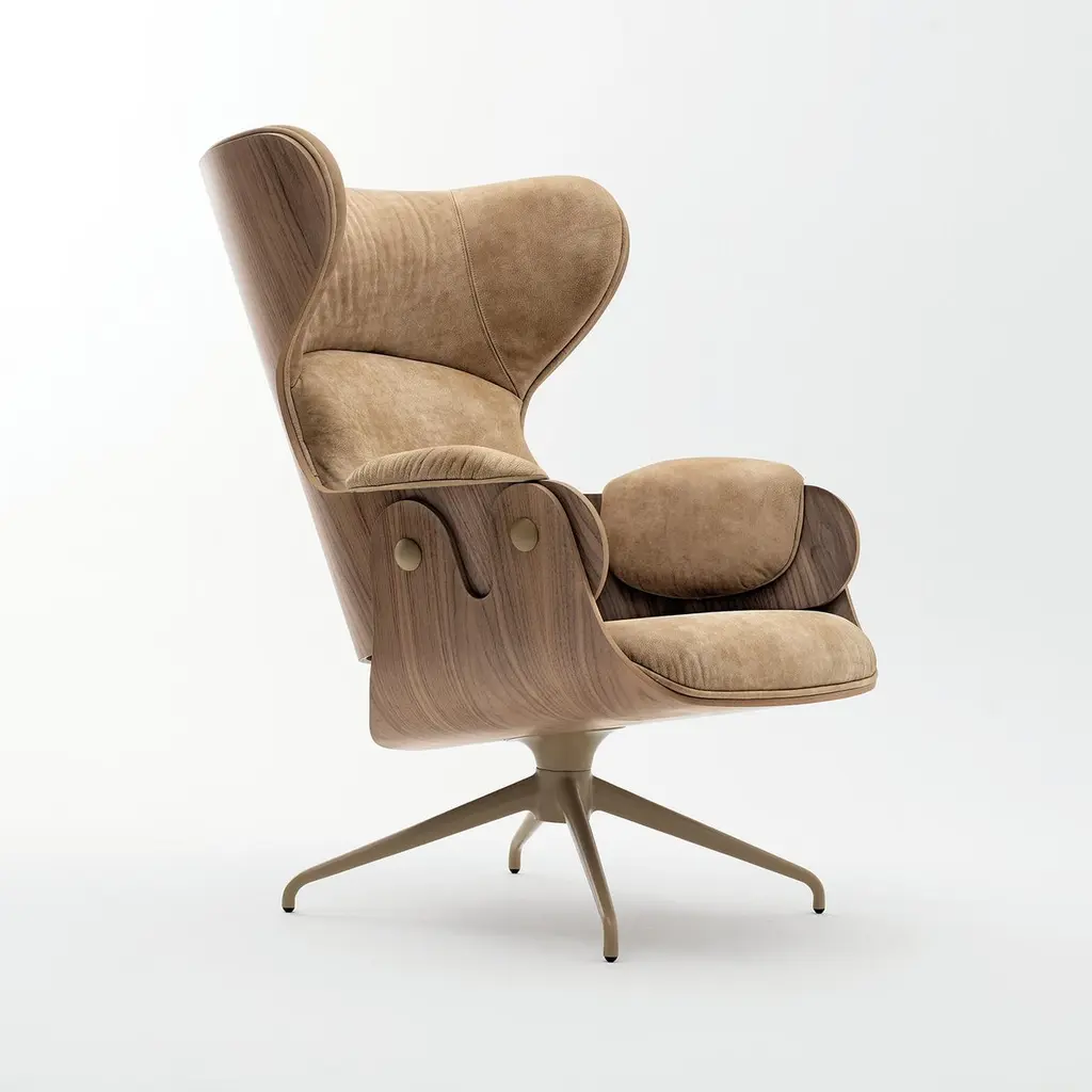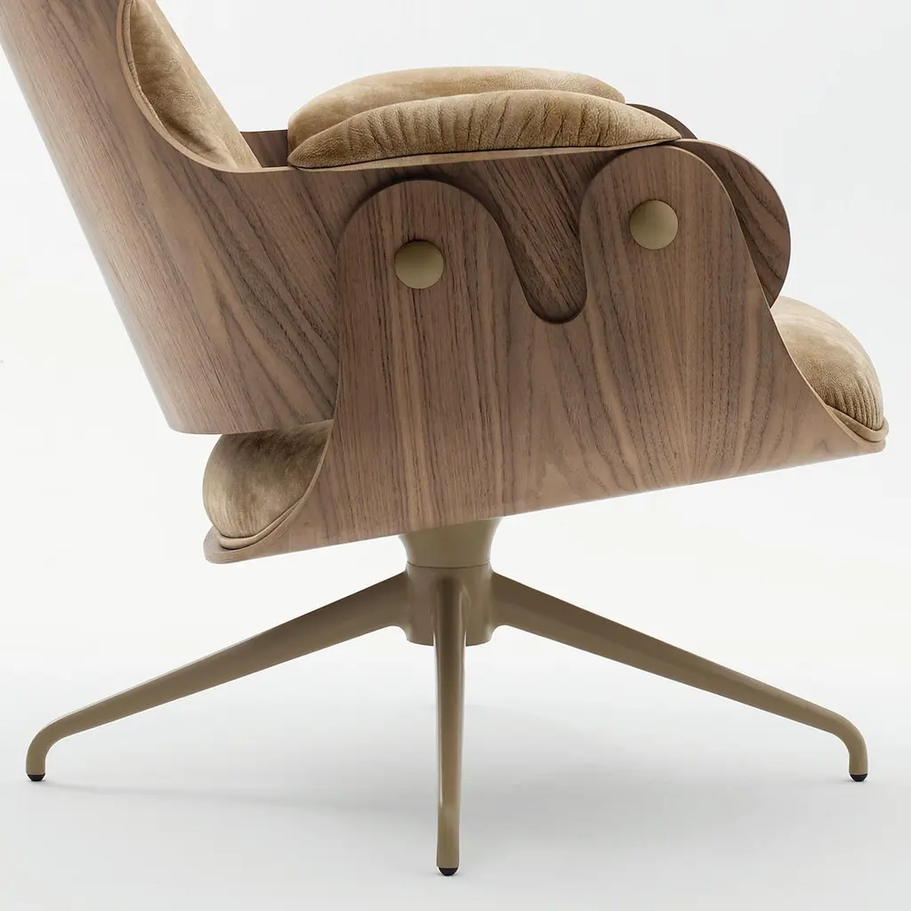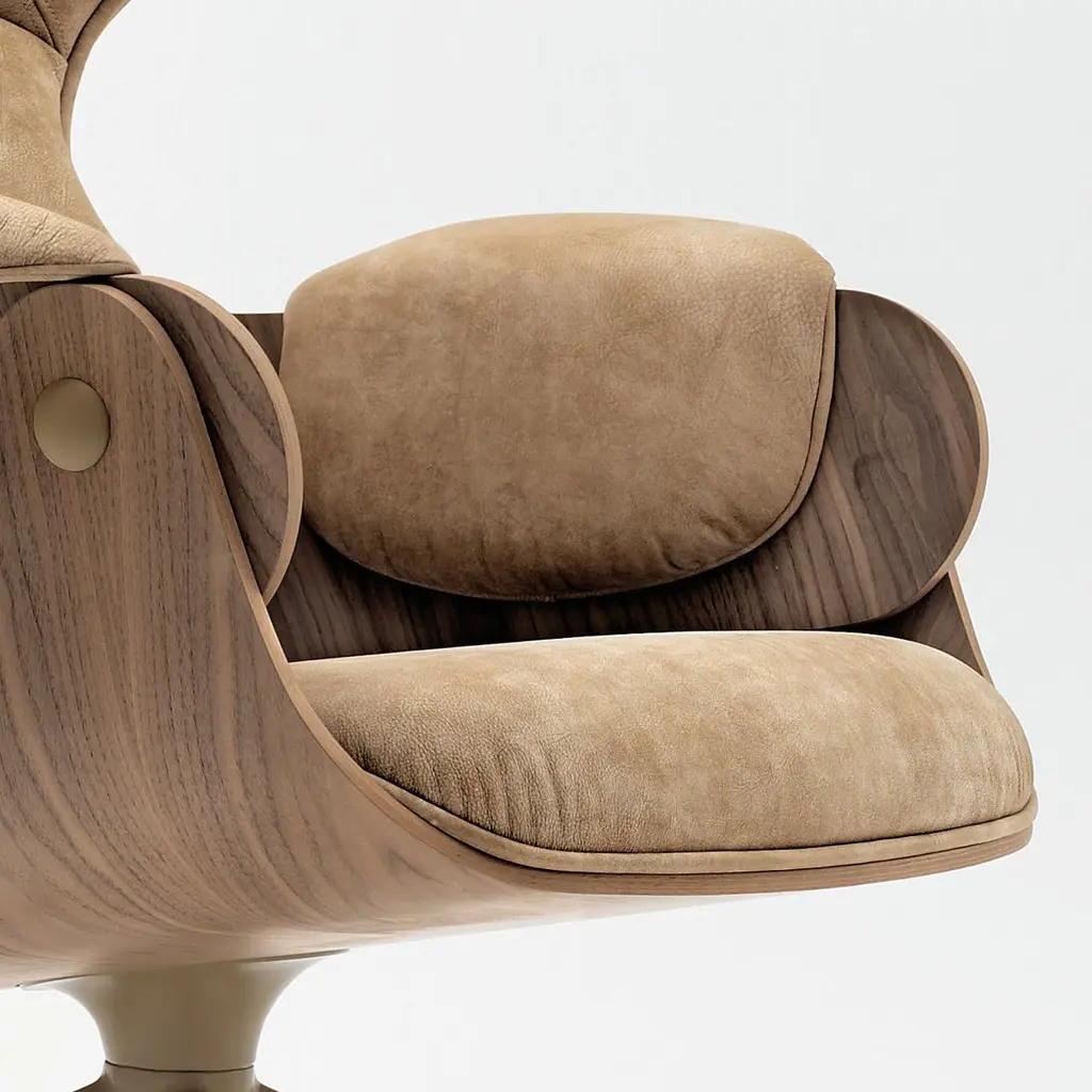 Armchair structure base in cast aluminium.Seat, backrest are in plywood with exteriors in walnut nature effect NG EN2Upholstered in Aged camel V18Various fabrics and leathers available.
