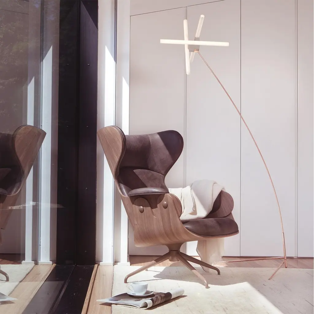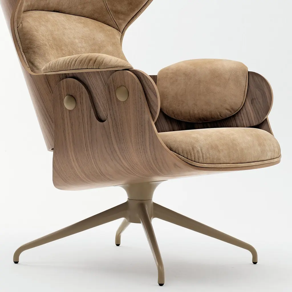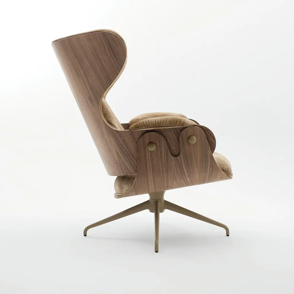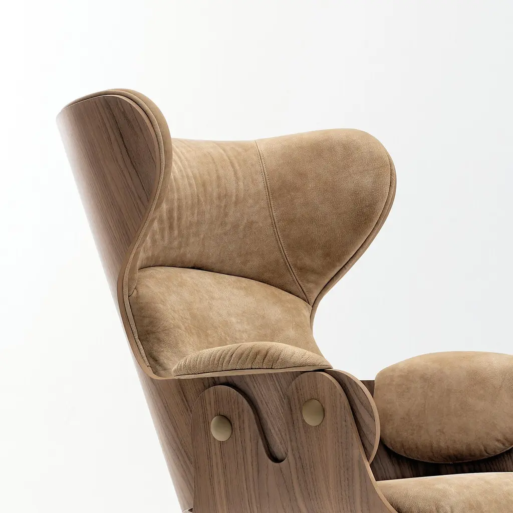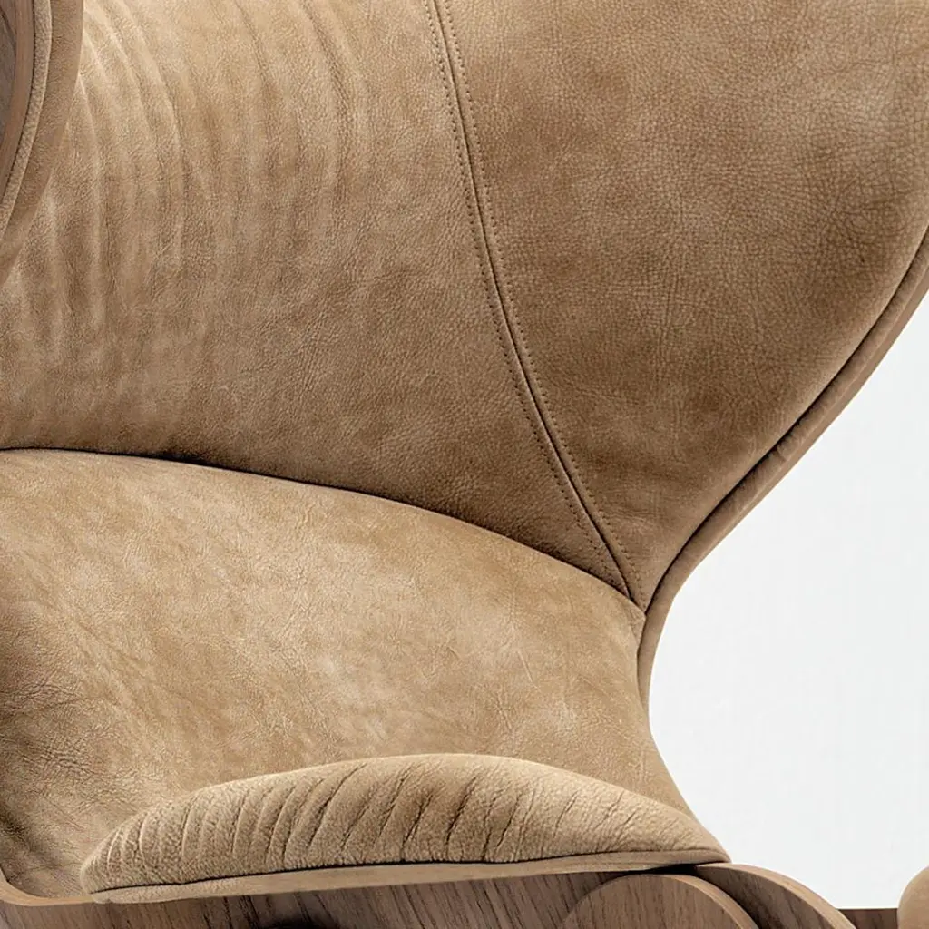 Armchair structure base in cast aluminium.Seat, backrest are in plywood with exteriors in walnut nature effect NG EN2Upholstered in Aged camel V18Various fabrics and leathers available.