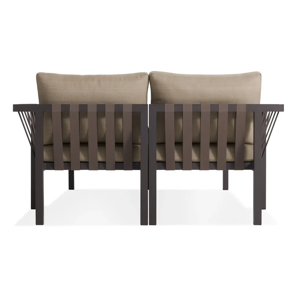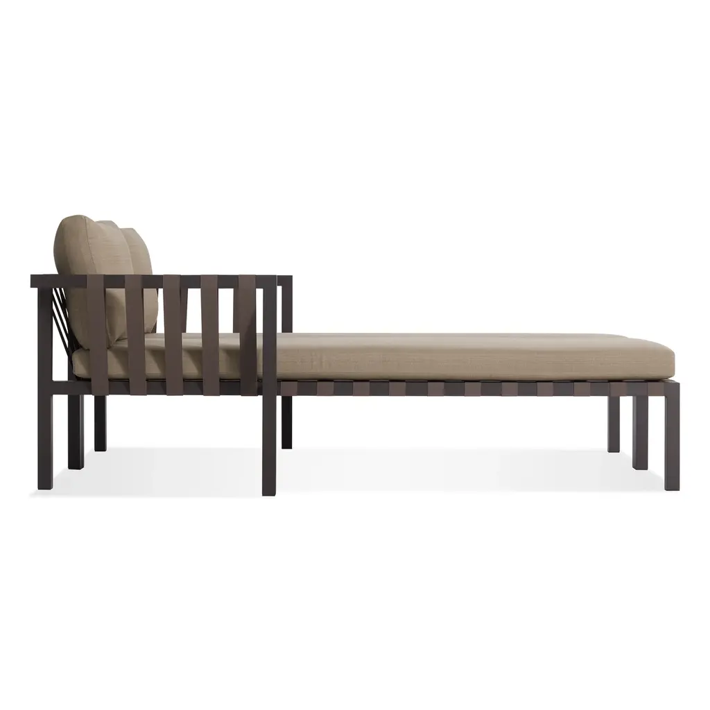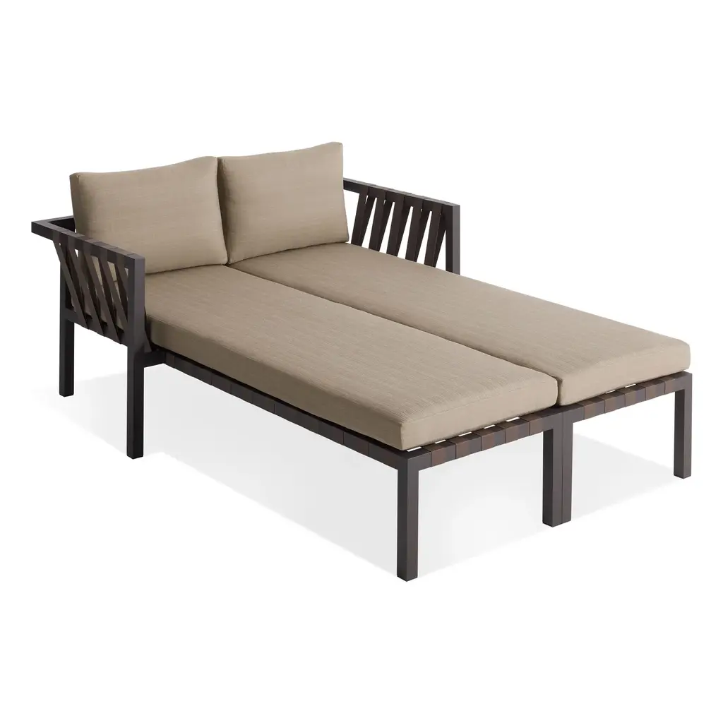 A pair of beefy anodized aluminum frame, nylon support straps, and antimicrobial foam upholstered in resilient canvas or taupe Sunbrella® fabric team up to make an outdoor seating solution.