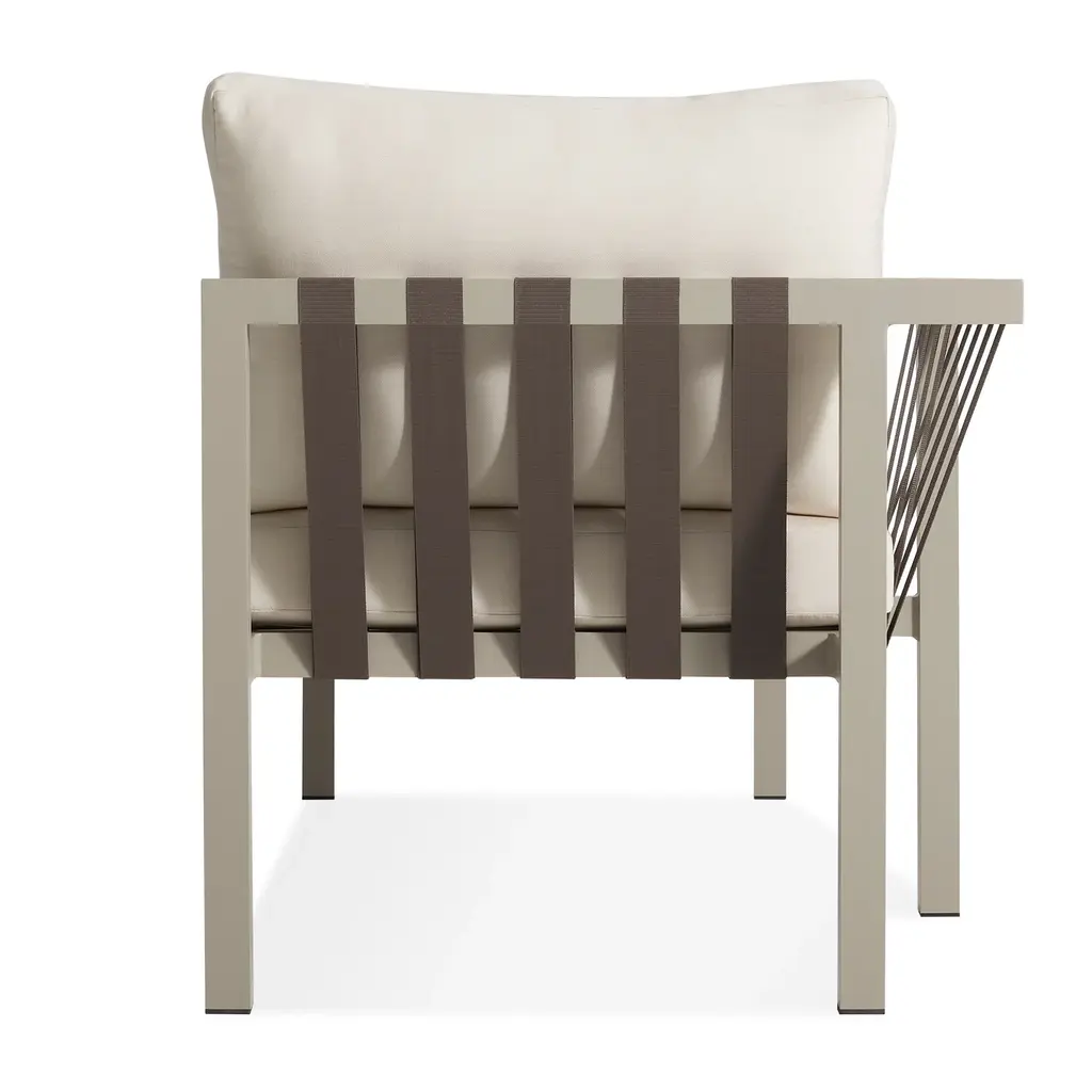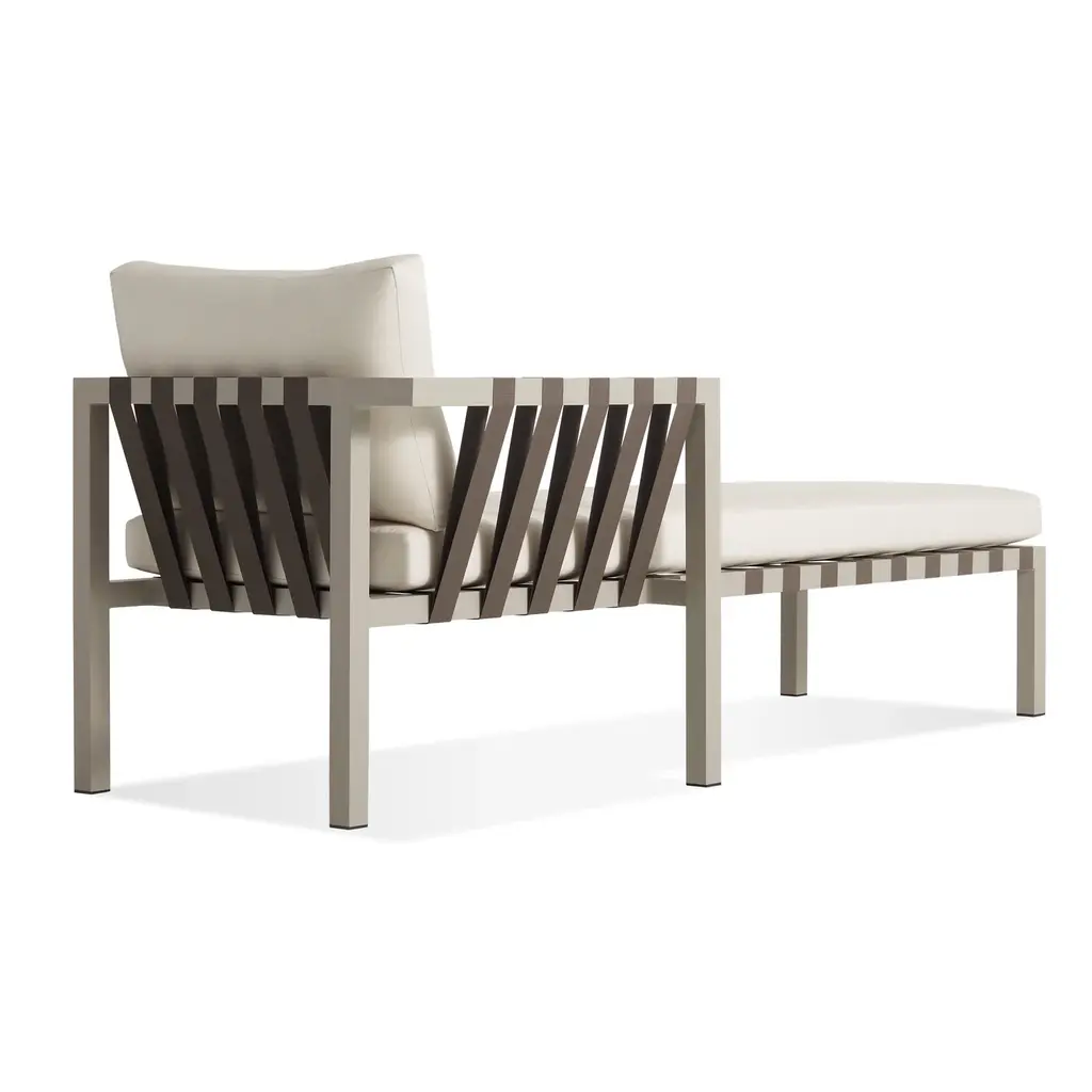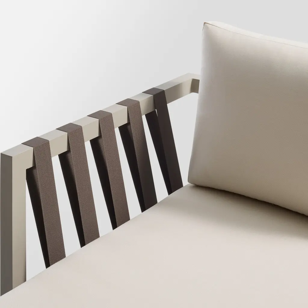 A beefy anodized aluminum frame, nylon support straps, and antimicrobial foam upholstered in resilient canvas or taupe Sunbrella® fabric team up to make an outdoor seating solution.