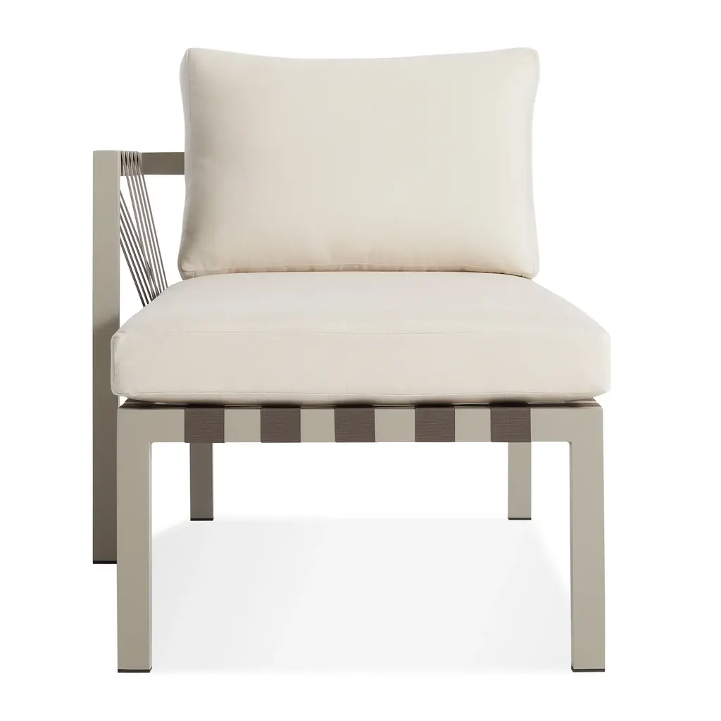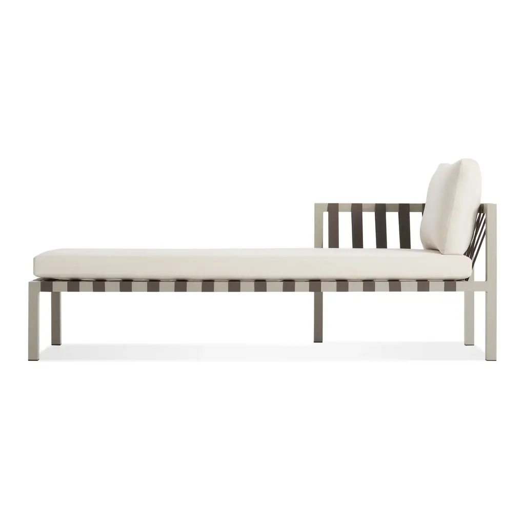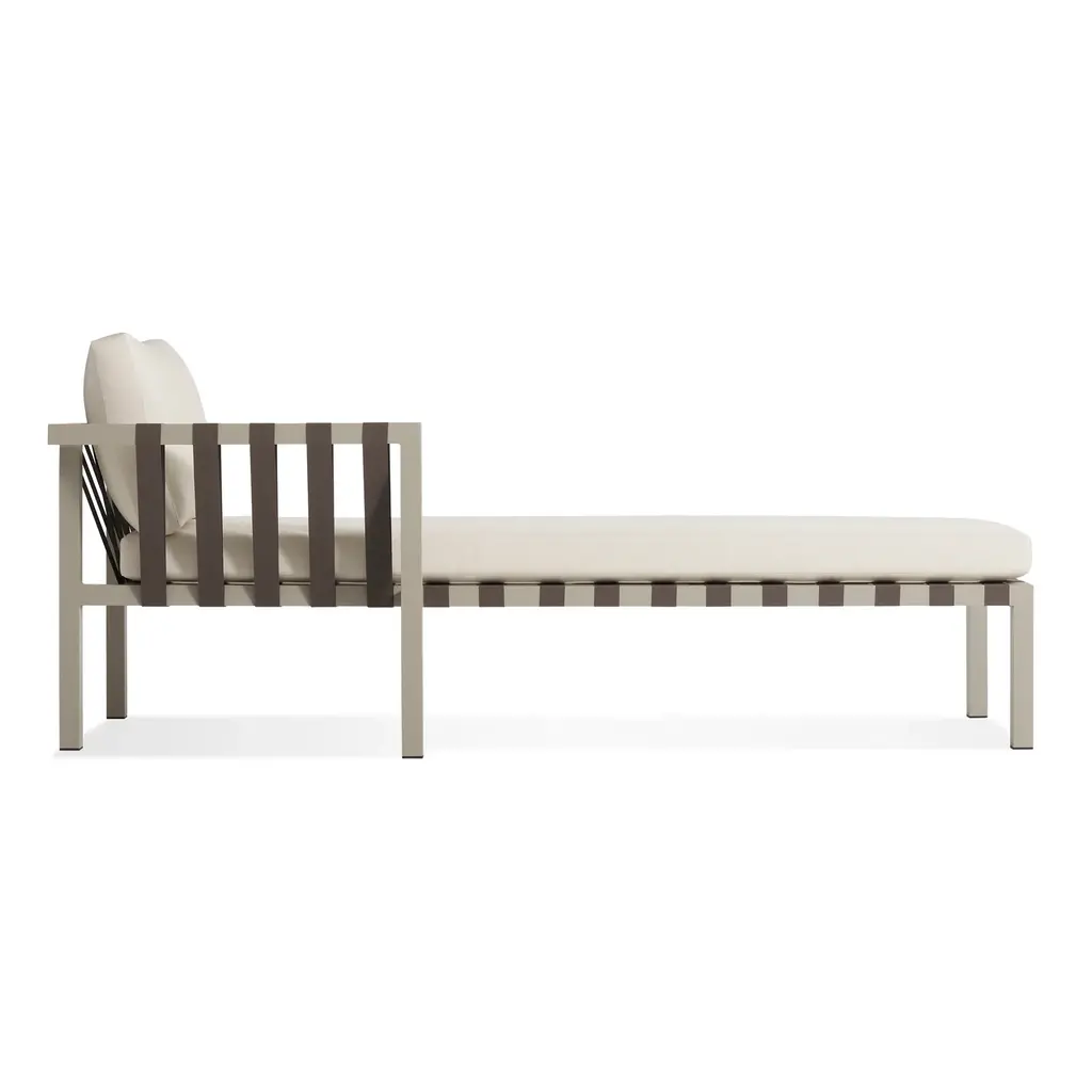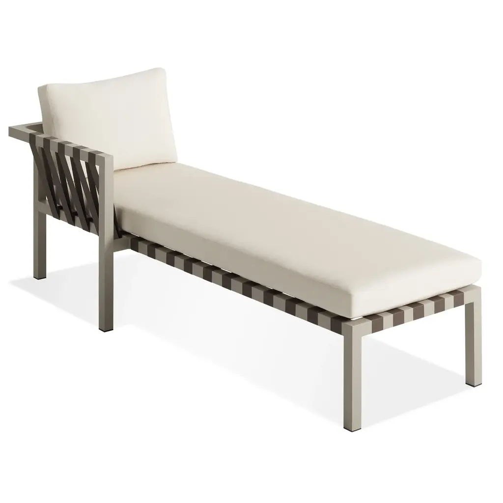 A beefy anodized aluminum frame, nylon support straps, and antimicrobial foam upholstered in resilient canvas or taupe Sunbrella® fabric team up to make an outdoor seating solution.