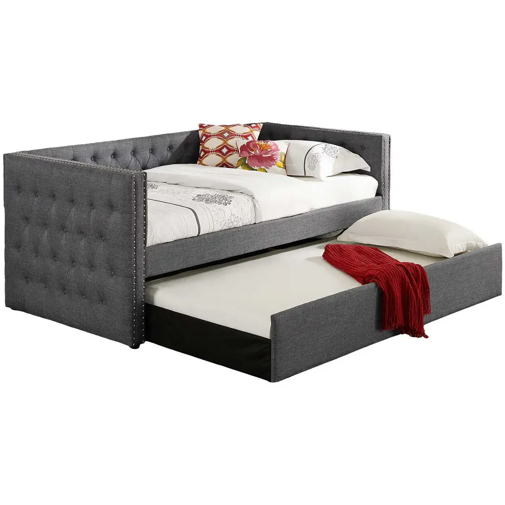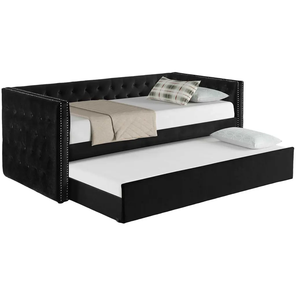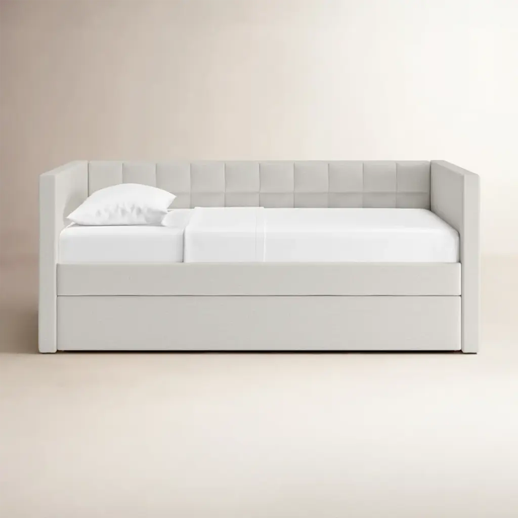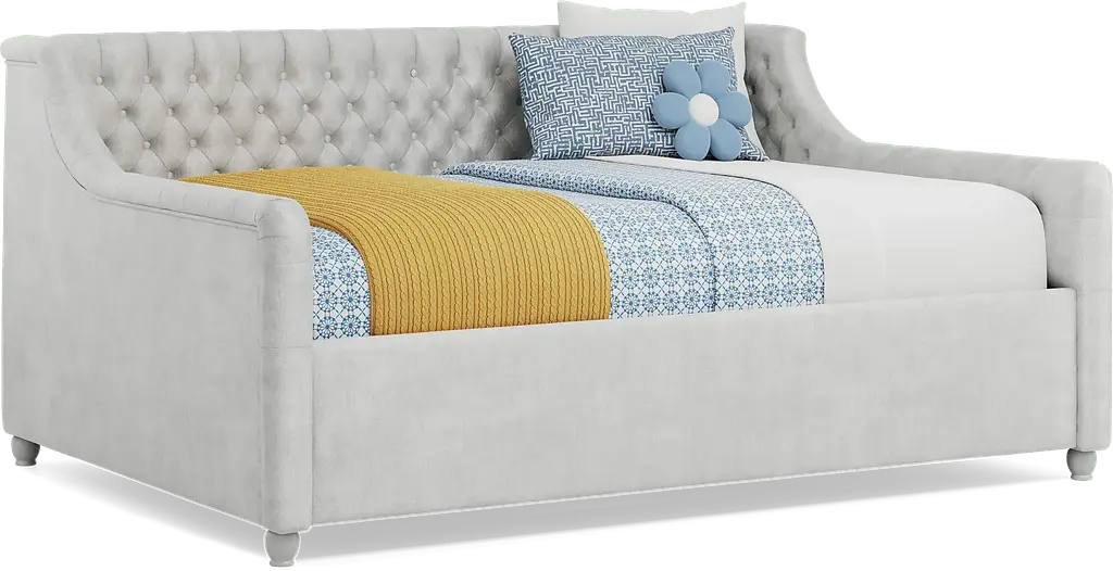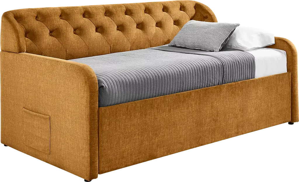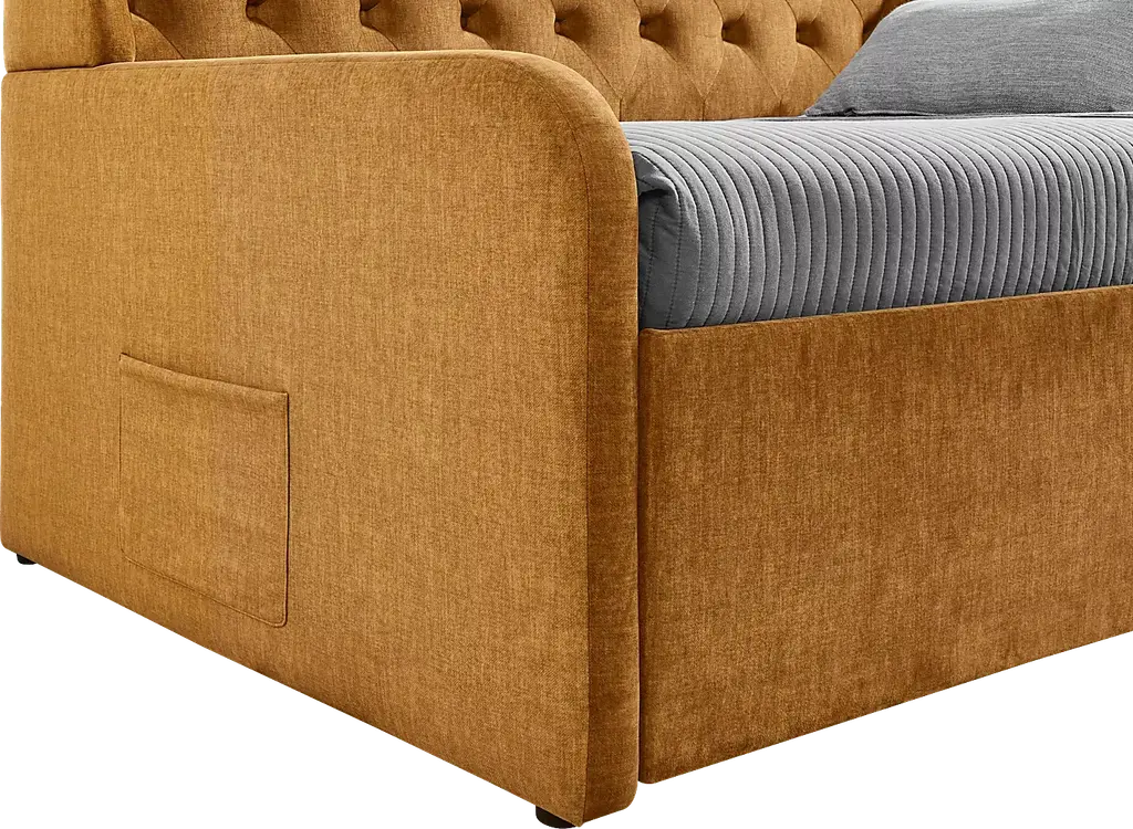 The sophistication of a boutique retreat comes home with the Juliet daybed's tailored details, gentle curves and straight lines creating a space that's as stylish as it is restful. The soft amber brown upholstery is accentuated by gorgeous deep tufting along the backboard, introducing a classic yet contemporary flair. Waterfall edges curate a graceful silhouette evoking effortless elegance. Store slim books, magazines, or remotes in the side pockets that blend seamlessly into the outer arm panel. Mattress and foundation (if required) sold separately. Upholstery: 100% polyester.