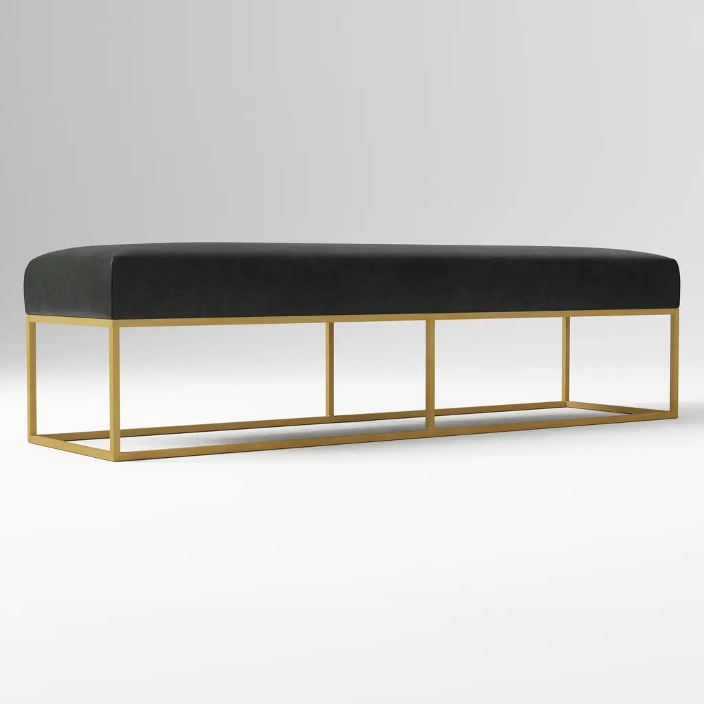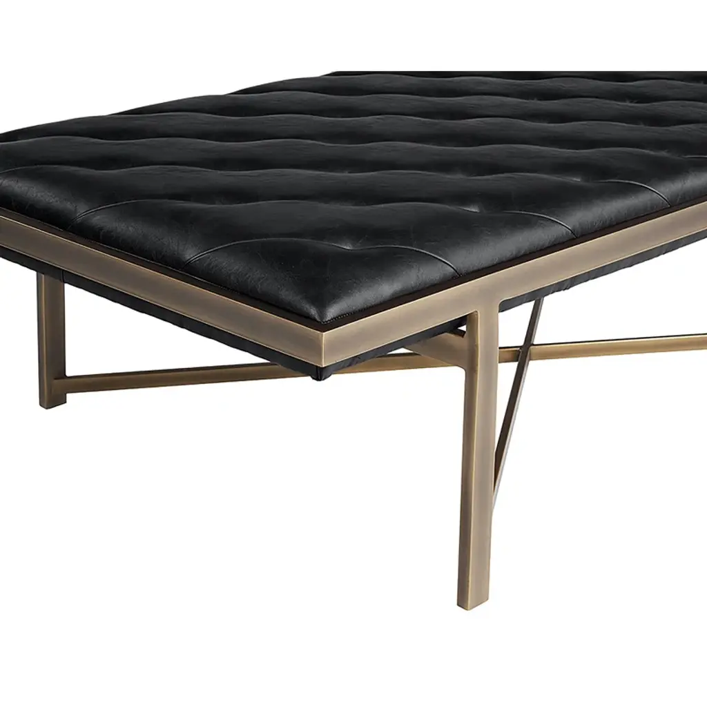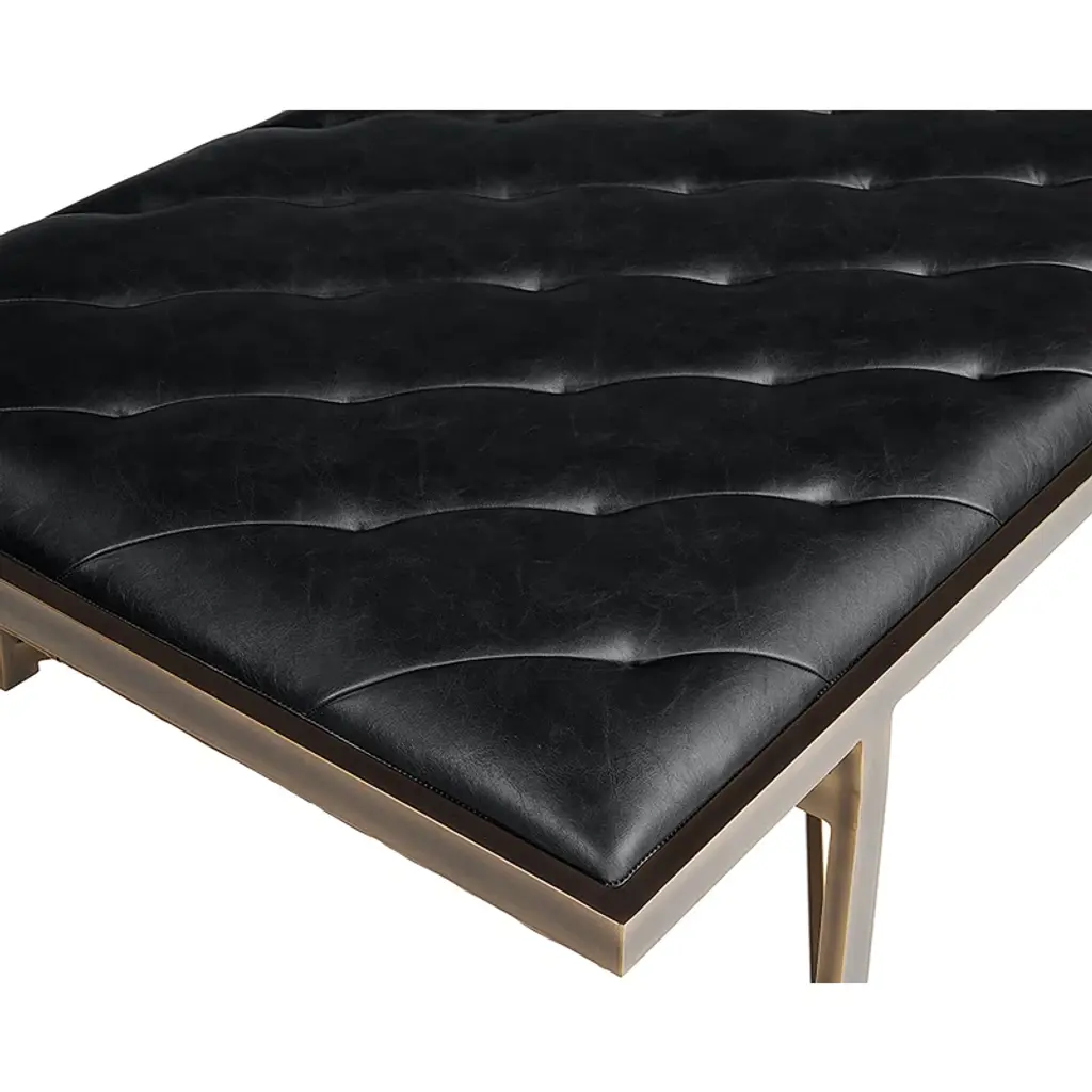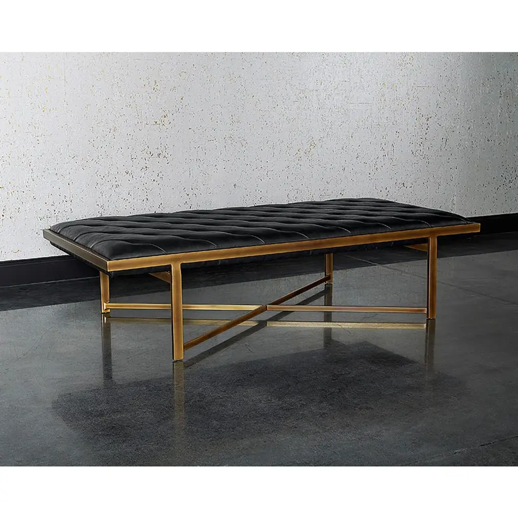 This large bench from our Irongate collection exudes opulent transitional style. Features diagonal tufting with an exposed x-base frame. Stocked in vintage cognac faux leather with an antique brass frame. Can be used as a daybed, coffee table or as extra seating in residential and commercial spaces. Handle With Care: This design has been crafted with faux leather. Faux leather is manufactured to reflect the natural characteristics of leather; as such, markings, wrinkles, grooves, and light scratches are appreciated characteristics. No two pieces will be alike. Visit our Product Care page for more information on how to ensure the lasting beauty of this piece. Handle With Care: This design has been crafted with faux leather. Faux leather is manufactured to reflect the natural characteristics of leather; as such, colour variations, markings, wrinkles, grooves, and light scratches are appreciated characteristics. No two pieces will be alike. Visit our Product Care page for more information on how to ensure the lasting beauty of this piece.