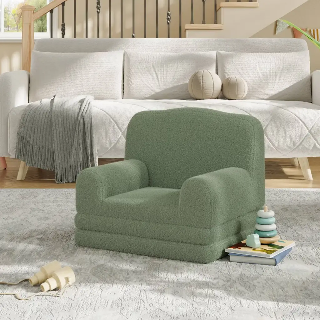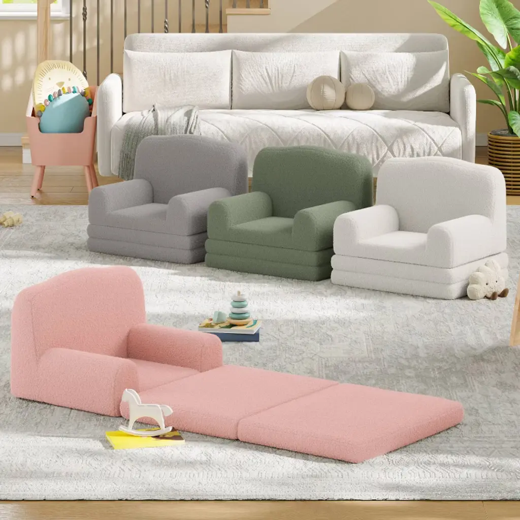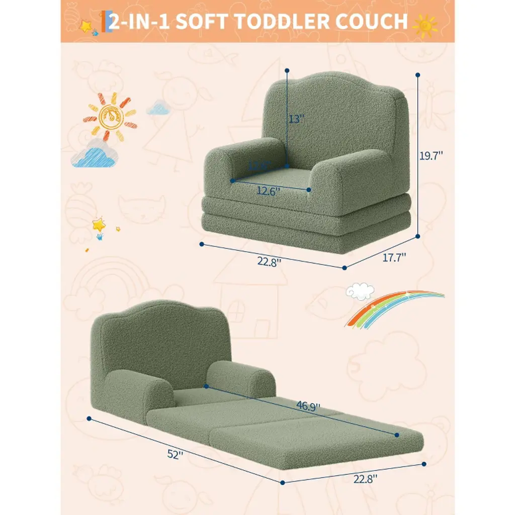 Looking for a kids sofa that's as playful as your child? Imagine a cozy, lightweight couch that instantly transforms into a lounger for naps or playtime¡ªwouldn't your little one love their own special spot to relax and have fun? Highlights at a Glance: unique wave design lightweight and portable 2-in-1 convertible couch high-density sponge support machine-washable cover vibrant color options anti-slip pad perfect for reading and napping Specification: Material: Teddy Fleece Fabric + Sponge Product Dimension: 17.7"D x 22.8"W x 19.7"H Color: Grey/ Green/ Pink/ White Packing List: 1 x Convertible Toddler Sofa Chair 1 x Instruction Manual Friendly Note: Adult supervision is recommended. Do not stand or jump on the sofa to prevent damage or injury. Avoid exposure to direct sunlight or heat sources to maintain color and shape.