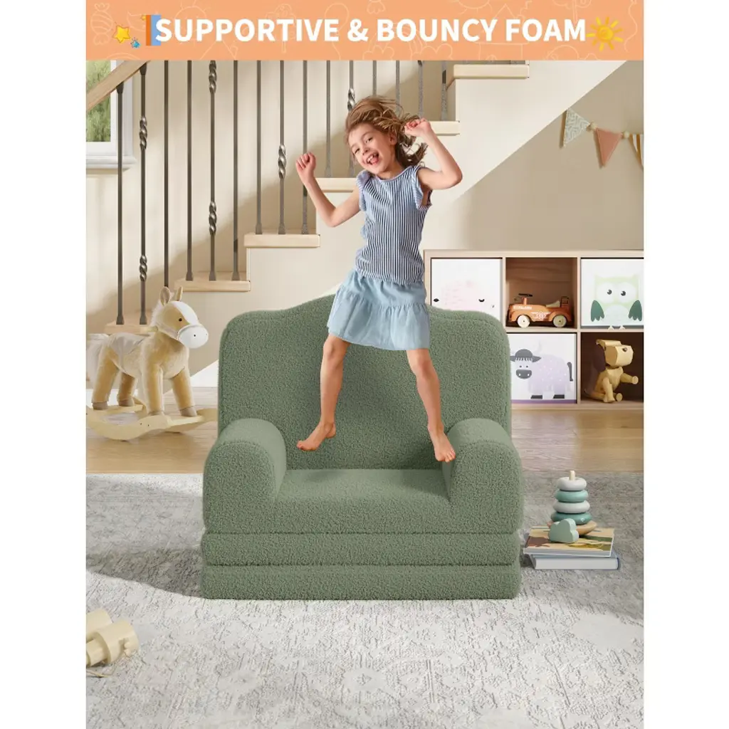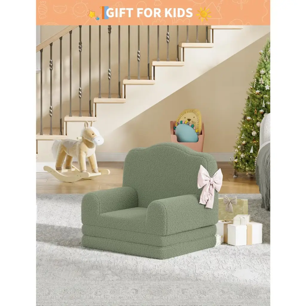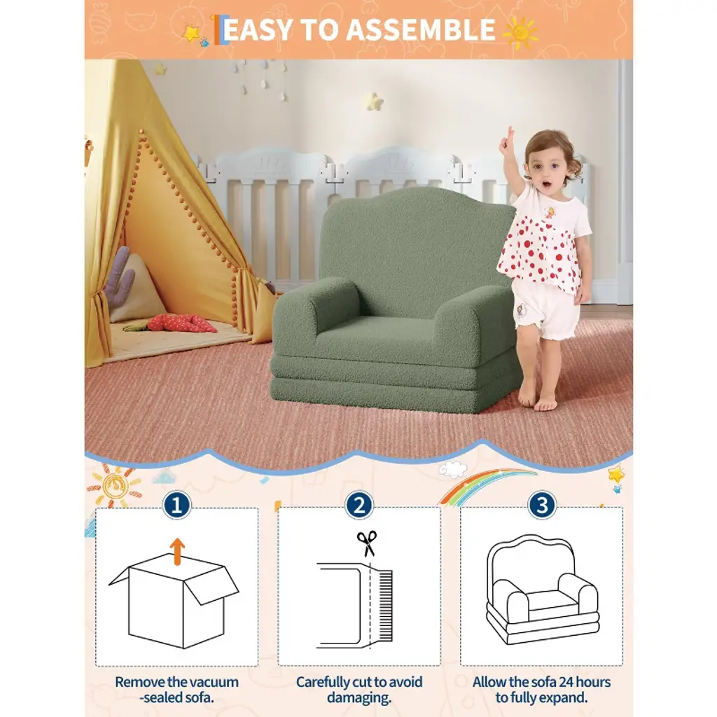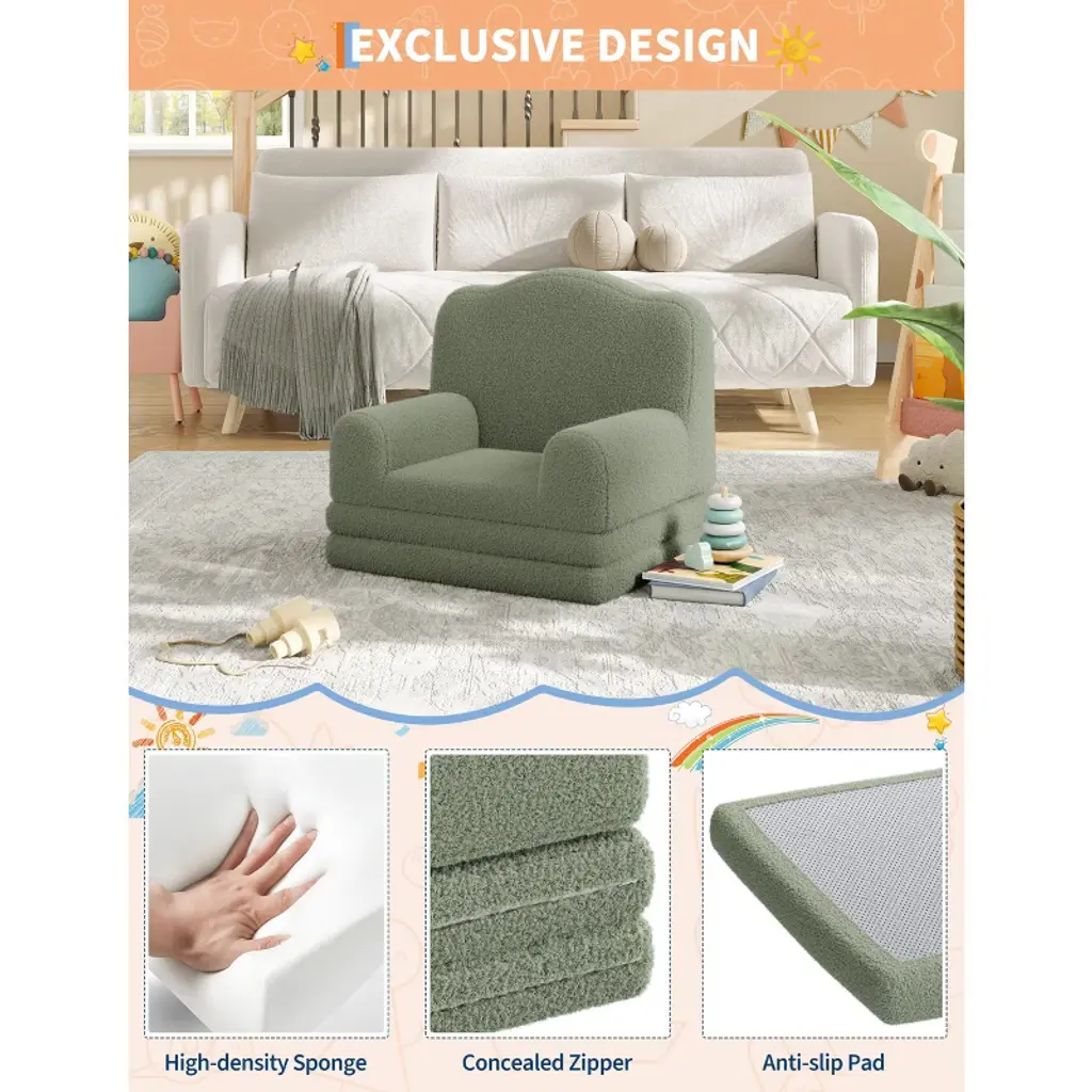 Product DescriptionLooking for a kids sofa that's as fun as it is functional? Imagine your child curling up with their favorite book or transforming their chair into a cozy bed for an afternoon nap—where would your little one love to relax most?Highlights at a Glance:Adorable crown design in 4 colors2-in-1 convertible couch and loungerHigh-density sponge for ergonomic comfortRemovable, washable coverLightweight and portable for any roomSpecification:Product Dimension: 17.7"D x 22.8"W x 19.7"HColor: Grey/ Green/ Pink/ WhitePacking List:1 x Convertible Toddler Sofa1 x Instruction ManualFriendly Note:Adult supervision is recommended.Do not stand or jump on the sofa to prevent damage or injury.Avoid exposure to direct sunlight or heat sources to maintain color and shape.