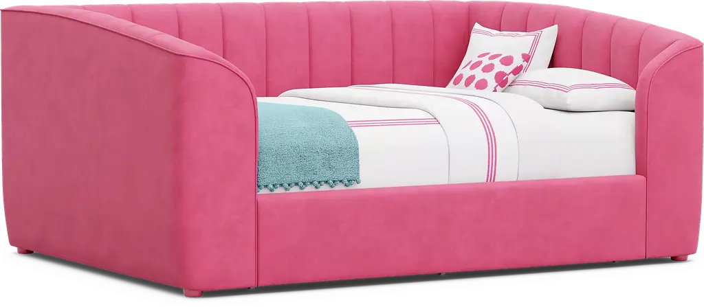 Soft, sweet and altogether spectacular, the Gwyneth daybed is a gem for any kid's room. Fully upholstered with soft fabric in a bubble gum pink color, this full daybed features a high back and sides with vertical channeling for a cozy, lounge-ready look. A single storage drawer is built into the base of the frame, offering a smart solution for stashing bedding, toys, or clothes. Ball bearing glides make opening and closing the drawer easy. The drawer even comes with a divider that makes staying organized even easier. Mattress and foundation (if required) sold separately.
