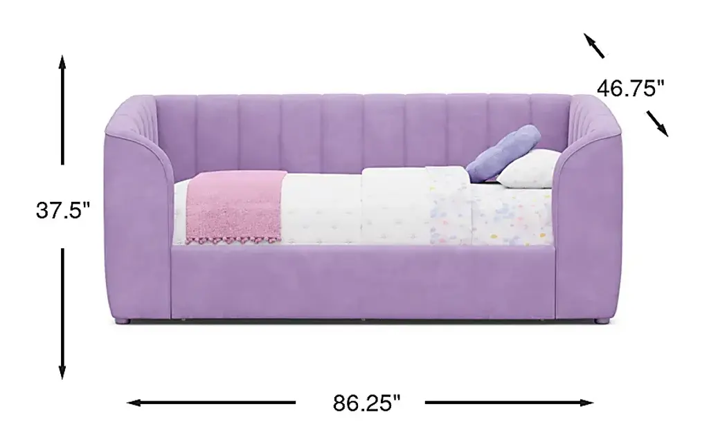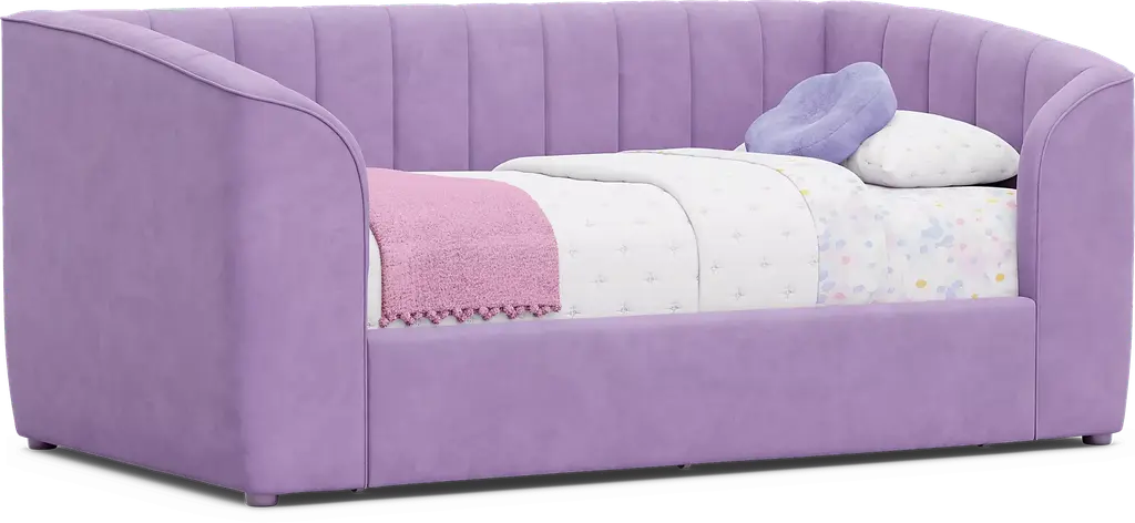 Soft, sweet and altogether spectacular, the Gwyneth daybed is a gem for any kid's room. Fully upholstered with soft fabric in a lavender color, this twin daybed features a high back and sides with vertical channeling for a cozy, lounge-ready look. A single storage drawer is built into the base of the frame, offering a smart solution for stashing bedding, toys, or clothes. Ball bearing glides make opening and closing the drawer easy. The drawer even comes with a divider that makes staying organized even easier. Mattress and foundation (if required) sold separately.