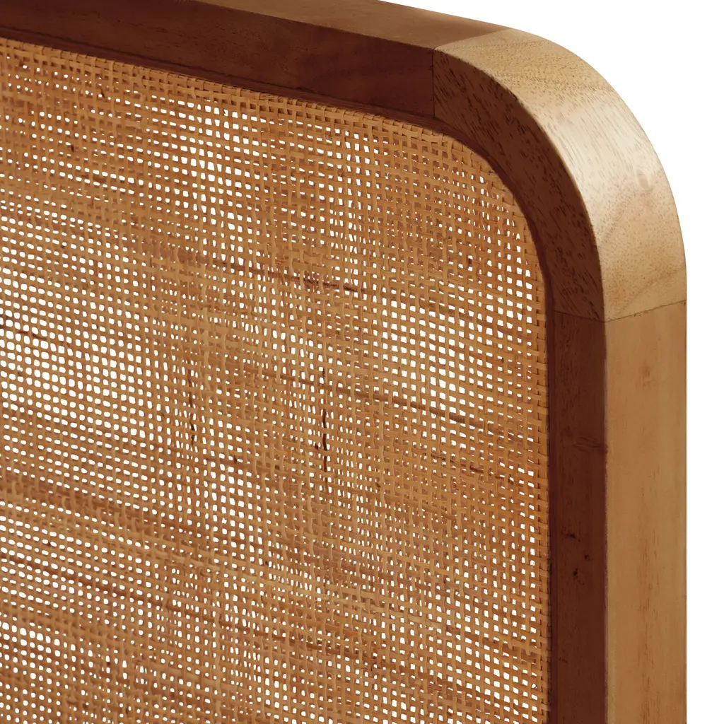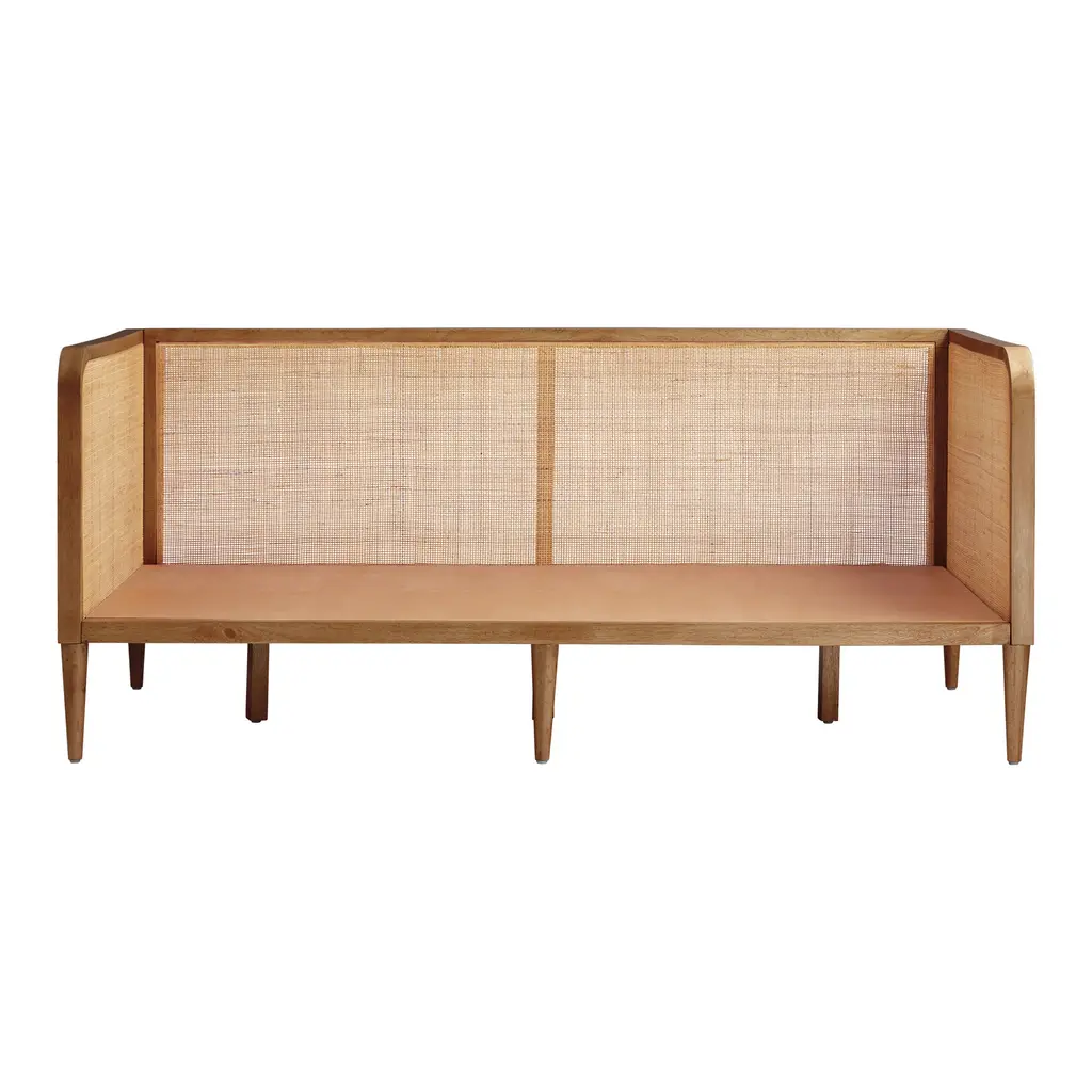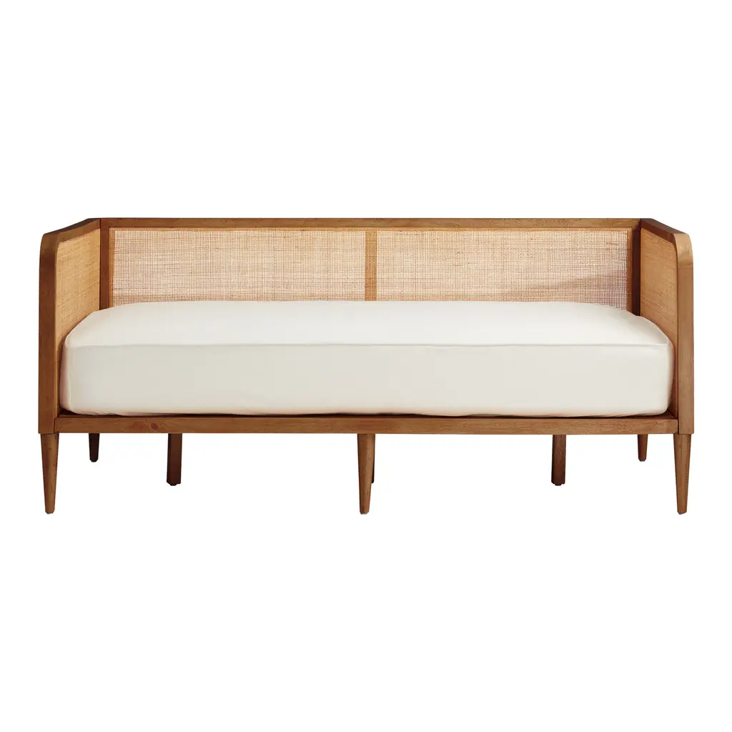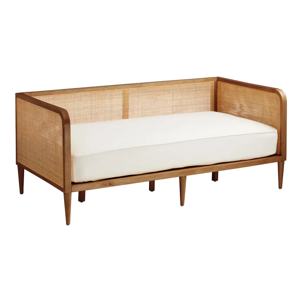 Featuring a clean-lined wooden frame adorned with gauzy webbed panels of rattan cane, our Kira daybed frame shines natural warmth into the studio, office or spare room. Handmade by artisans in Indonesia, its organic look styles with a variety of wood finishes, natural fiber furnishings and decor from boho to modern. When not accommodating a guest, it's a perfectly cozy occasional seat that fits compactly into your living space.