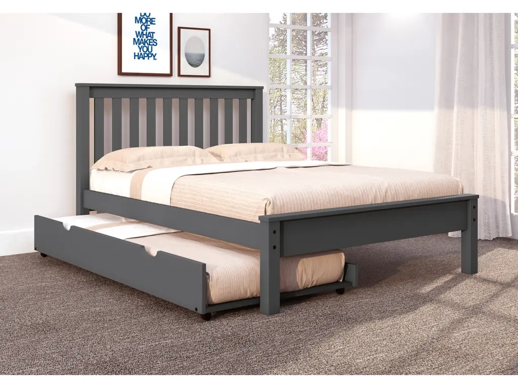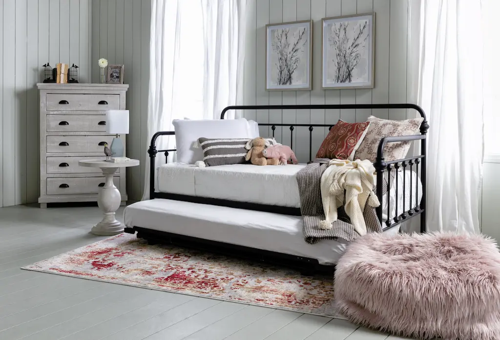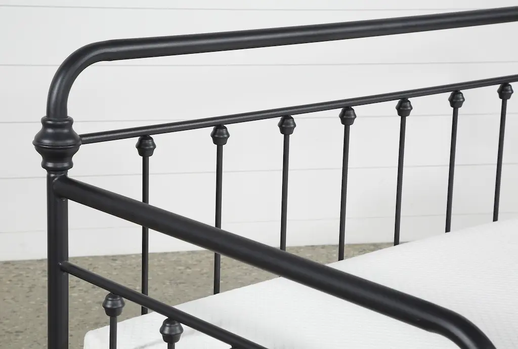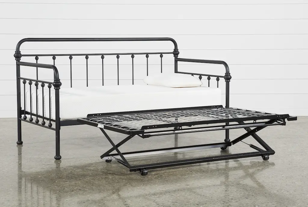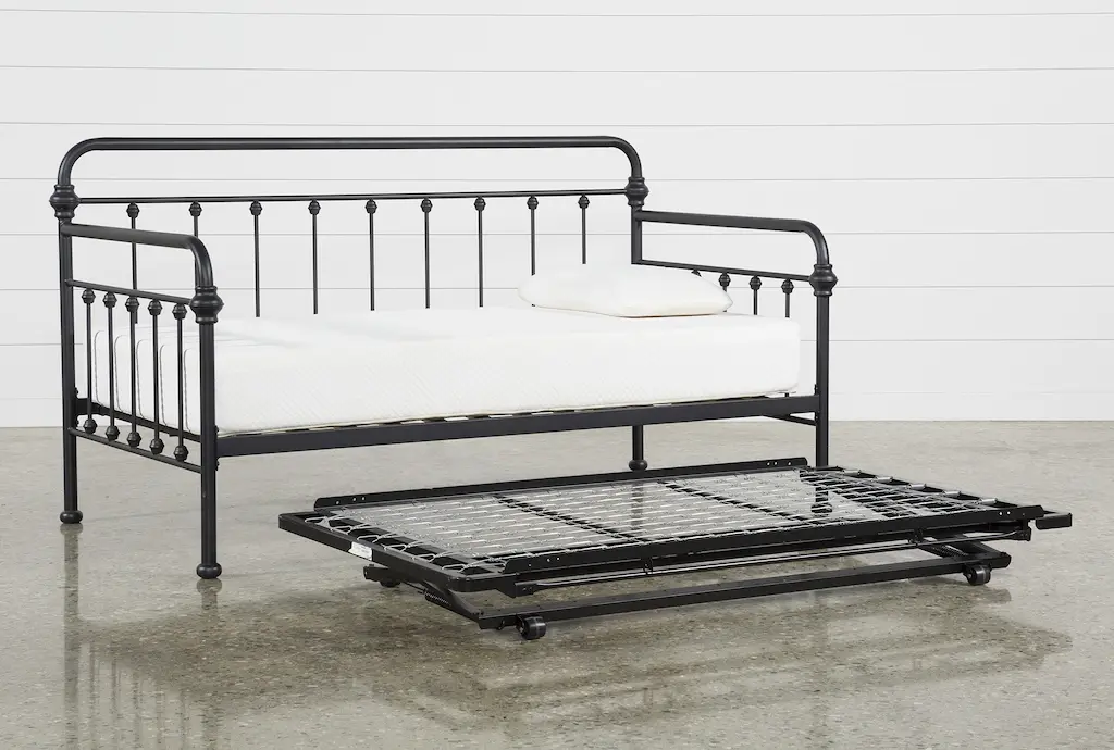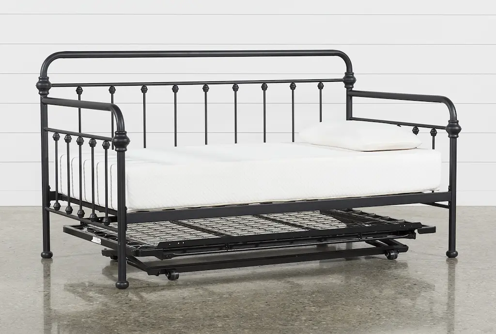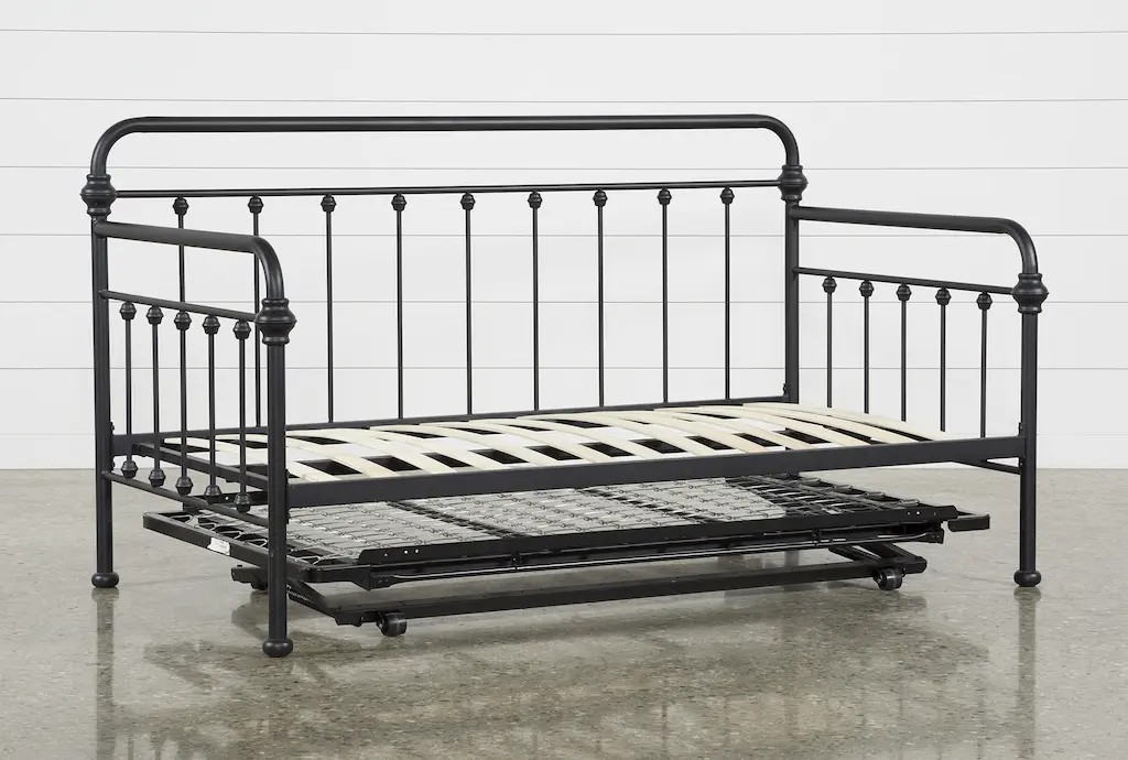 Inspired by traditional Victorian brass beds, our Knox metal twin daybed brings streamlined vintage style to any space. Steel in a textured stain black finish lends durability, distinction and industrial flair to this design, which is the perfect size, shape and value for kids rooms and guest rooms. This version even comes with a pop-up trundle, which is perfect for sleepovers.