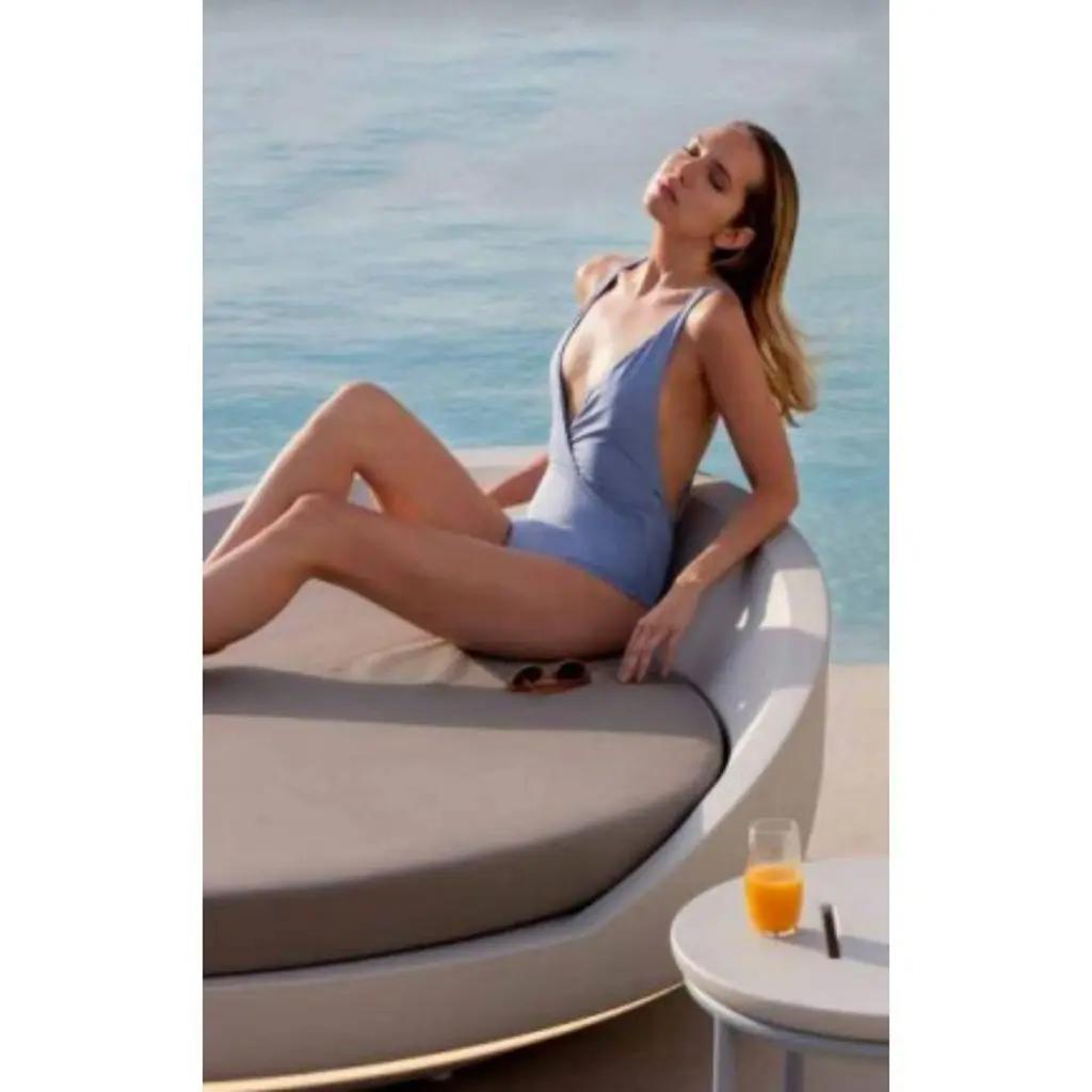 Lace burgundy daybed by MOWEEDimensions: D200 x W195 x H60 cm.Material: Polyethylene, stainless steel and polyester.Weight: 60 kgAlso available in different colors and finishes (lacquered). Optional wheel kit. Lace is a collection of furniture made by rotomoulding. Its shape resembles a swollen body that looks tightened by a loop and deforms to create a double volume. The distinguishing feature of the collection is the reduction of plastic volumes by incorporating metal structures into the design that lighten the visual weight of the pieces.Möwee is part of the work, effort and commitment of Gaviota, a leading company in the outdoor sector. It was set up as an independent venture to broaden horizons in the outdoor furniture world, with its own distinctive character and way of doing things. Freshness, simplicity, quality and design are at the heart of its DNA.