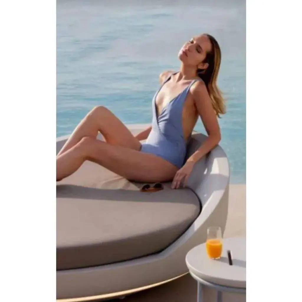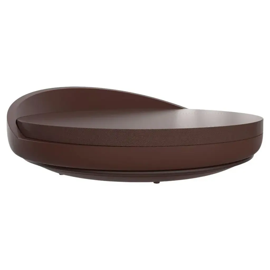 Lace chocolate daybed by mowee dimensions: d200 x w195 x h60 cm. Material: polyethylene, stainless steel and polyester. Weight: 60 kg also available in different colors and finishes (lacquered). Optional wheel kit. Lace is a collection of furniture made by rotomoulding. Its shape resembles a swollen body that looks tightened by a loop and deforms to create a double volume. The distinguishing feature of the collection is the reduction of plastic volumes by incorporating metal structures into the design that lighten the visual weight of the pieces.