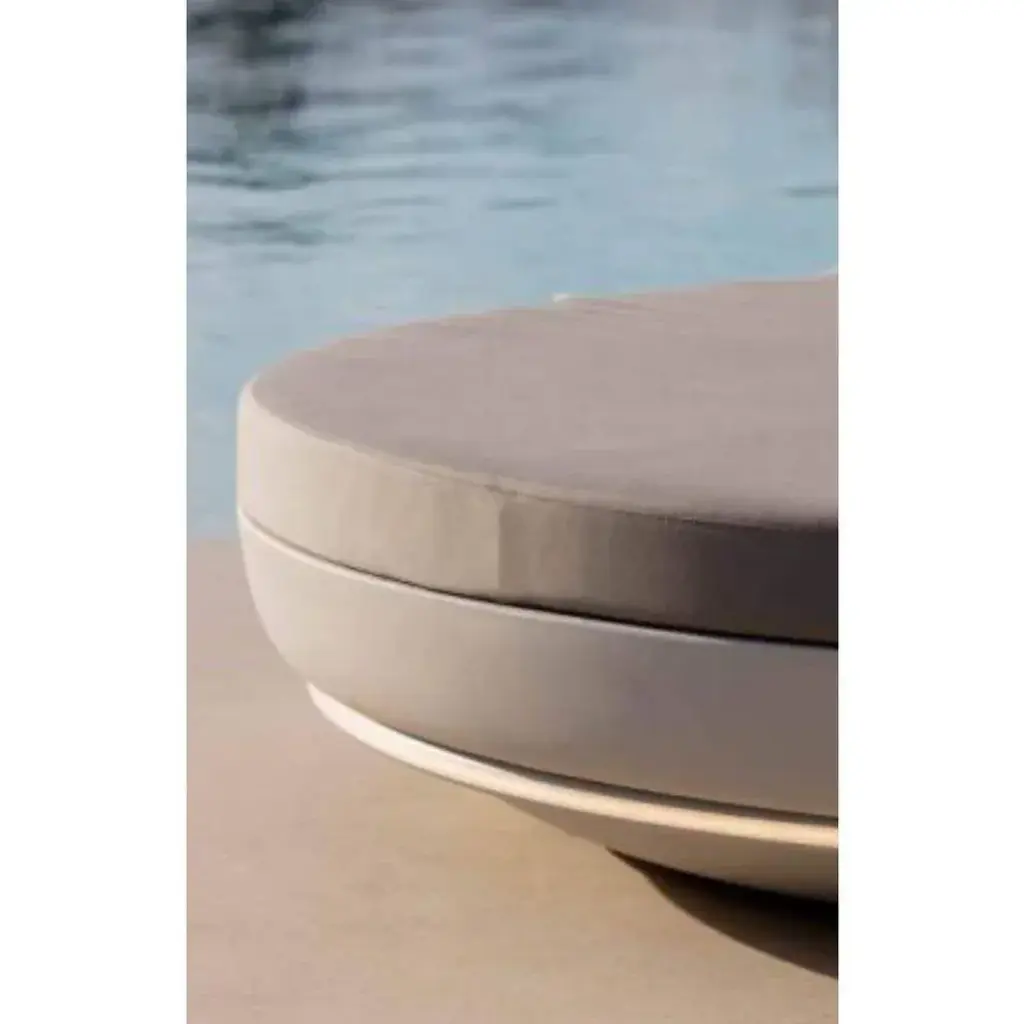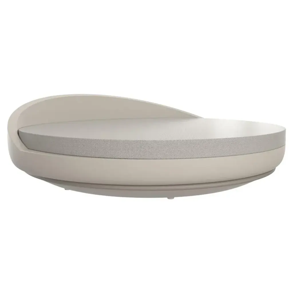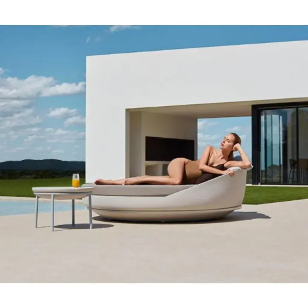 Lace cream daybed by mowee dimensions: d200 x w195 x h60 cm. Material: polyethylene, stainless steel and polyester. Weight: 60 kg optional wheel kit. Lace is a collection of furniture made by rotomoulding. Its shape resembles a swollen body that looks tightened by a loop and deforms to create a double volume. The distinguishing feature of the collection is the reduction of plastic volumes by incorporating metal structures into the design that lighten the visual weight of the pieces.