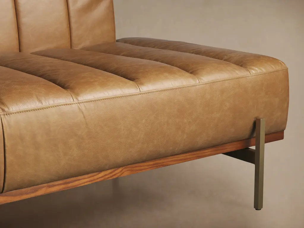 Crafted for exquisite comfort, our Lansing Collection features low-profile, open-ended designs. Top-grain leather seats and backrests are channel-stitched to create a plush, luxurious aesthetic, while the natural wood bases are accented with brass supports for added style and contrast.