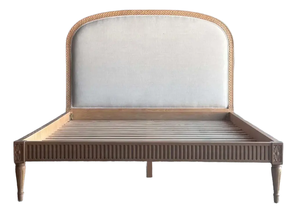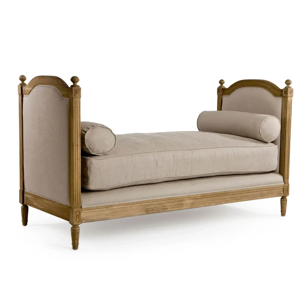 European influenced daybed upholstered in natural linen on natural oak frame.
