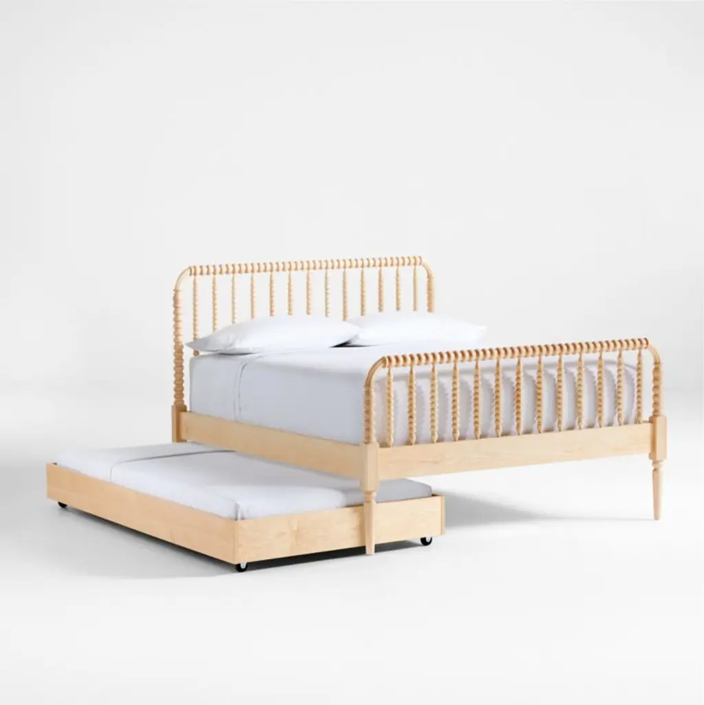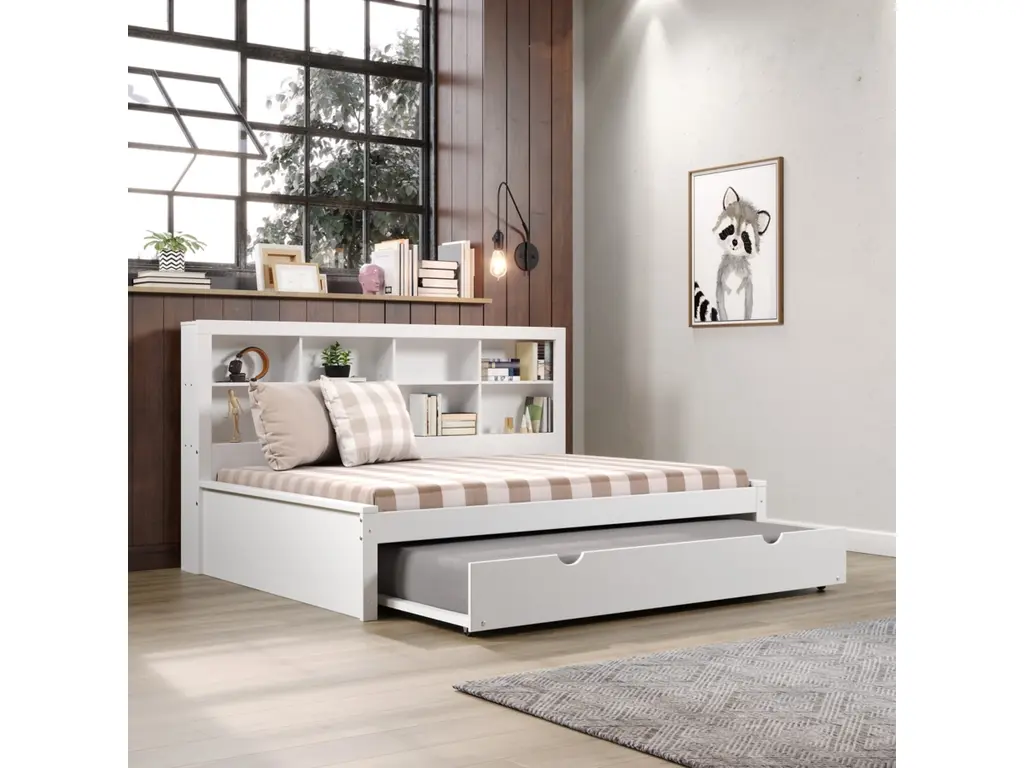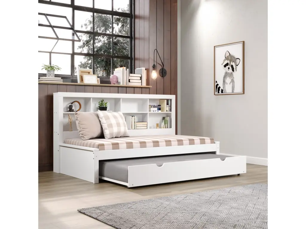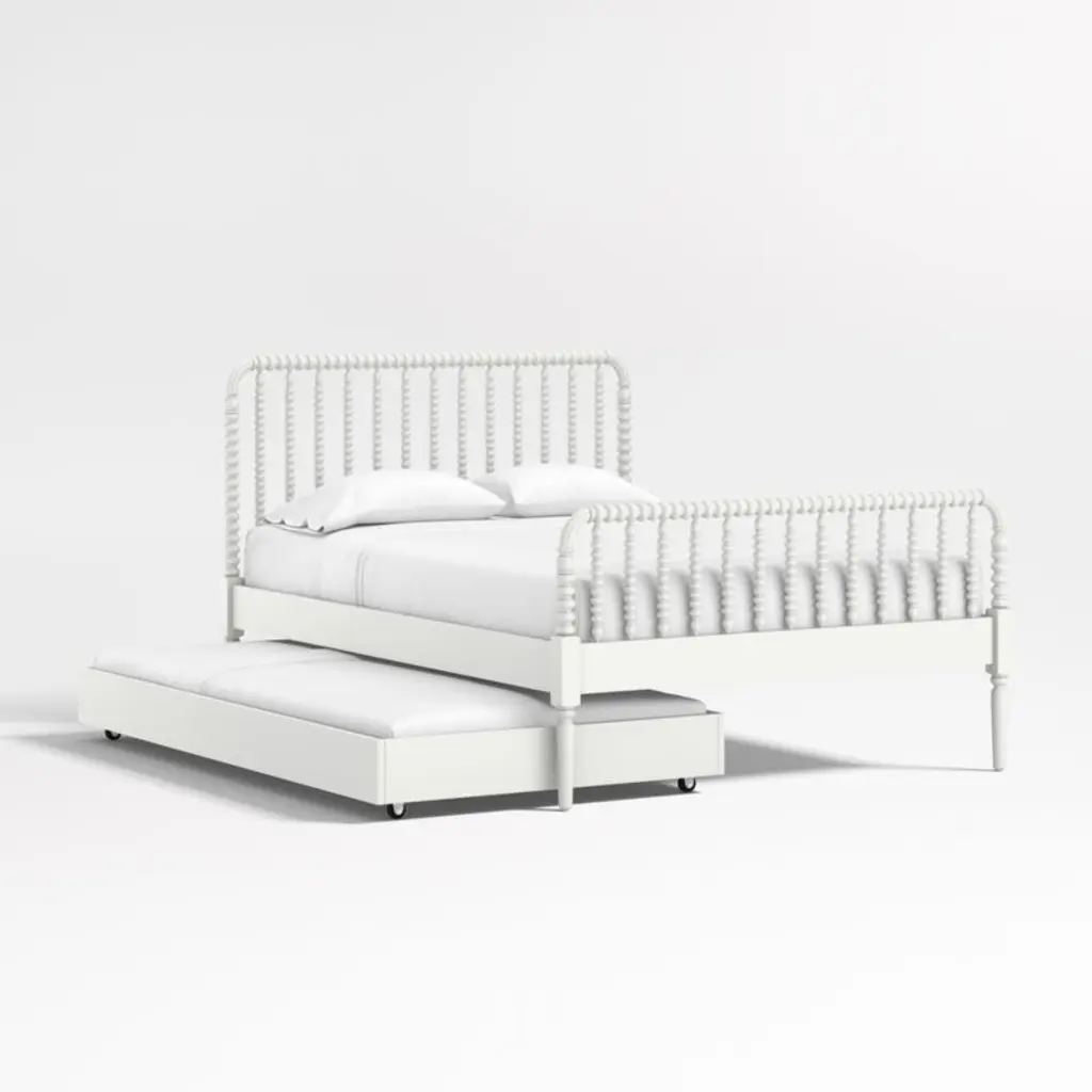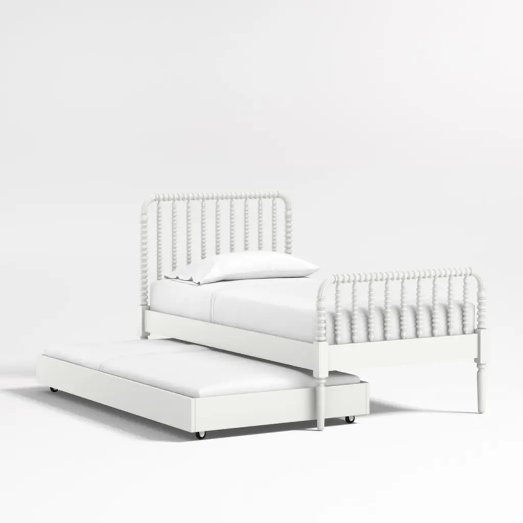 Classically styled for your traditional home, the Leoni twin daybed with trundle is offered in a white finish with accenting finials and turned metal connectors that complete the look of this daybed. The metal trundle provides additional sleep space to fit your needs.