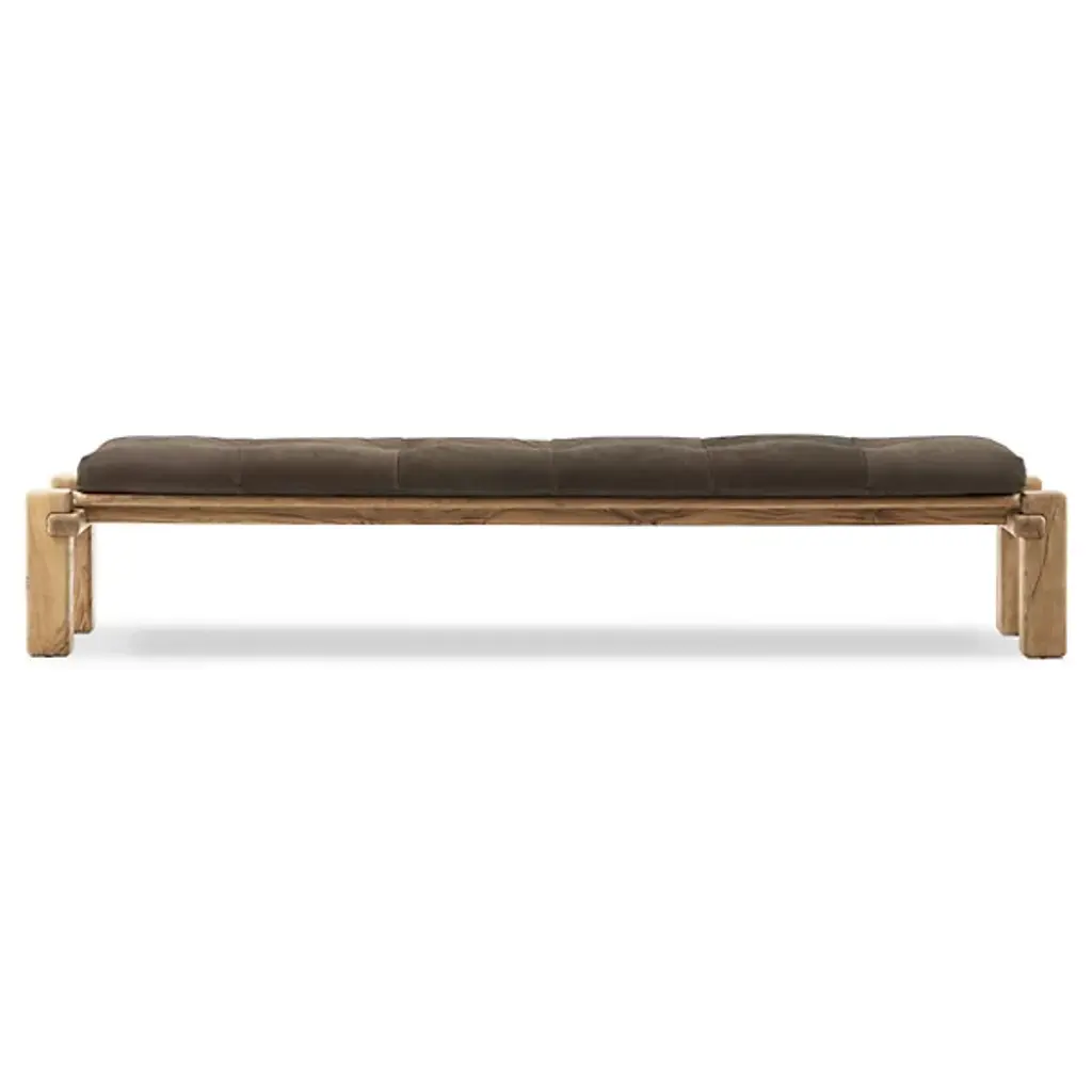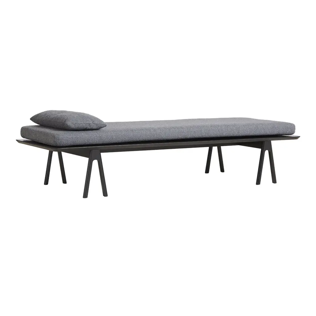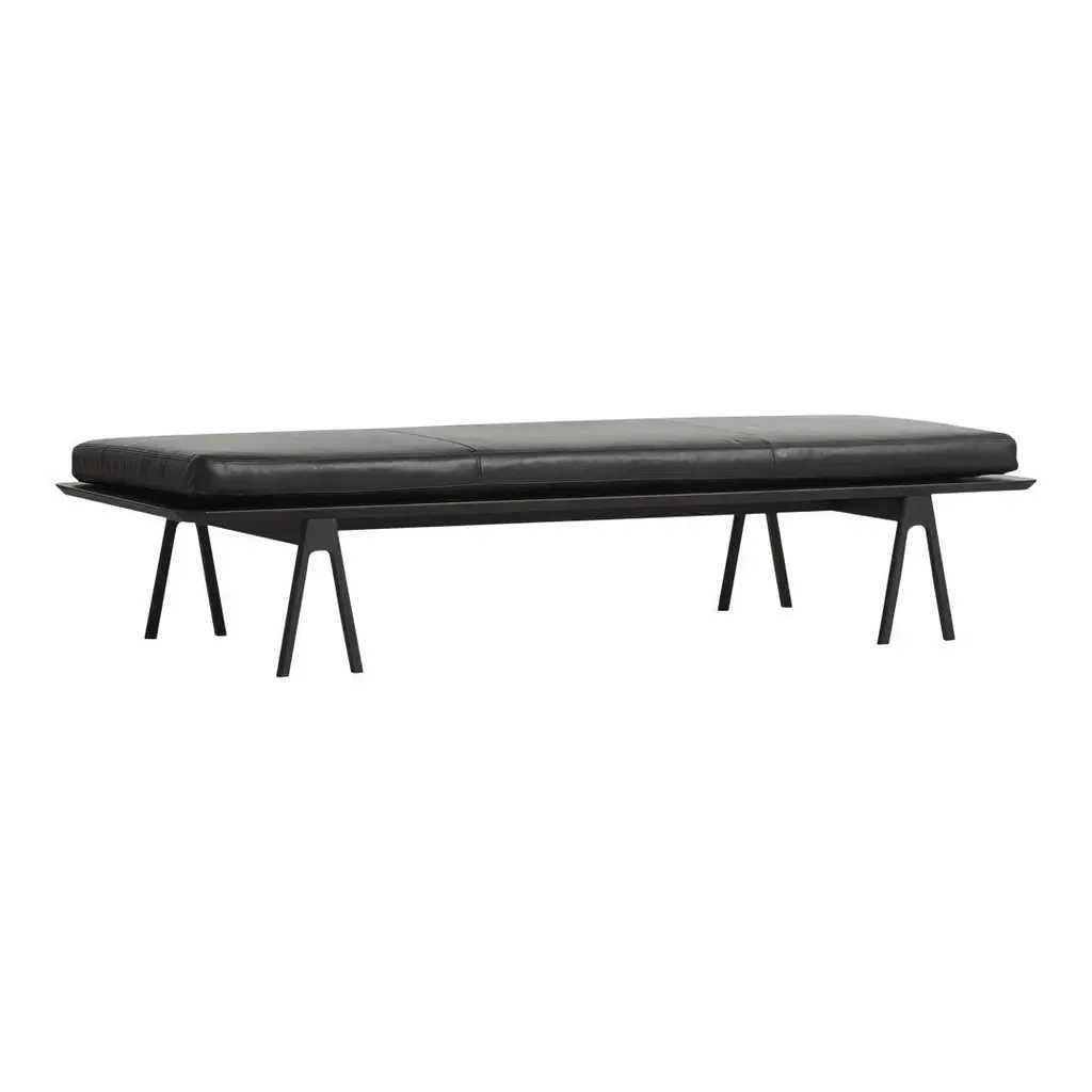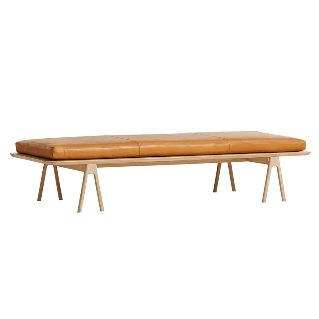 The Level daybed uses the iconic form of sawhorses in the simplest arrangement possible: A sheet laid across a pair toppen with a rectilinear mattress. The supple leather and the sturdy wood components elevate the simple whole. The daybed takes its name, Level, from a symmetry between the domestic and work environment; a generally sought-after condition. A pillow for the Level Daybed is available for purchase separately, here .
