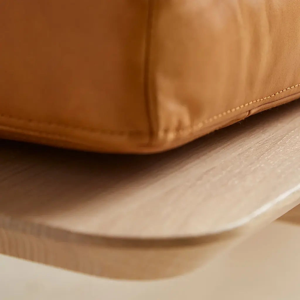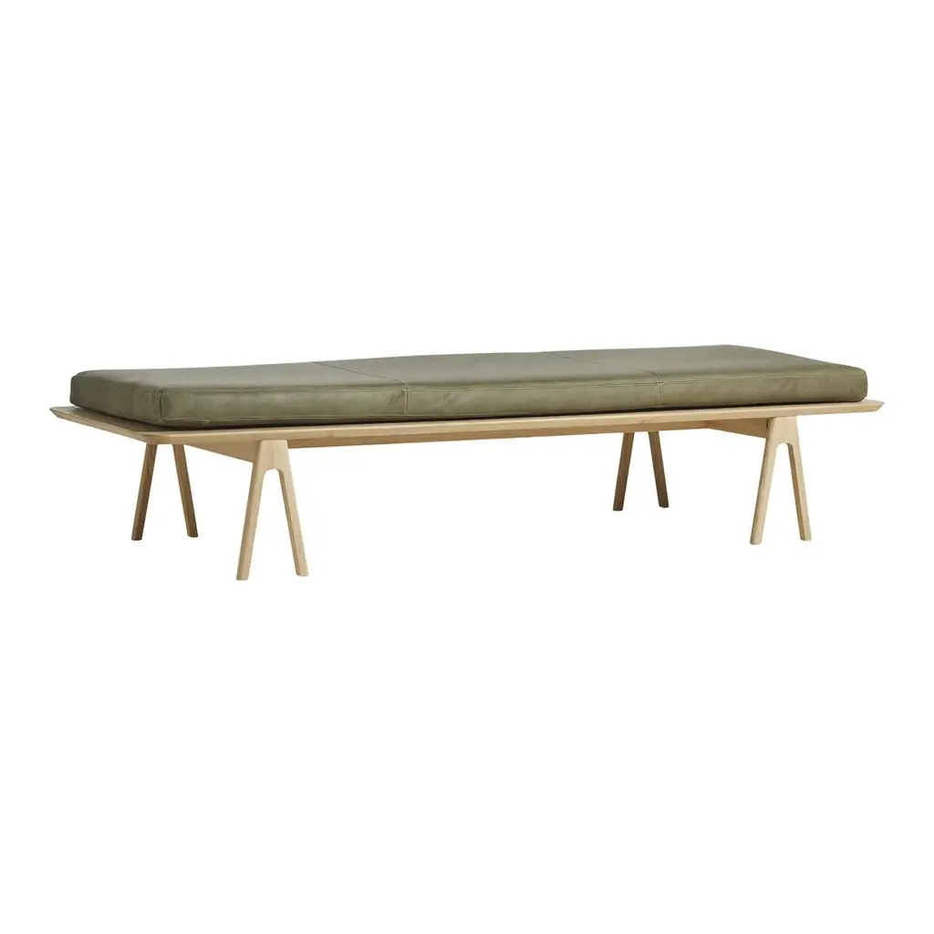 The Level daybed uses the iconic form of sawhorses in the simplest arrangement possible: A sheet laid across a pair toppen with a rectilinear mattress. The supple leather and the sturdy wood components elevate the simple whole. The daybed takes its name, Level, from a symmetry between the domestic and work environment; a generally sought-after condition. A pillow for the Level Daybed is available for purchase separately, here .