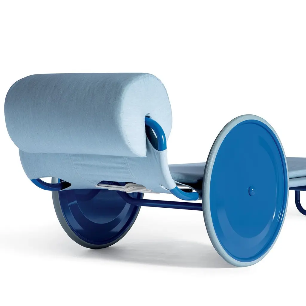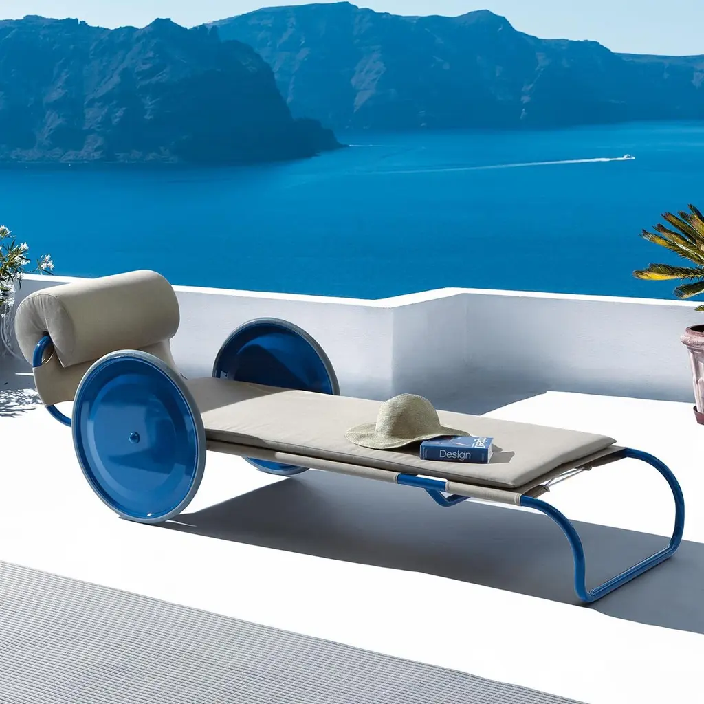 Echoing Gae Aulenti's architectural work and penchant for color, this sun lounger will help create a colorful atmosphere in a modern and eclectic garden, patio and pool area. Part of the iconic Locus Solus collection designed in 1964, the linear frame in tubular steel boasts a bright blue finish that matches the colorful fabric cover (removable) of the padded headrest and lounger, shown in an excursive abstract print and customizable in all Exteta's catalog fabrics on request. The two oversized wheels serve both as armrests and functional way to easily move the lounger around.